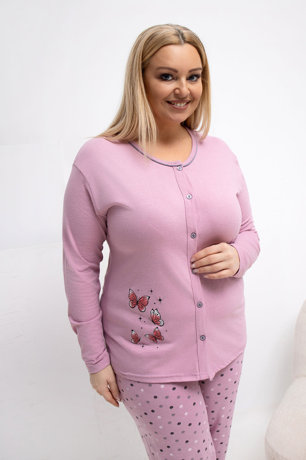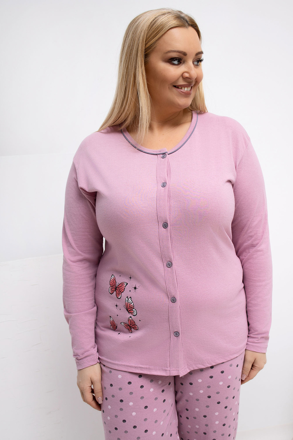 Pidžaama mõõdud XL suuruses, mõõdetud lamades: pluus: laius kaenla alt - 54 cm, varruka pikkus - 62 cm, kogupikkus - 74 cm, alaosa laius - 52 cm, püksid: vöökoha laius - 33 cm (lamades), vöökoha laius - 72 cm (venitatud), puusade laius - 57 cm, kogupikkus - 99 cm.