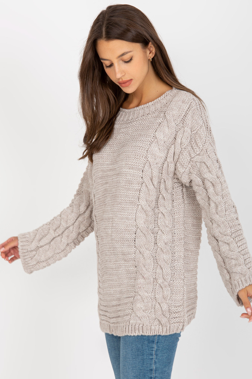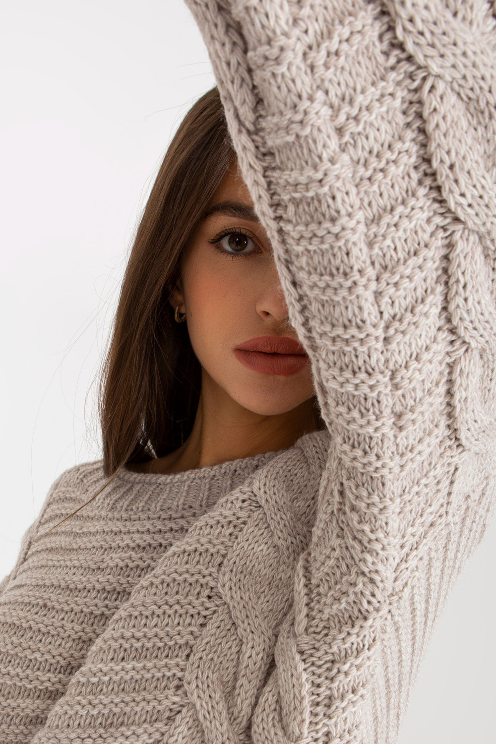 Liigasuurte palmikutega helebeež kampsun RUE PARIS . Tootekood: LC-SW-8044.06X domineeriv muster: sile Stiil: vabaaja üritus: vabaaja, linna peal, jalutama, tööle Mudel kannab suurust üks. Modelli mõõdud: kõrgus 172 cm, rind 88 c
