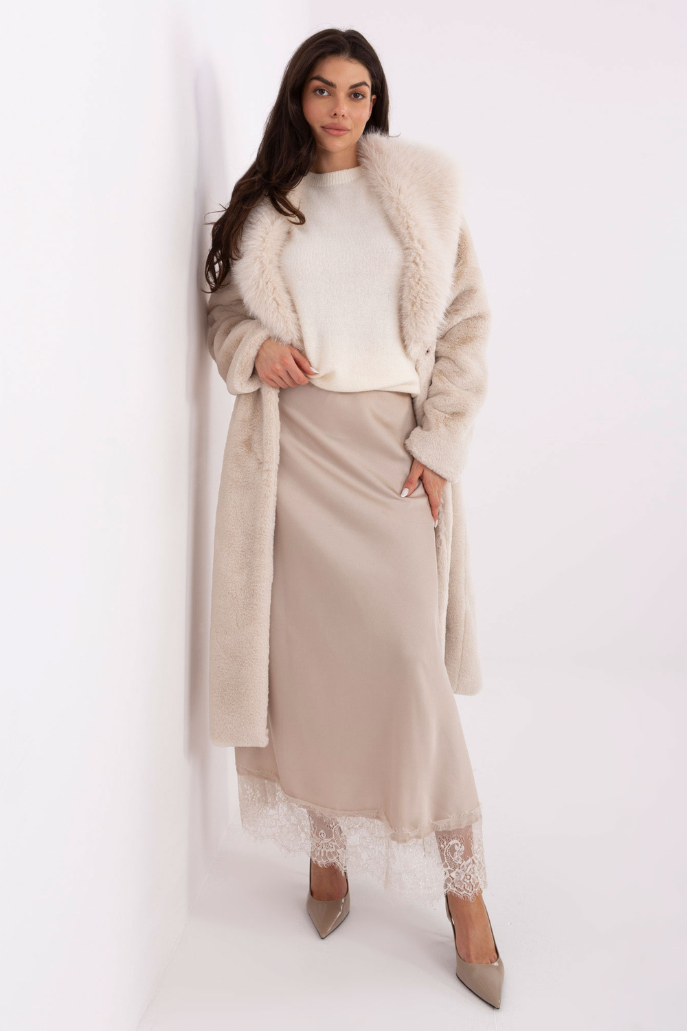 Model kannab üht suurust riiet. Modeli mõõtmed: pikkus 173 cm, rind 85 cm, vöö 62 cm, puusad 95 cm.