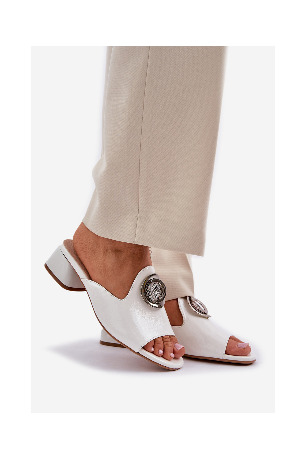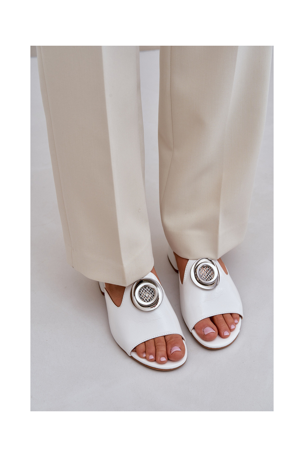 Valged elegantsed naiste sussid madala kontsaga ornamentidega "Feledis"