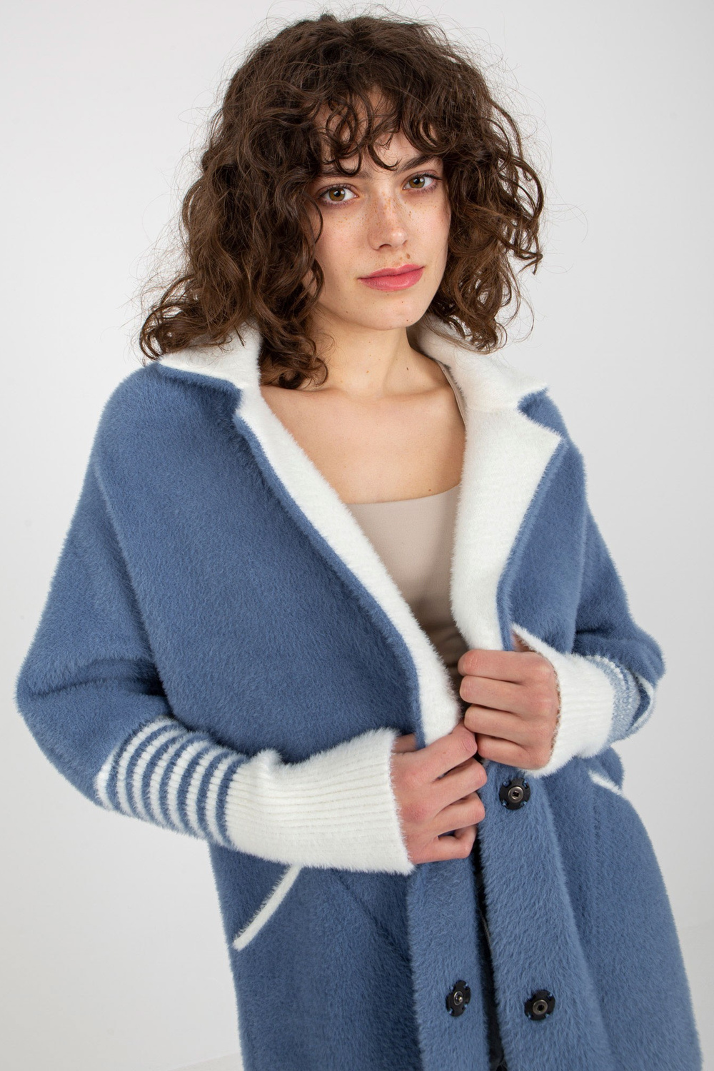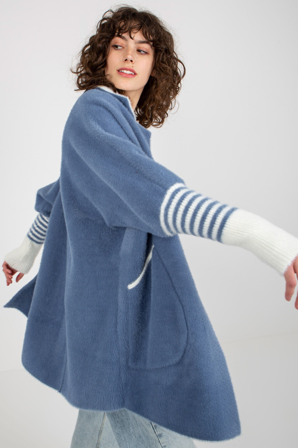 Taskutega tumesinine naiste alpakamantel.