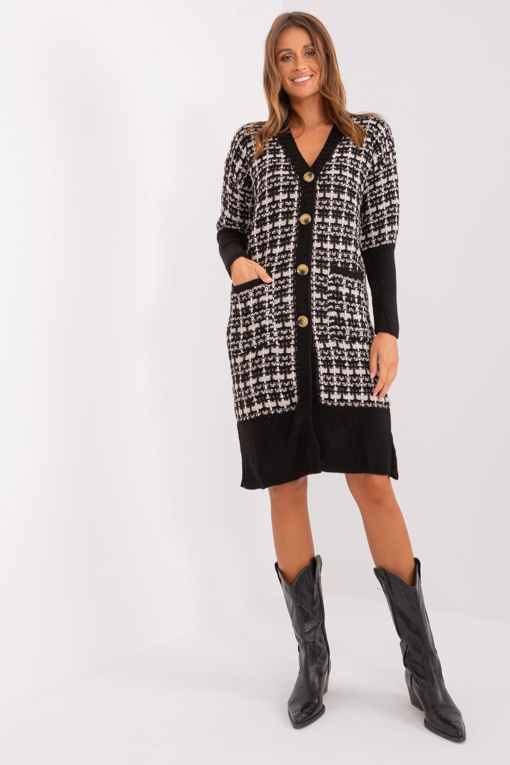 Kardigani mõõdud suuruses one, mõõdetuna tasaseks: laius kaenla alt - 68 cm, varruka pikkus - 64 cm, kogupikkus - 104 cm.