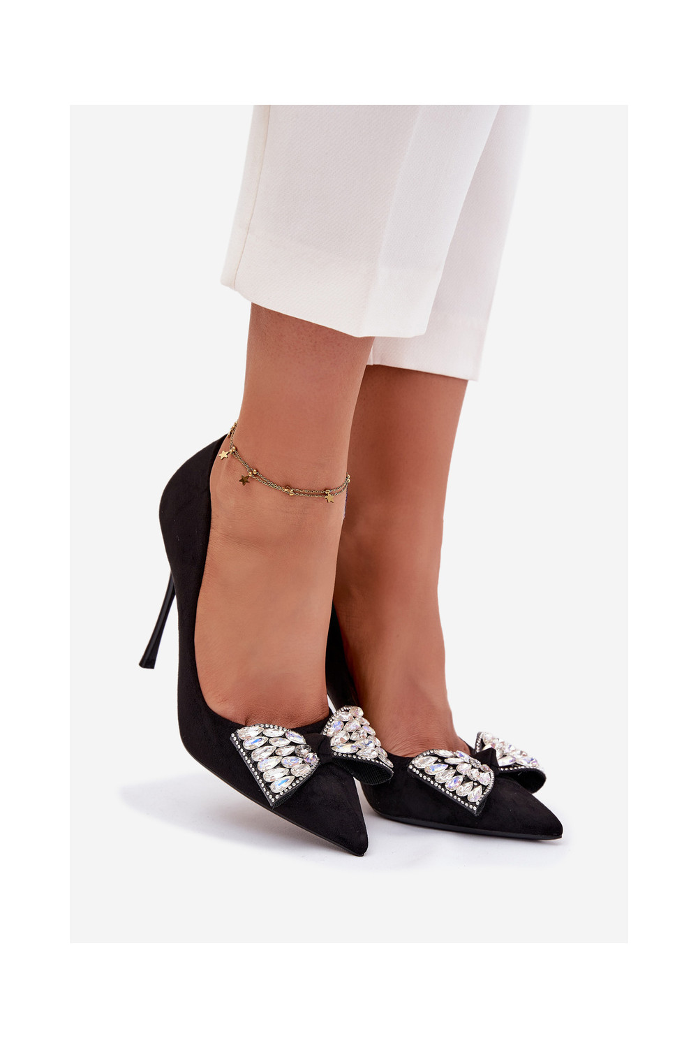 Kõrge kontsaga kingad paelte ja kristallidega, musta värvi Turirivine