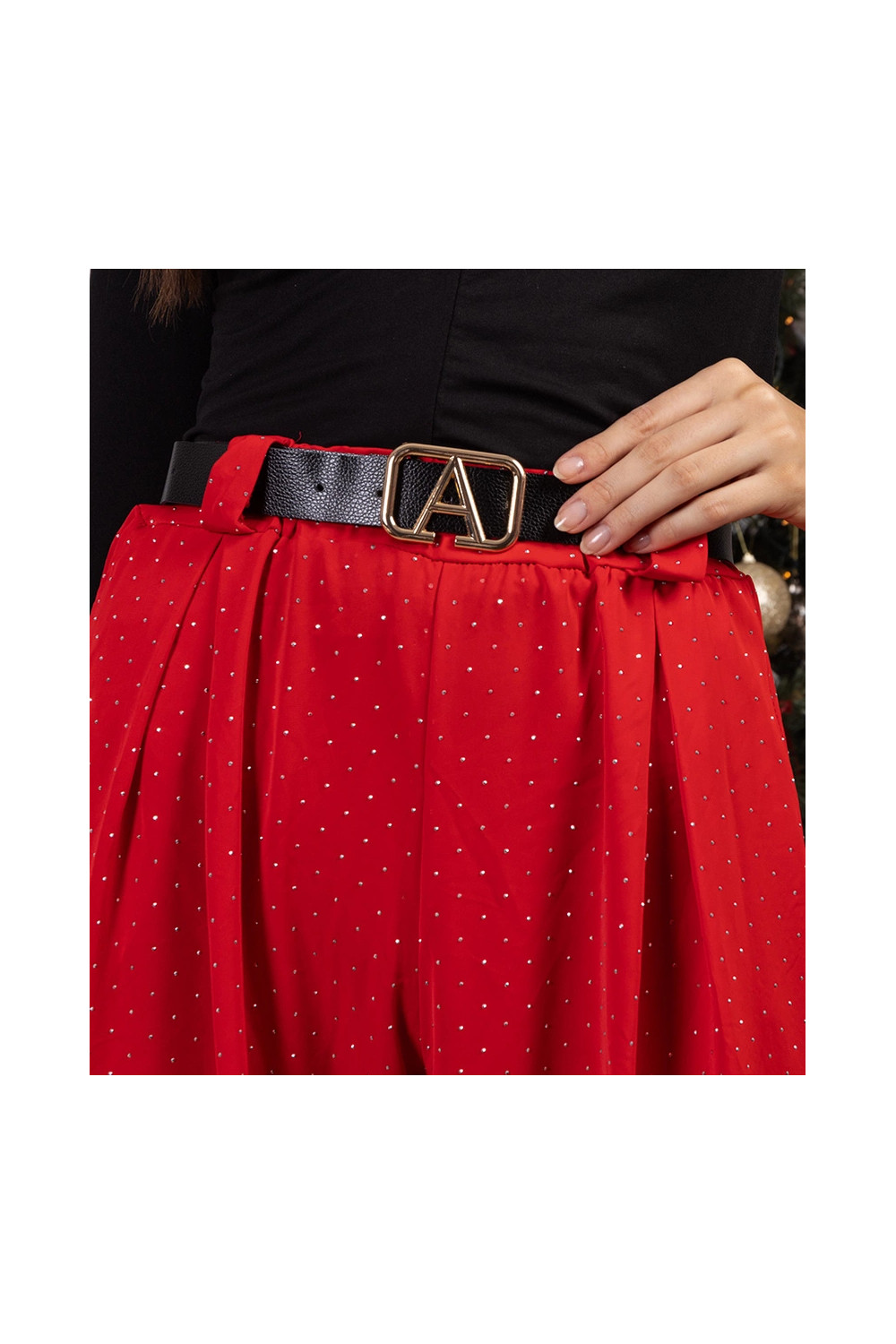 Punased vabad püksid, mis on kaunistatud Hira tsirkoonidega