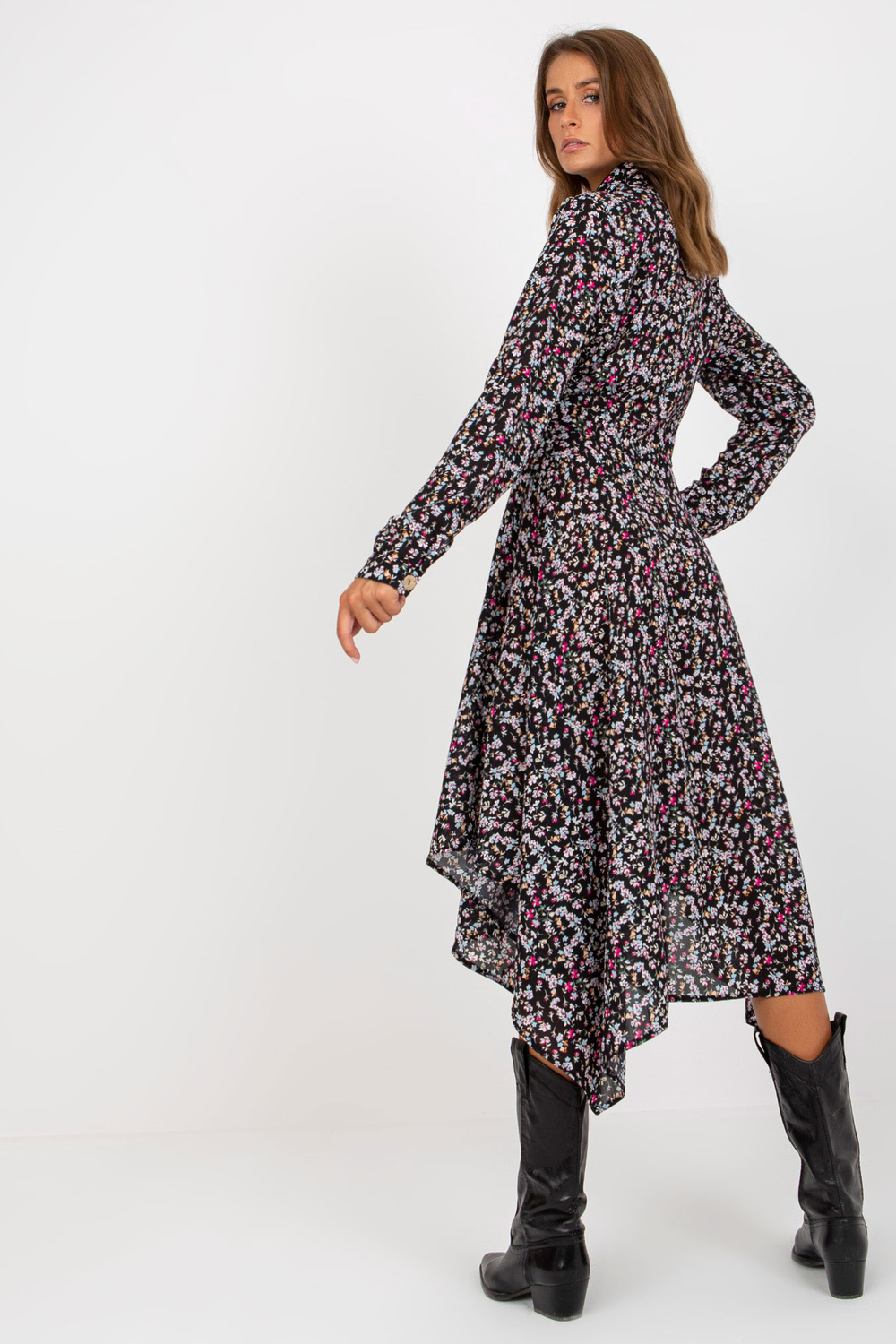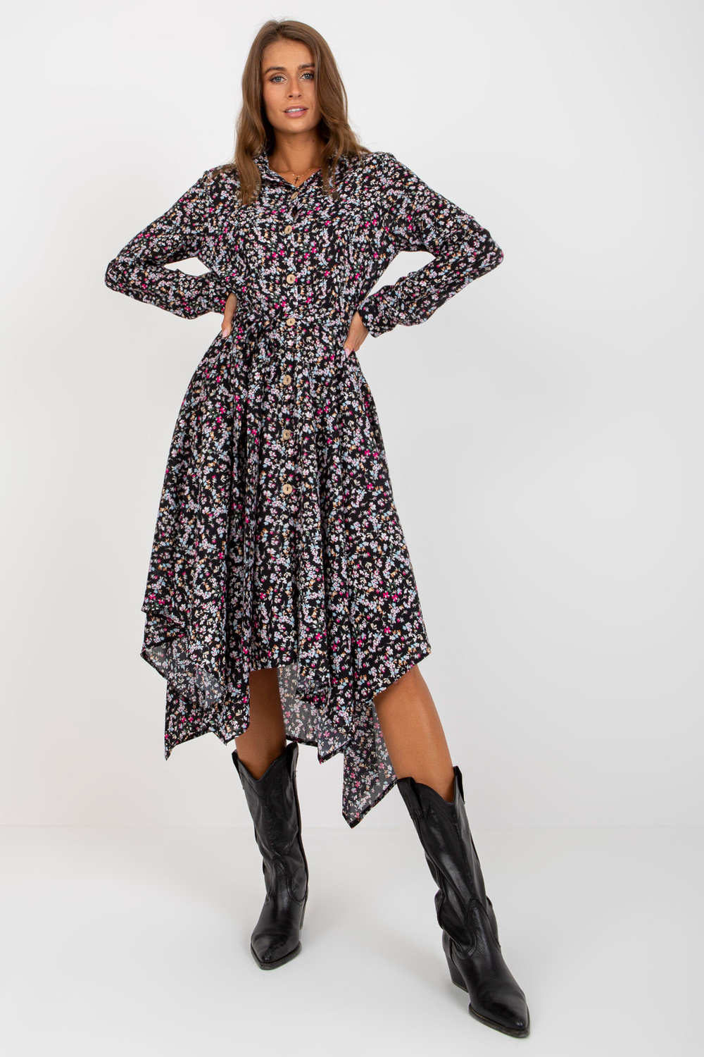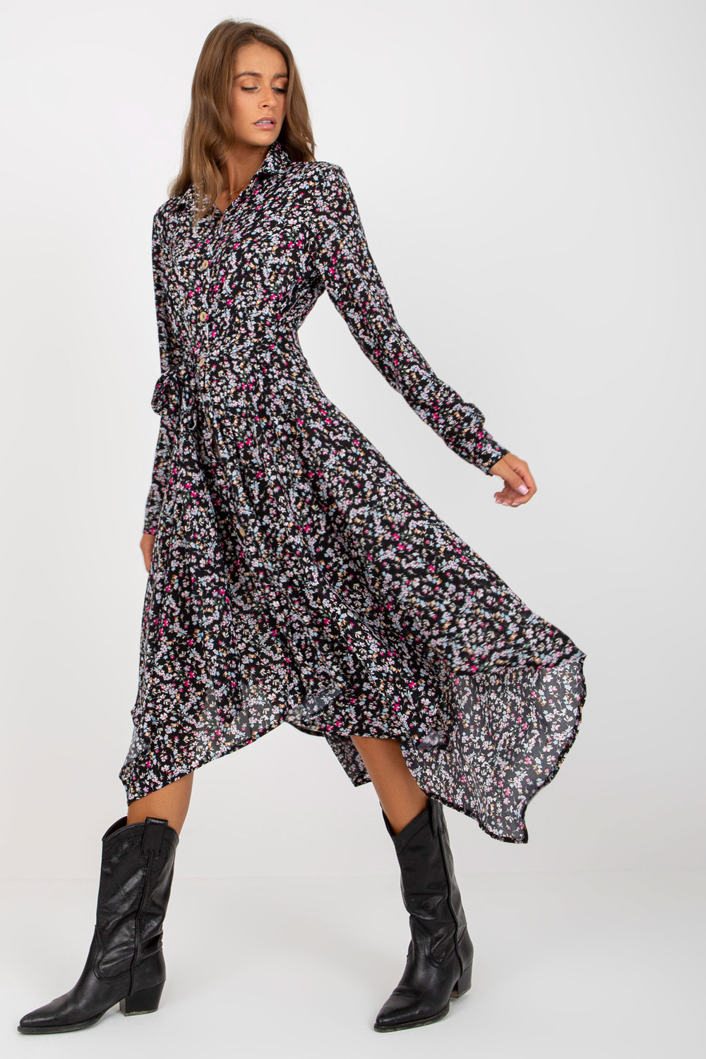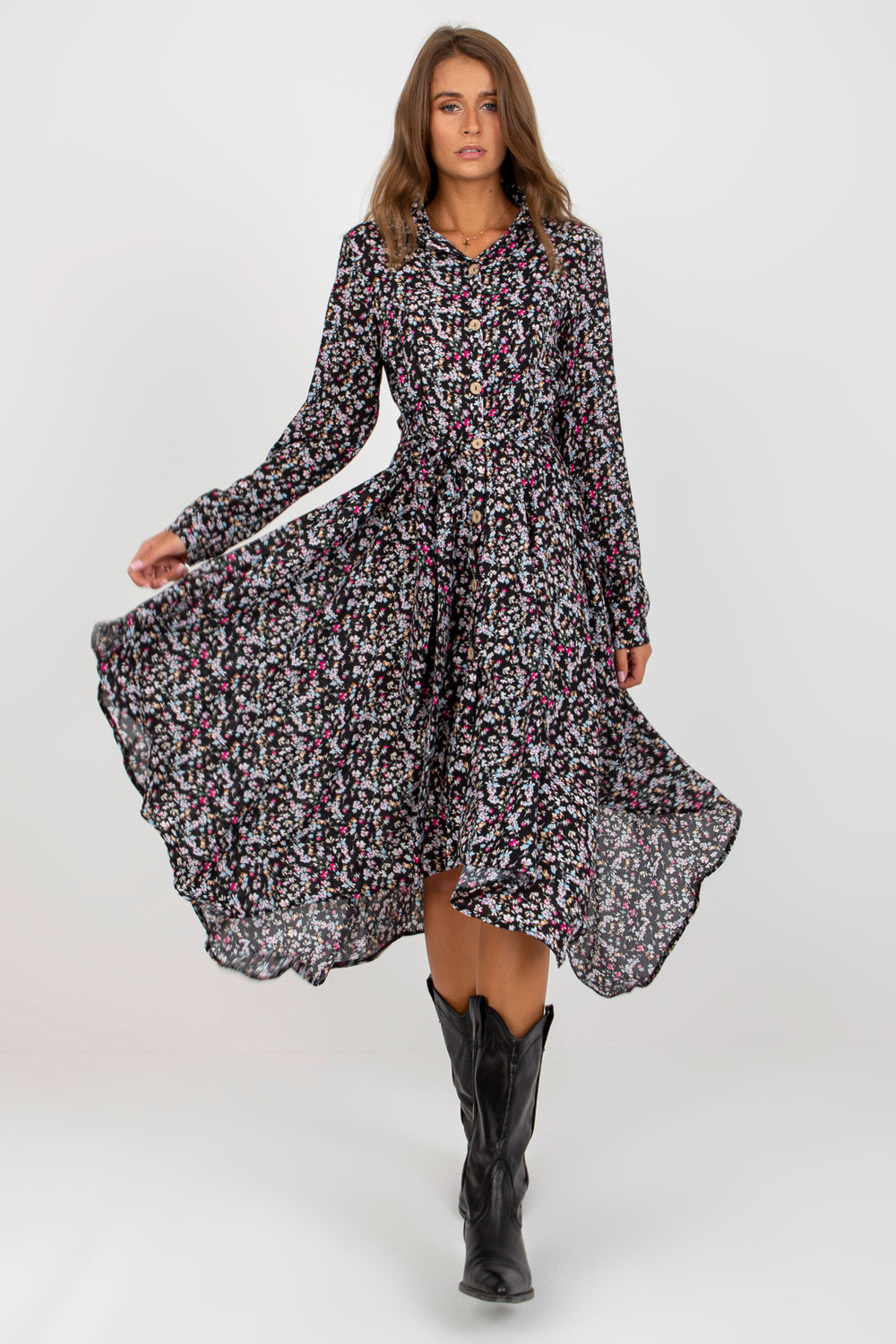 Must sümmeetriline lilleprintidega kleit RUE PARIS. materjal koostis: polüester, viskoos pesumeetod: masinpestav temperatuuril 40°C Tootekood: CHA-SK-0445-3.67P domineeriv muster: lilled Stiil: vabaaja üritus: vabaaja, linna peal, jalutama, to