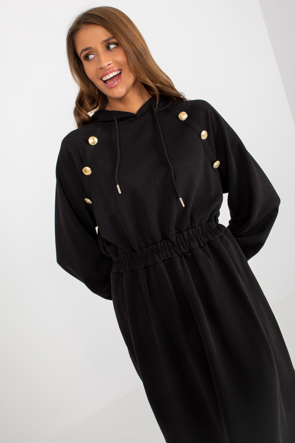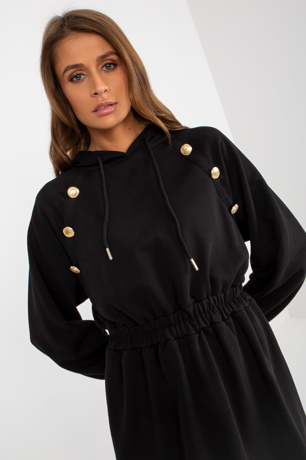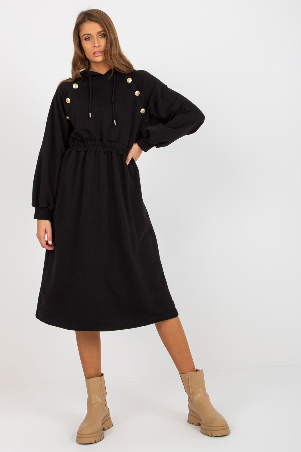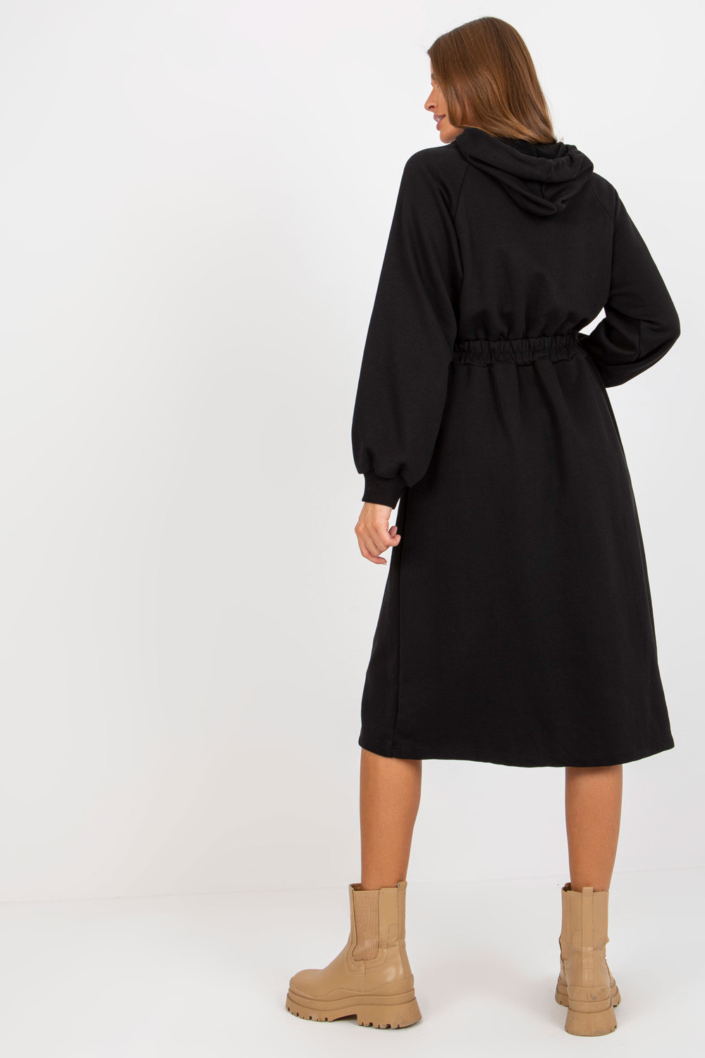 Schwarze Midi-Trainingskleid aus Baumwolle Tootekood: RV-SK-8336.12P dominantes Muster: glatt Stiil: lässig Anlass: lässig, in der Stadt, spazieren gehen Das Model trägt eine Einheitsgröße. Maße des Models: Höhe 176 cm, Büste 85 cm, Taille 64 cm, Hüfte 9