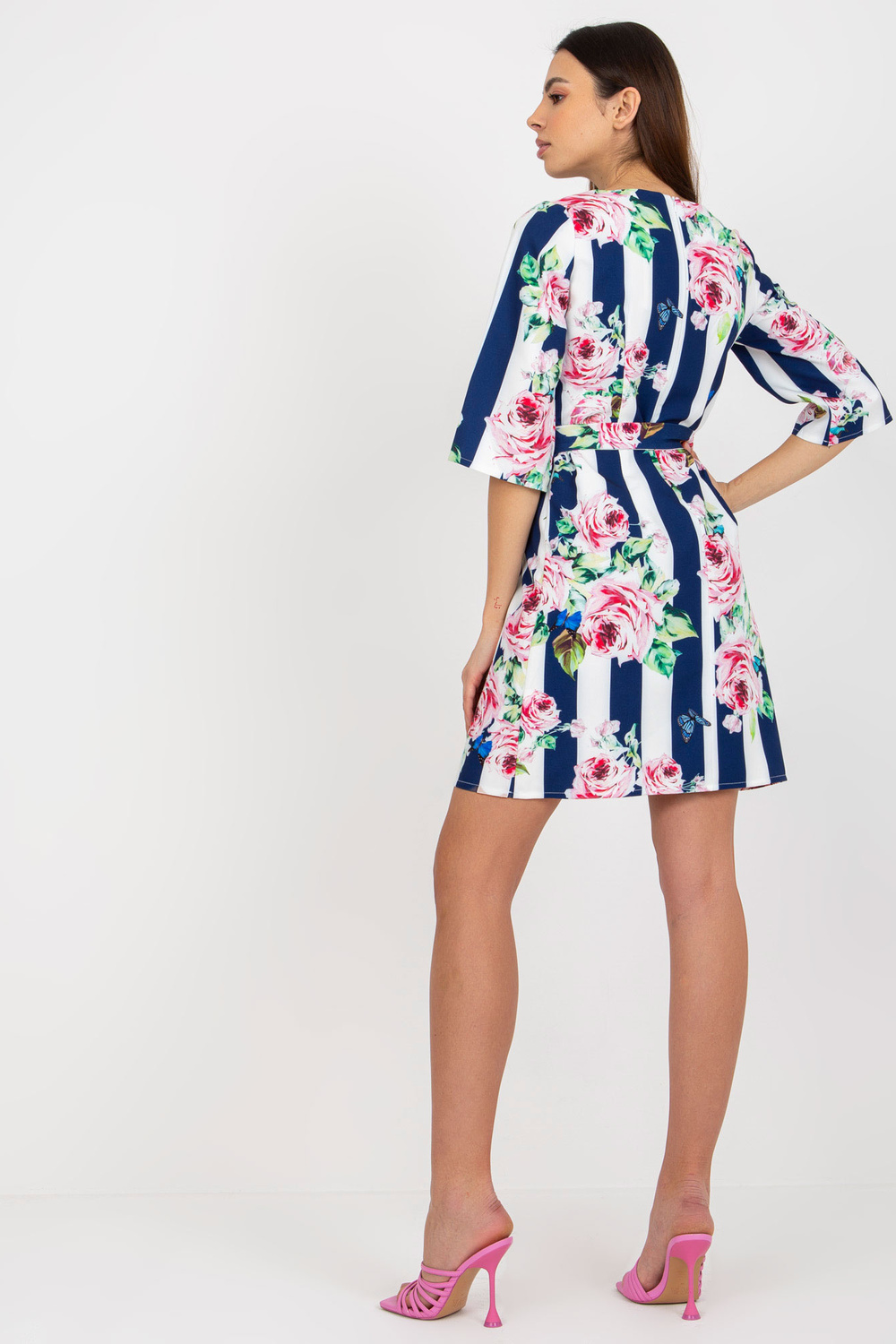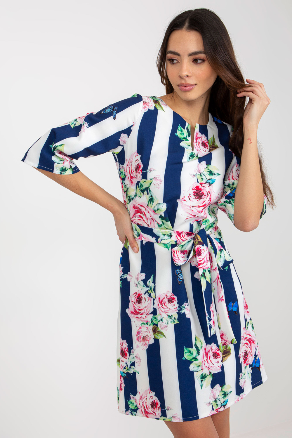 Valge ja tumesinine lillede ja triipudega kokteilikleit.