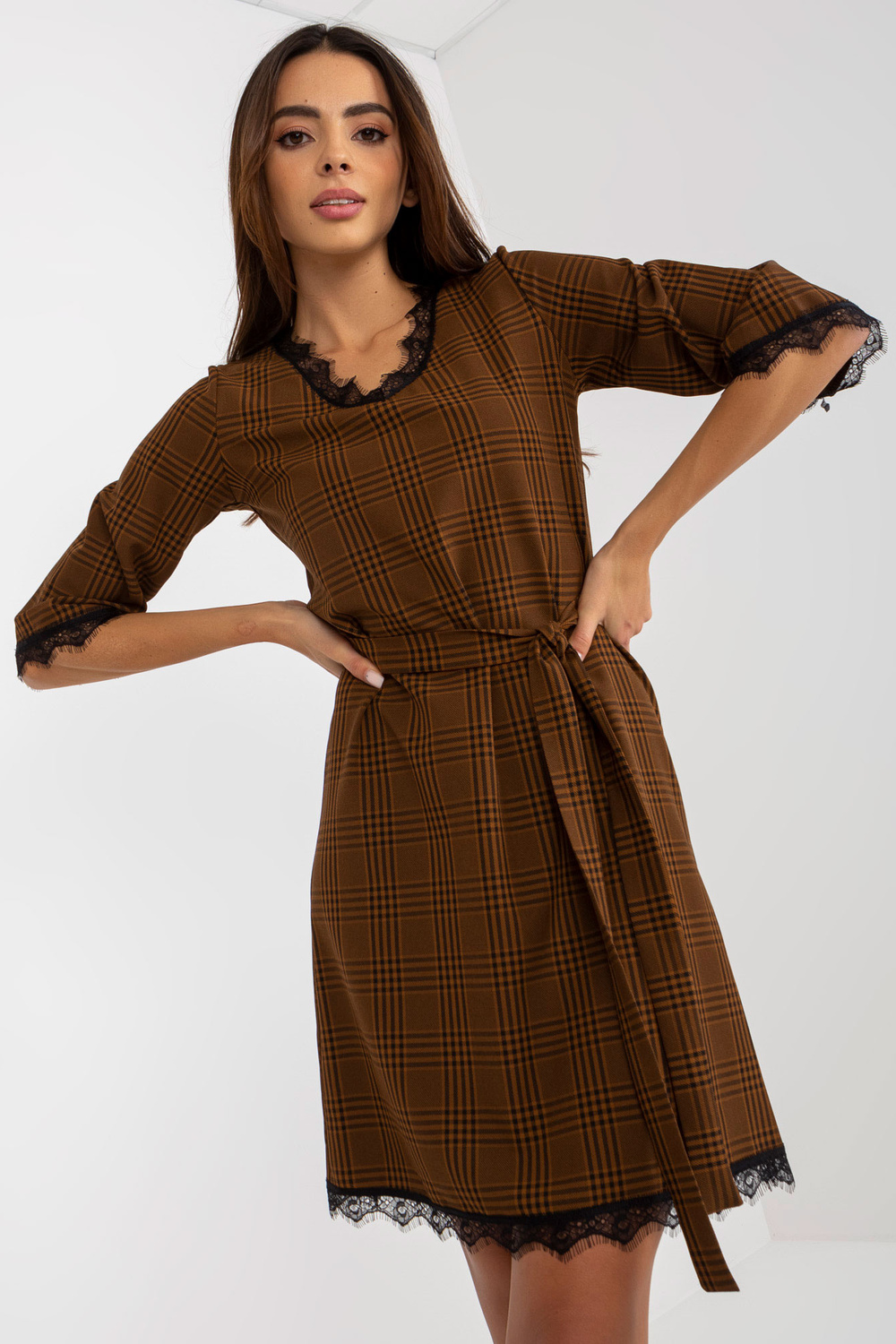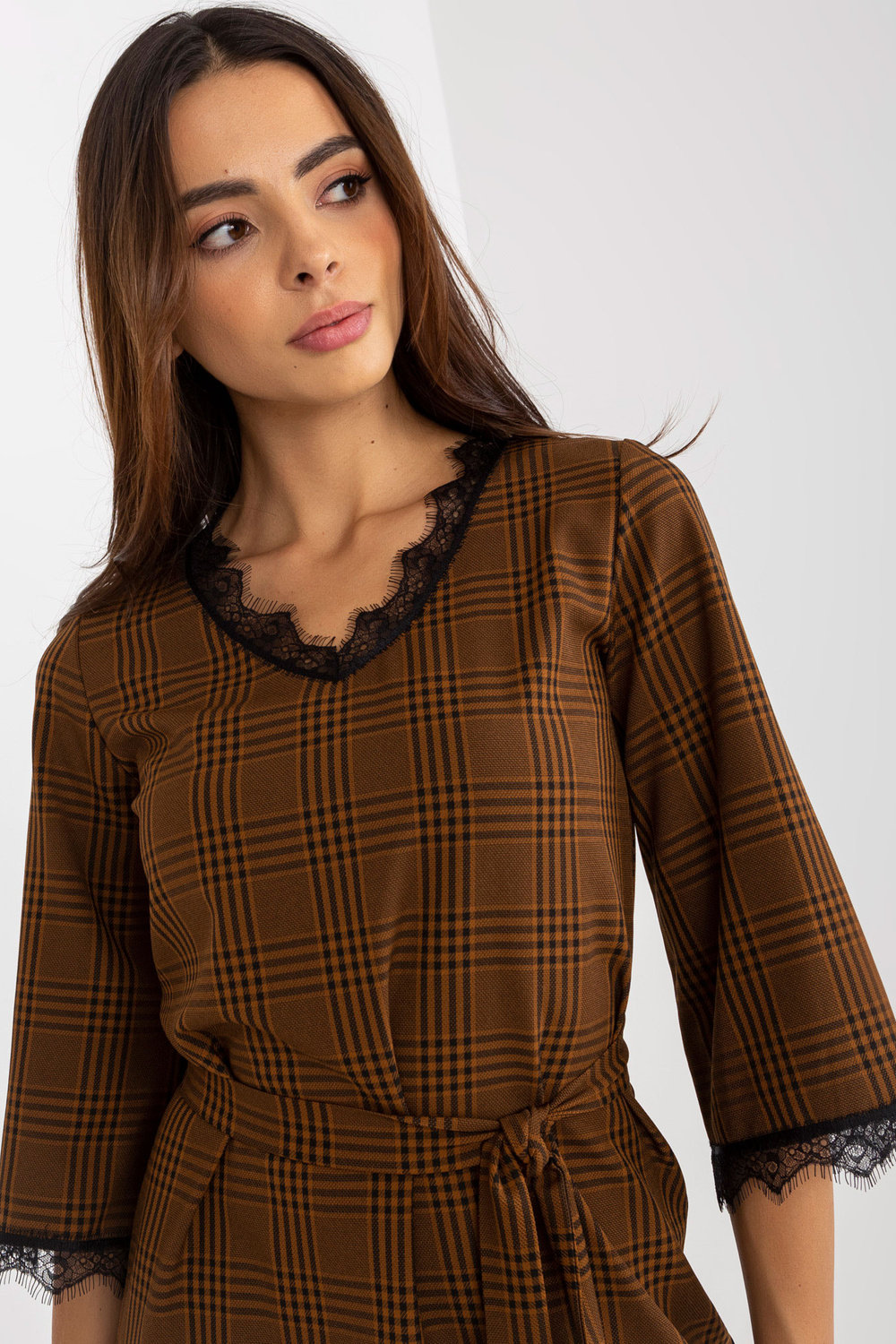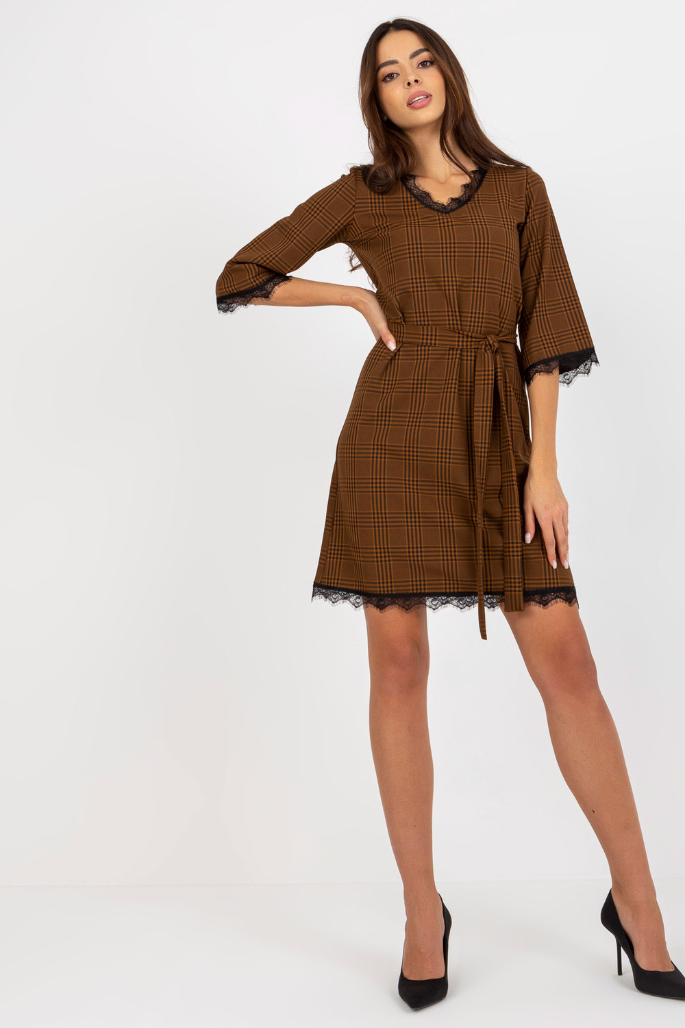 Hellbraunes und schwarzes karjääritegelased Cocktailkleid mit Spitze.