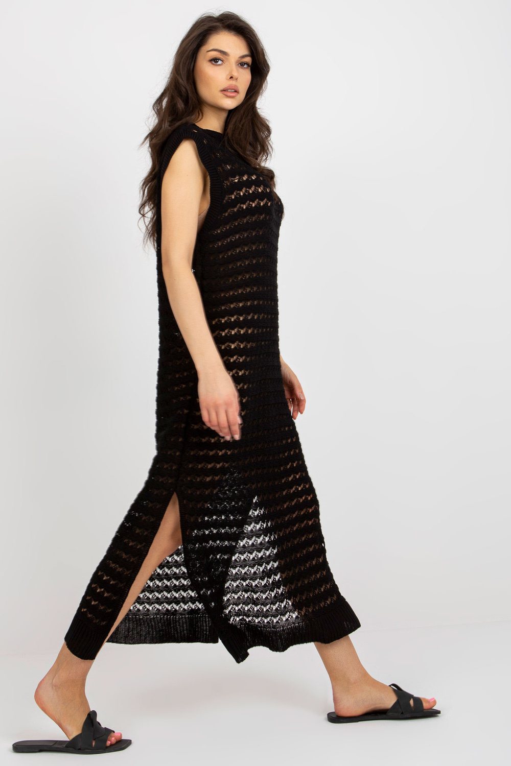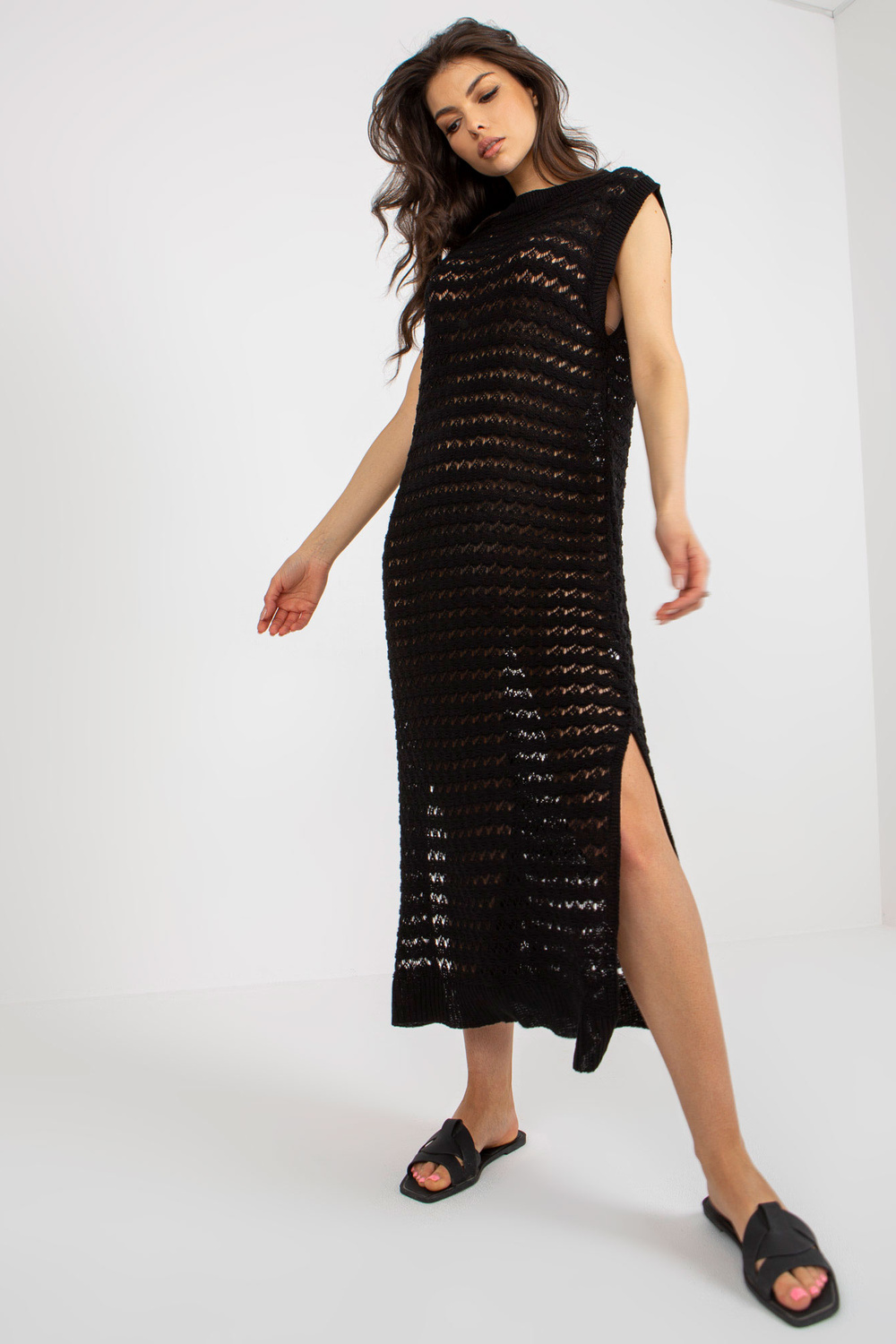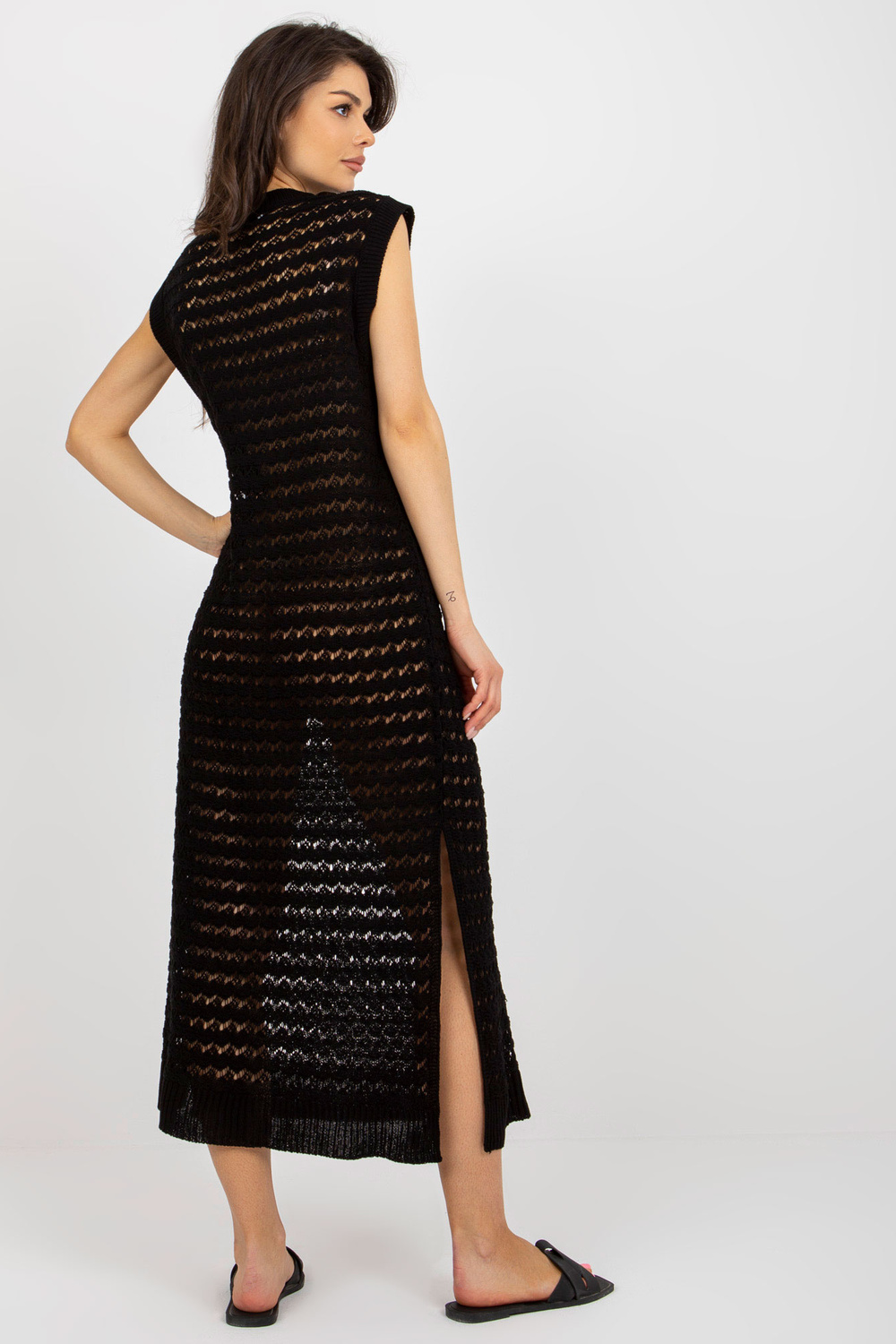 Must lõhikutega kootud rannakleit. Tootekood: BA-SK-9003.47P Domineeriv muster: ažuurne Stiil: vabaaja üritus: iga päev, suveks Modell kannab suurust one. Modelli mõõdud: kõrgus 173 cm, rind 85 cm, vöö 62 cm, puus 95 cm. Dimensi