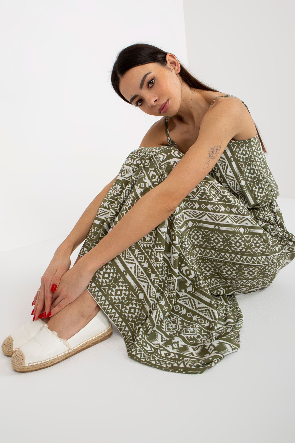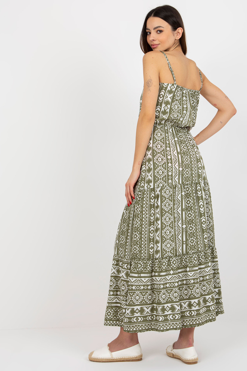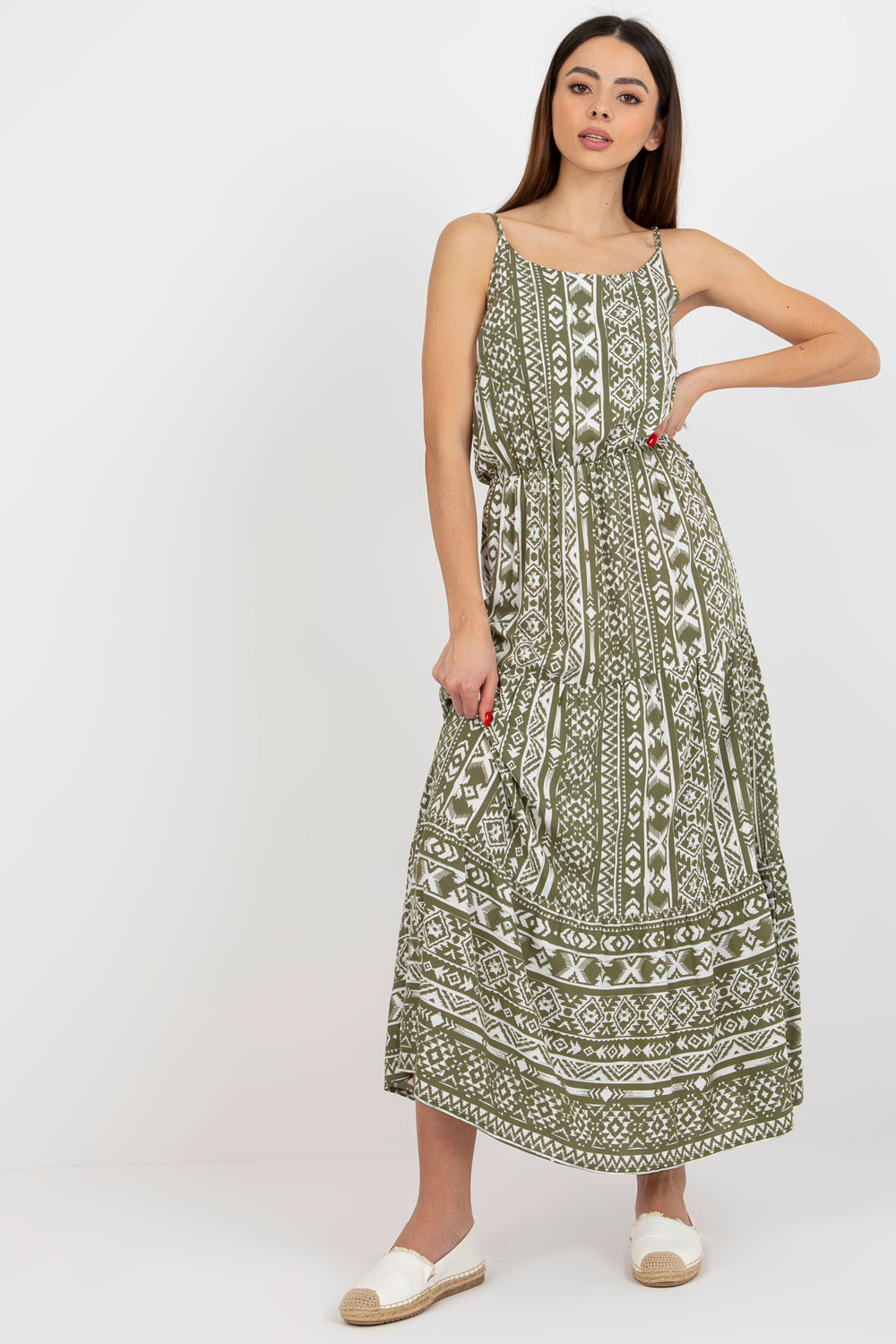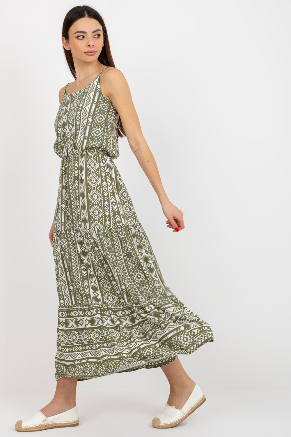 Alataseme khakivärvi maksikleit on ideaalne valik kevadsuvisteks väljasõitudeks. Intensiivne print koos volangidega loob suurejoonelise boho välimuse. Kleidil on pikk, liibuv varrukas ja õrnalt laienev alläär. Modell esitleb kleiti suuruses S, selle mõõdud on kõrgus 175 cm, rind 84 cm, vöö 62 cm, puus 91 cm. Kleidi kaenlaaluse laius on tasapinnaliselt mõõdetuna 42 cm ja kogupikkus 146 cm. Selline kleit sobib igaks päevaks, jalutuskäiguks, linnas ja suveks. Ideaalne valik naistele, kellele meeldib kevadine ja suvine välimus!