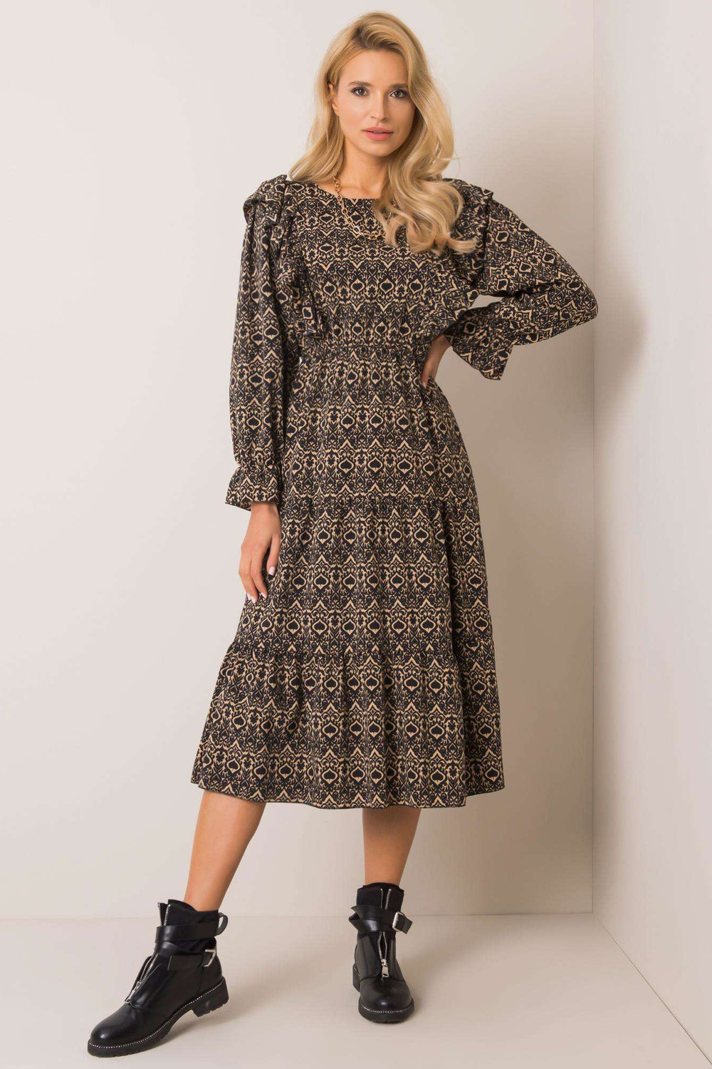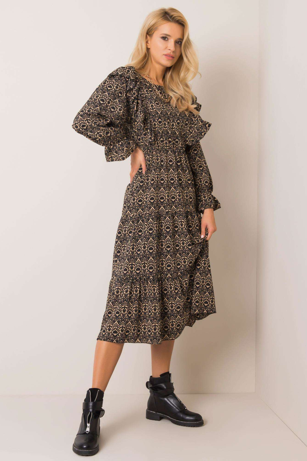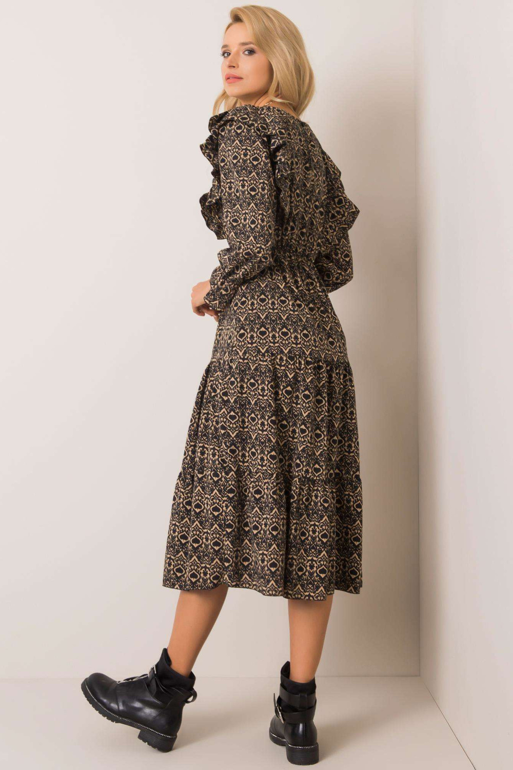 Reese must-beež kleit. tarvikud: kummipael vöökohal, nööpkinnisus kaelas materjal koostis: 95% polüester, 5% elastaan pesumeetod: masinpesu 30°C Mudel kannab suurust one. Modelli mõõdud: kõrgus 175 cm, bu
