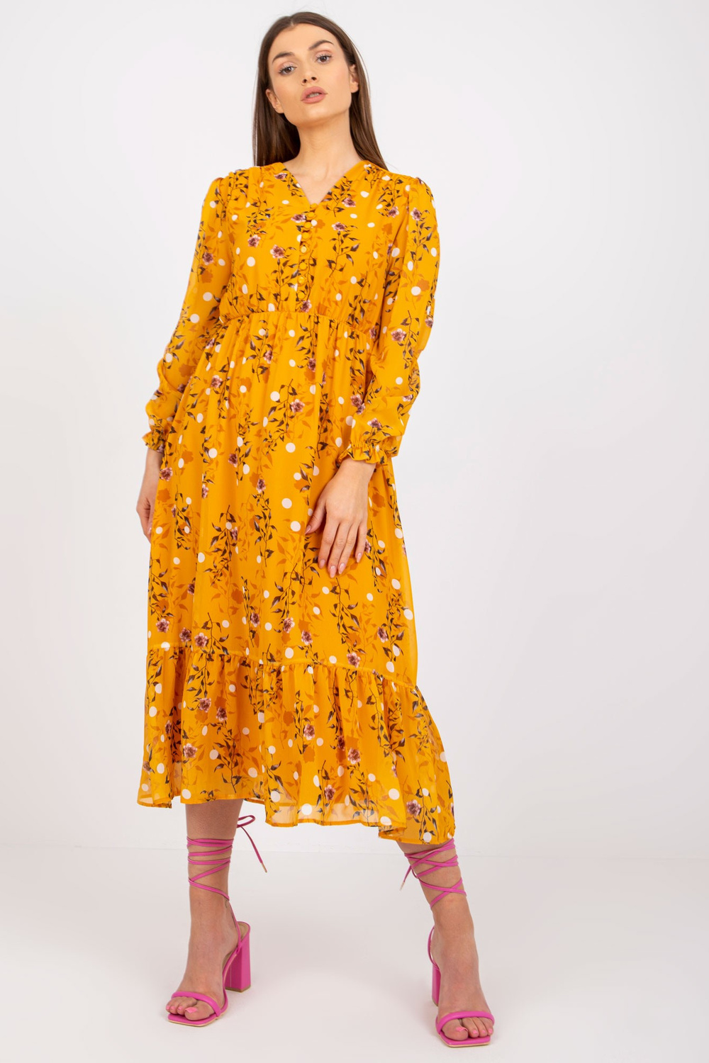 Tumekollane trükiste ja volangidega midikleit RUE PARIS. materjali koostis: 95% puuvill, 5% polüester pesumeetod: masinpesu 30°C Tootekood: RO-SK-ELB-2309.98 domineeriv muster: lilled Stiil: linna stiilis sündmus: vabaaja, linna, da