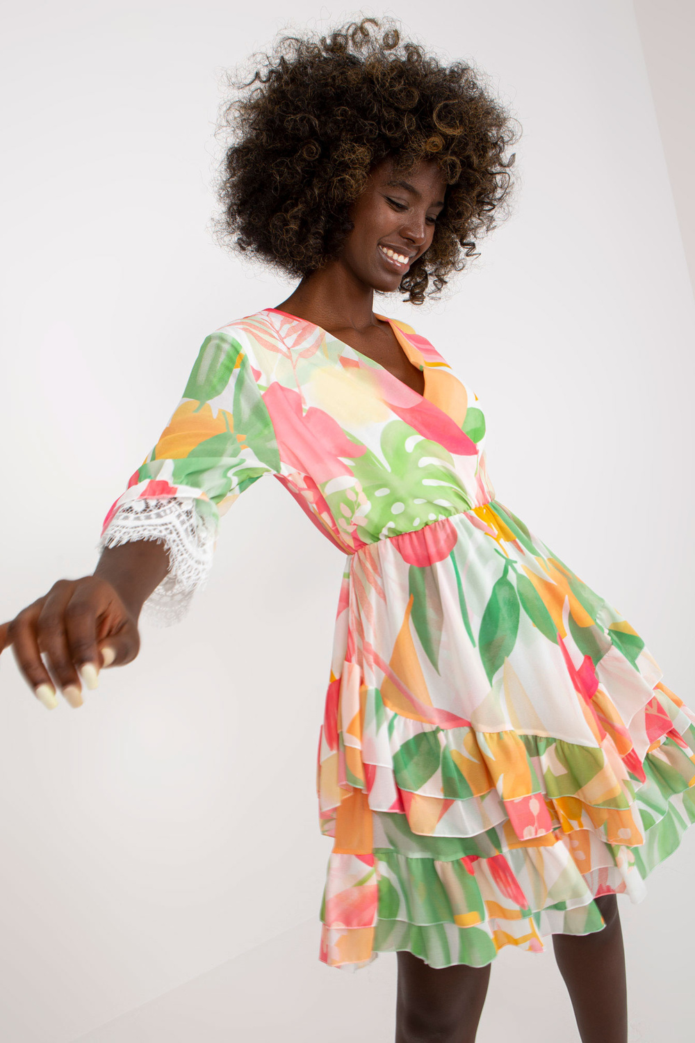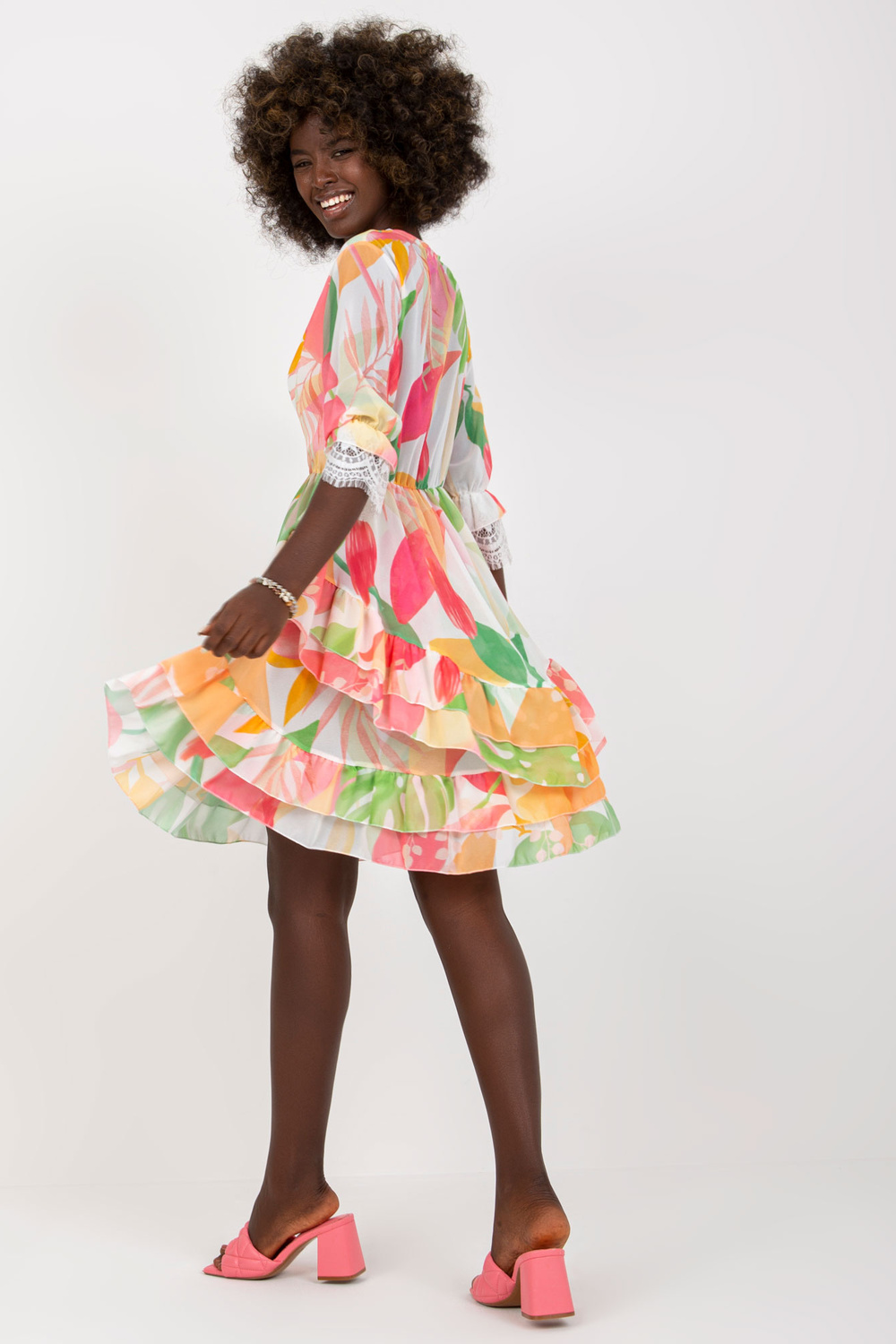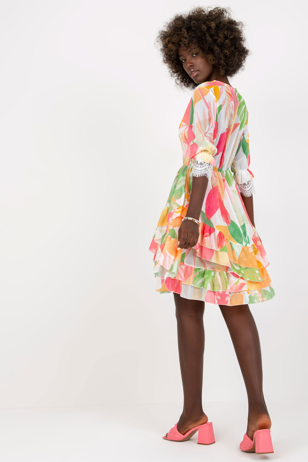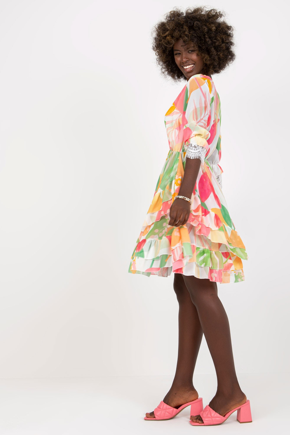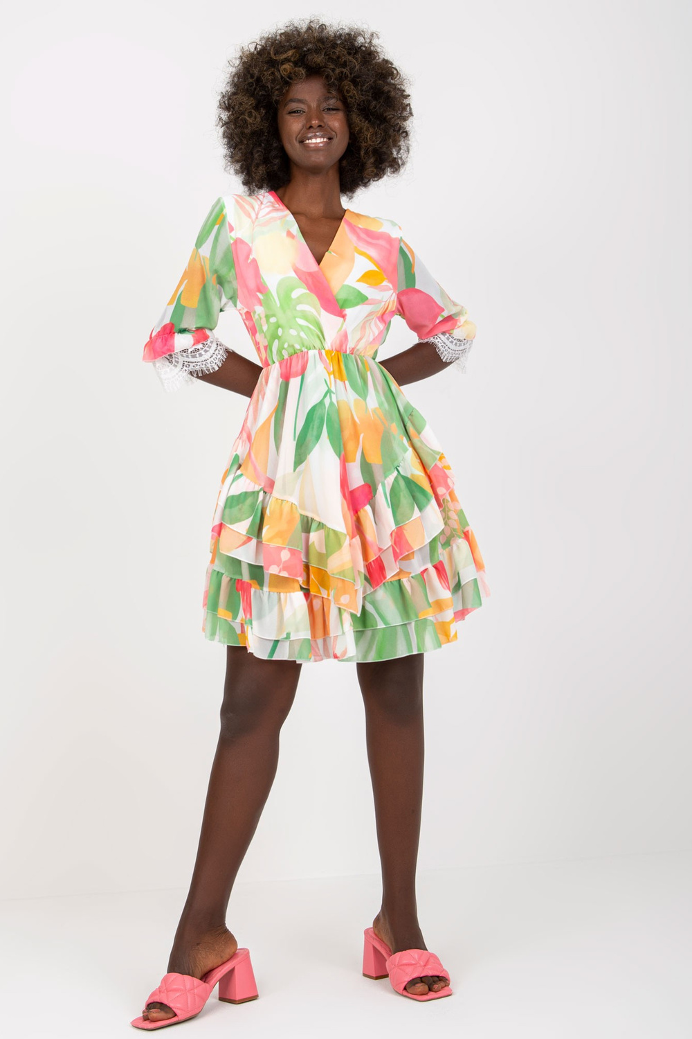Roosa ja roheline laienev volangide ja trükiga kleit .