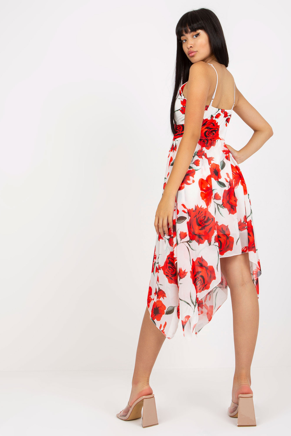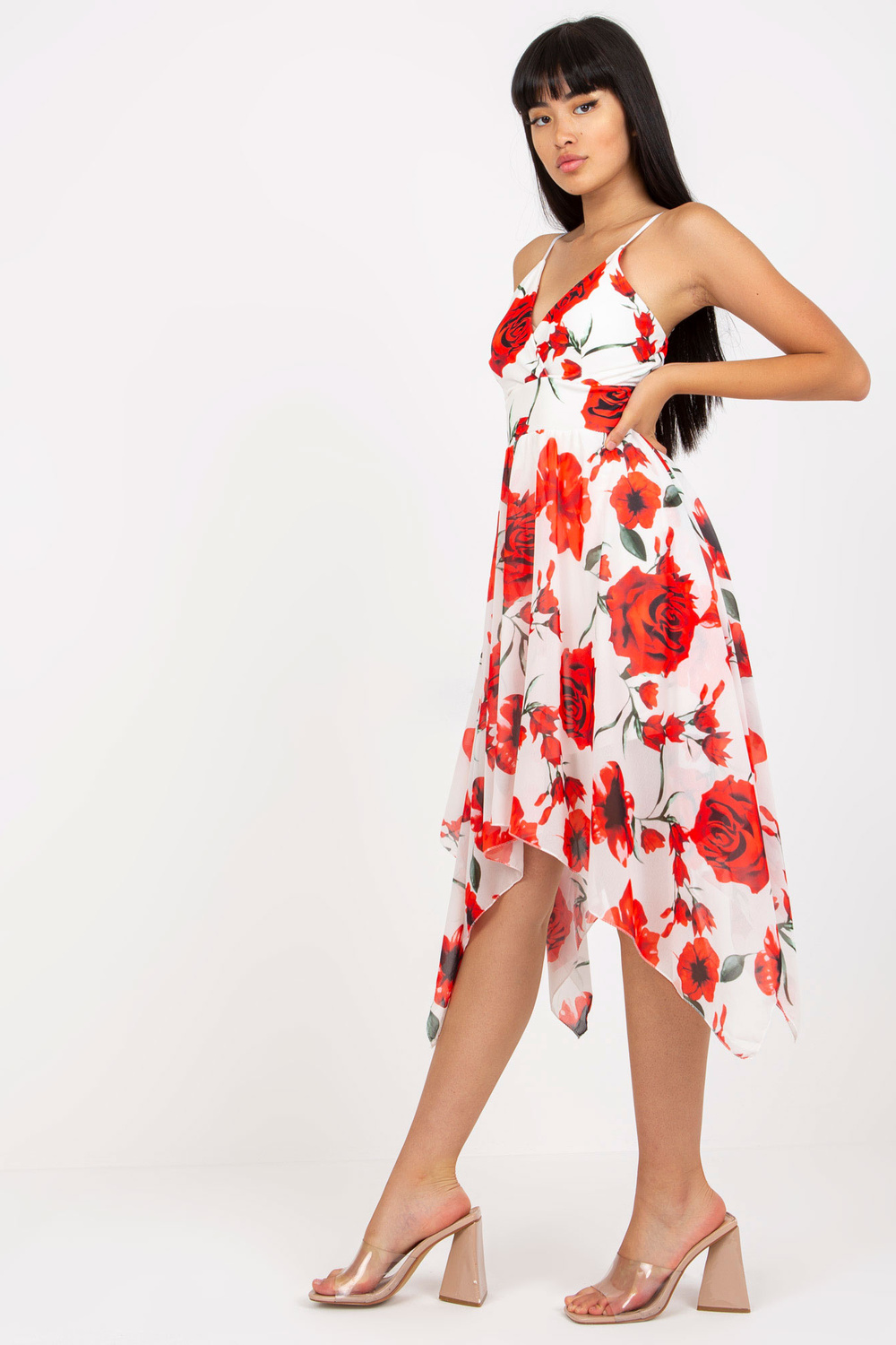 Valge-punase lillelise kaelusega kleit . tarvikud: kummipael vöökohal, reguleeritavad rihmad, vooder, sisseõmmeldud jäigastatud topsid materjalkoostis: 50% polüester, 45% viskoos, 5% elastaan pesumeetod: masinpesu 30°C Tootekood: DHJ-S