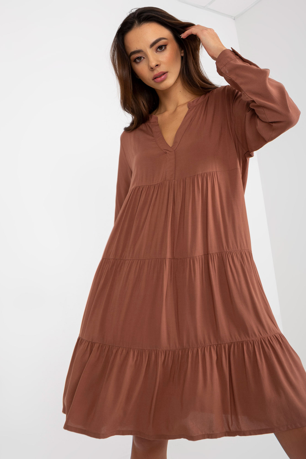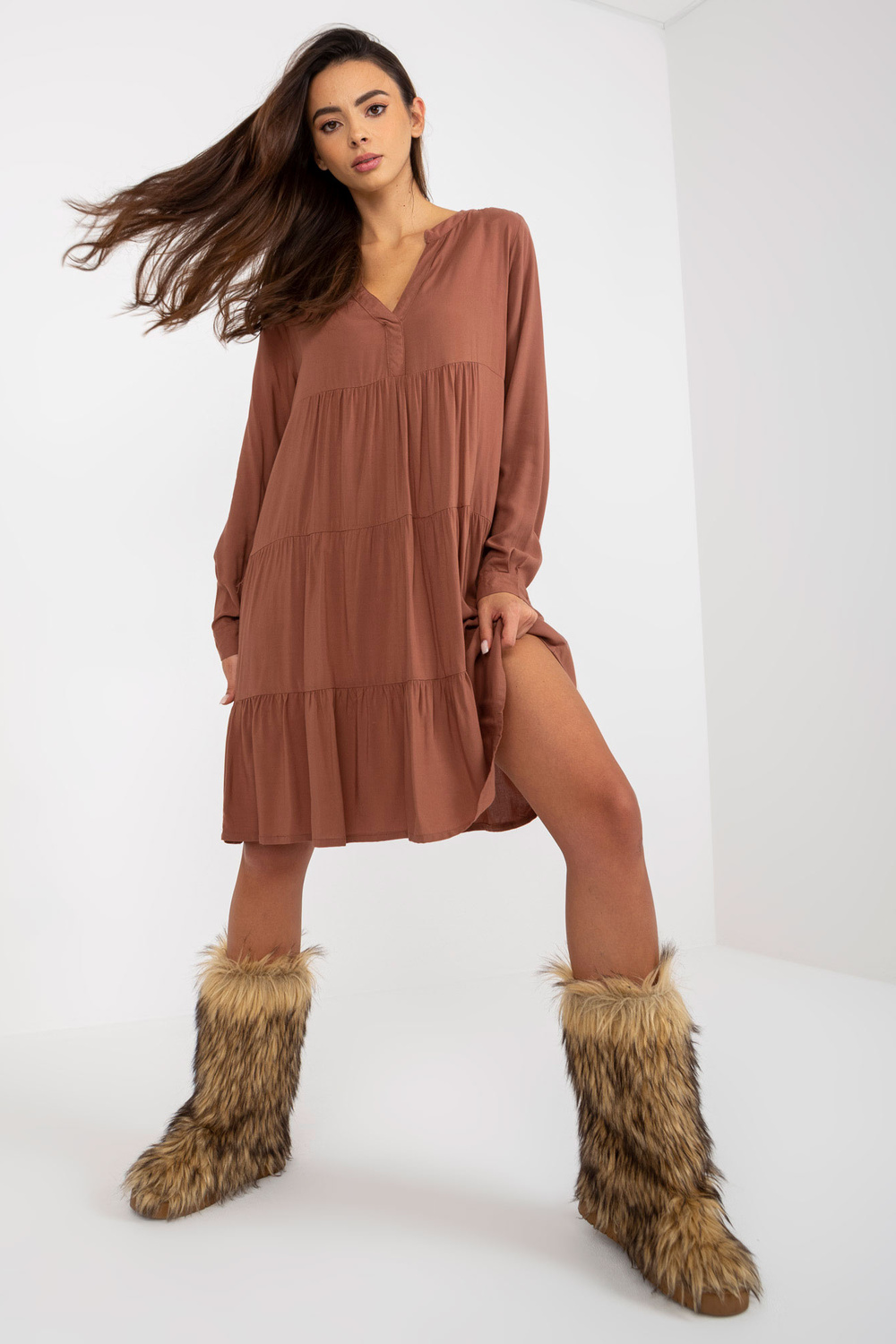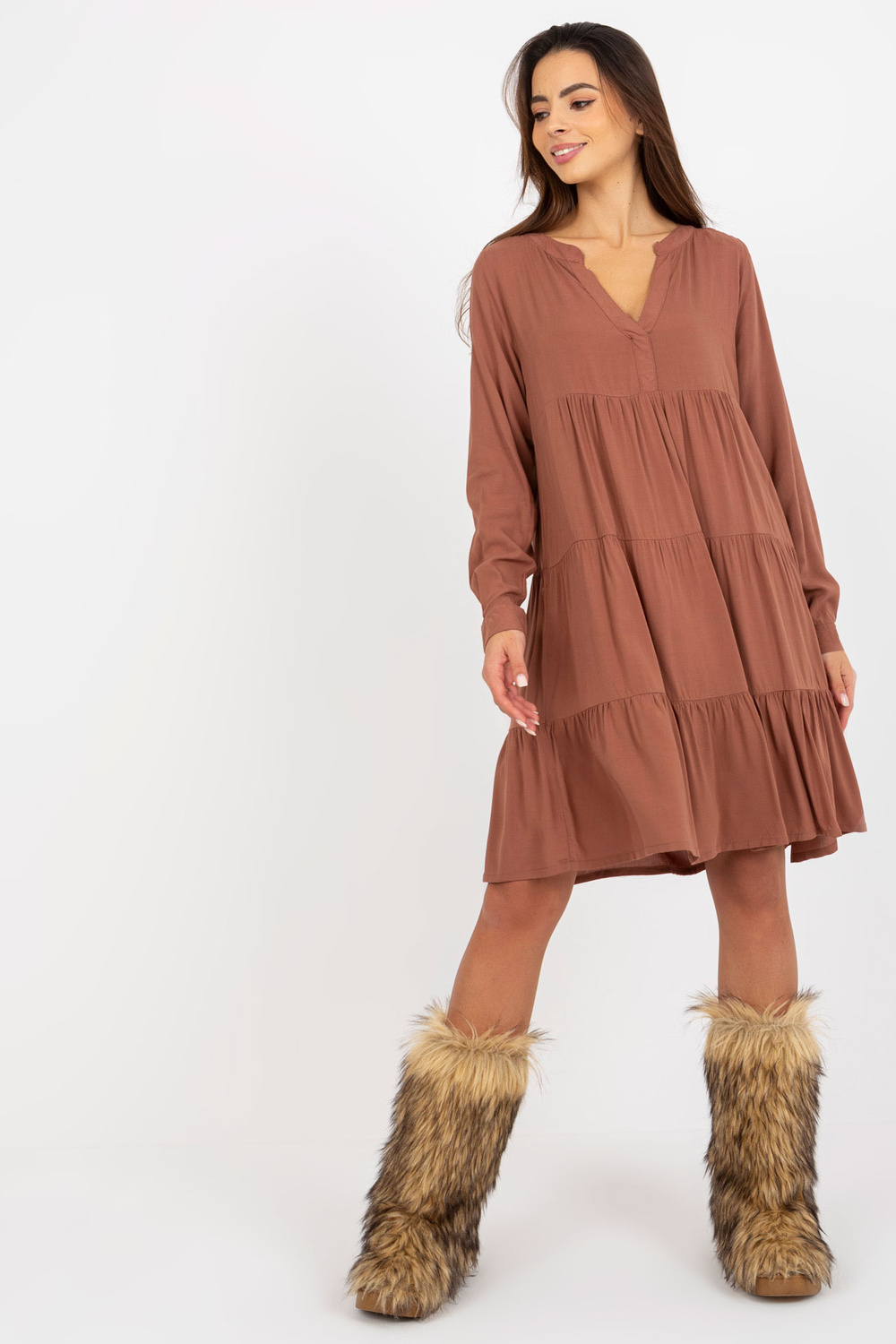 Brązowa boho sukienka z falbaną i dekoltem V SUB LEVEL .