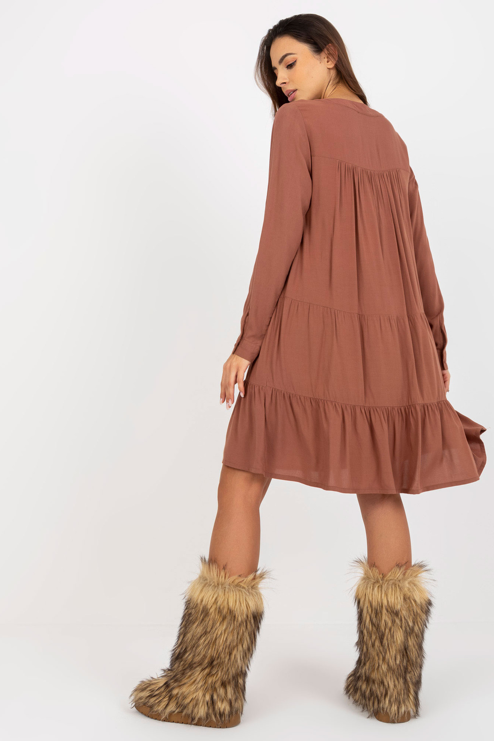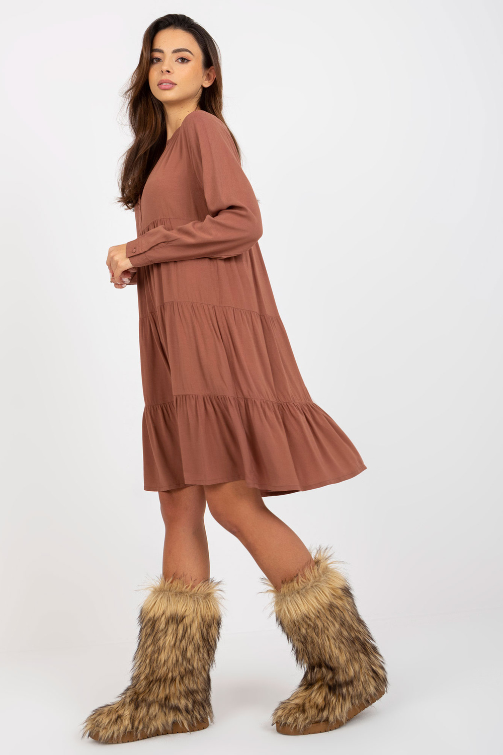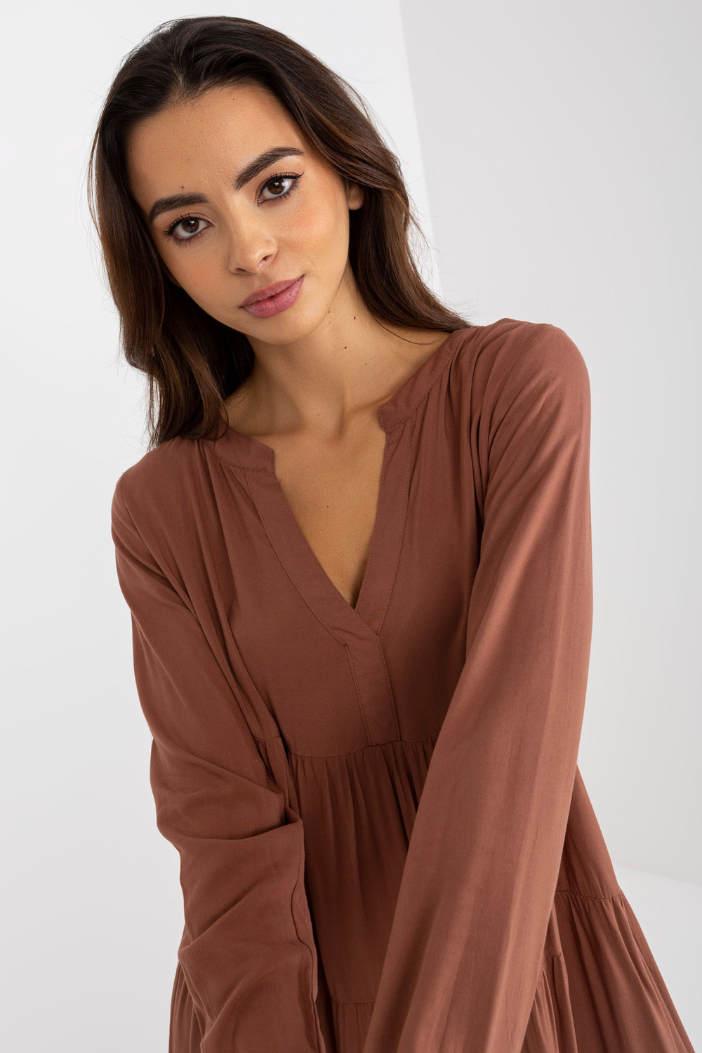 Brązowa boho sukienka z falbaną i dekoltem V SUB LEVEL .