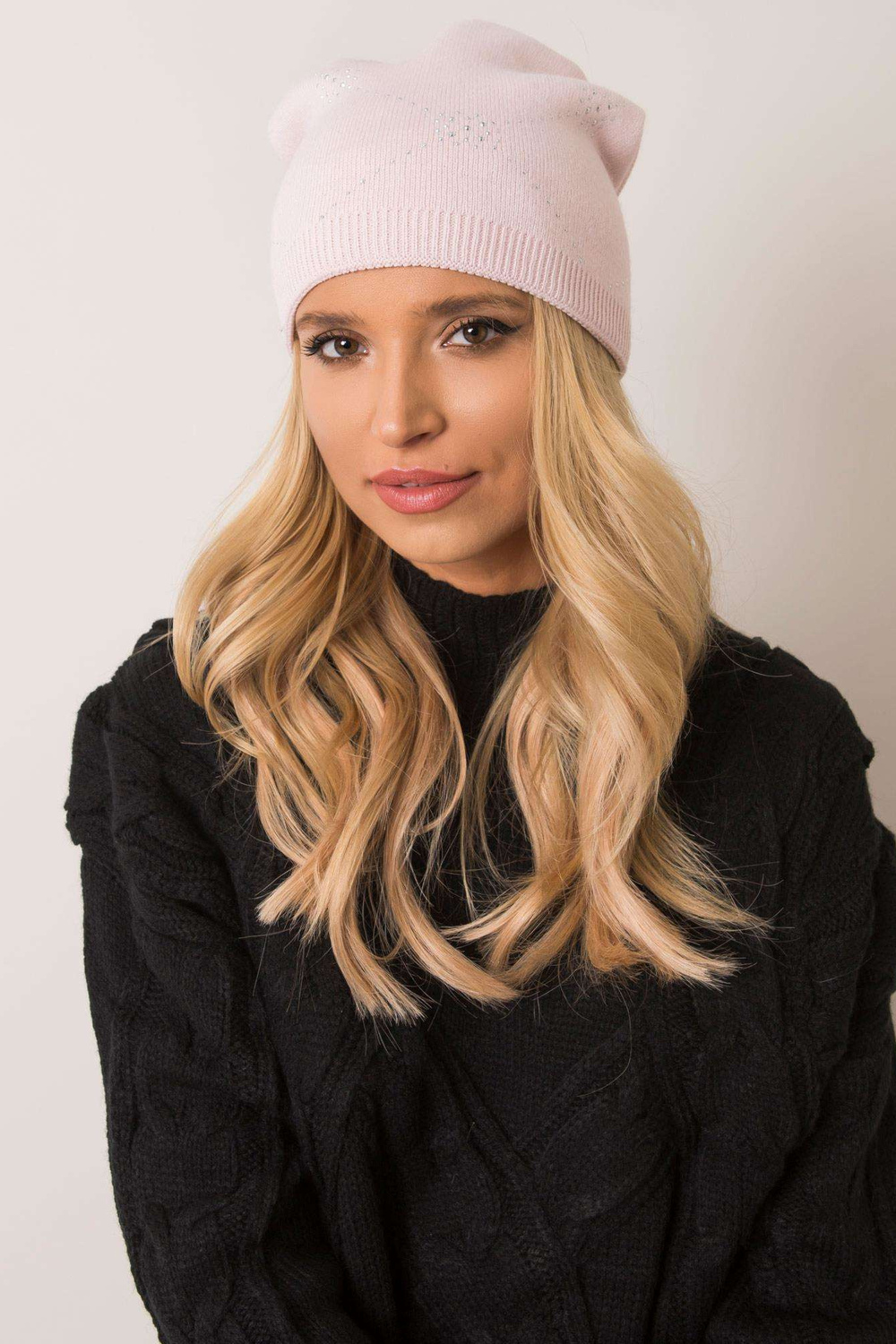 Palepink nokamüts RUE PARIS lisad: kivid materjali koostis: 70% akrüül, 30% vill pesumeetod: masinpesu 30°C