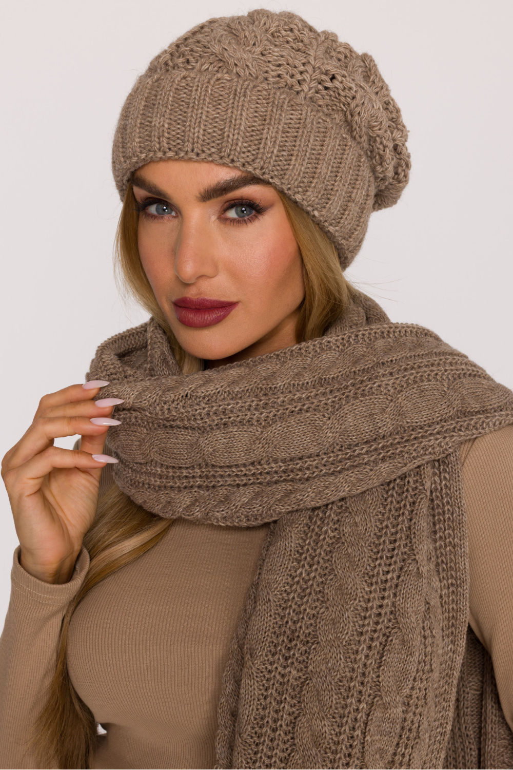Warm hat made of soft yarn with a thick, braided weave. The simple cut with a gentle looseness at the top gives the whole a casual, stylish character. The rolled edge provides extra comfort and better fit, and the decorative braided weave adds a classic, winter charm.