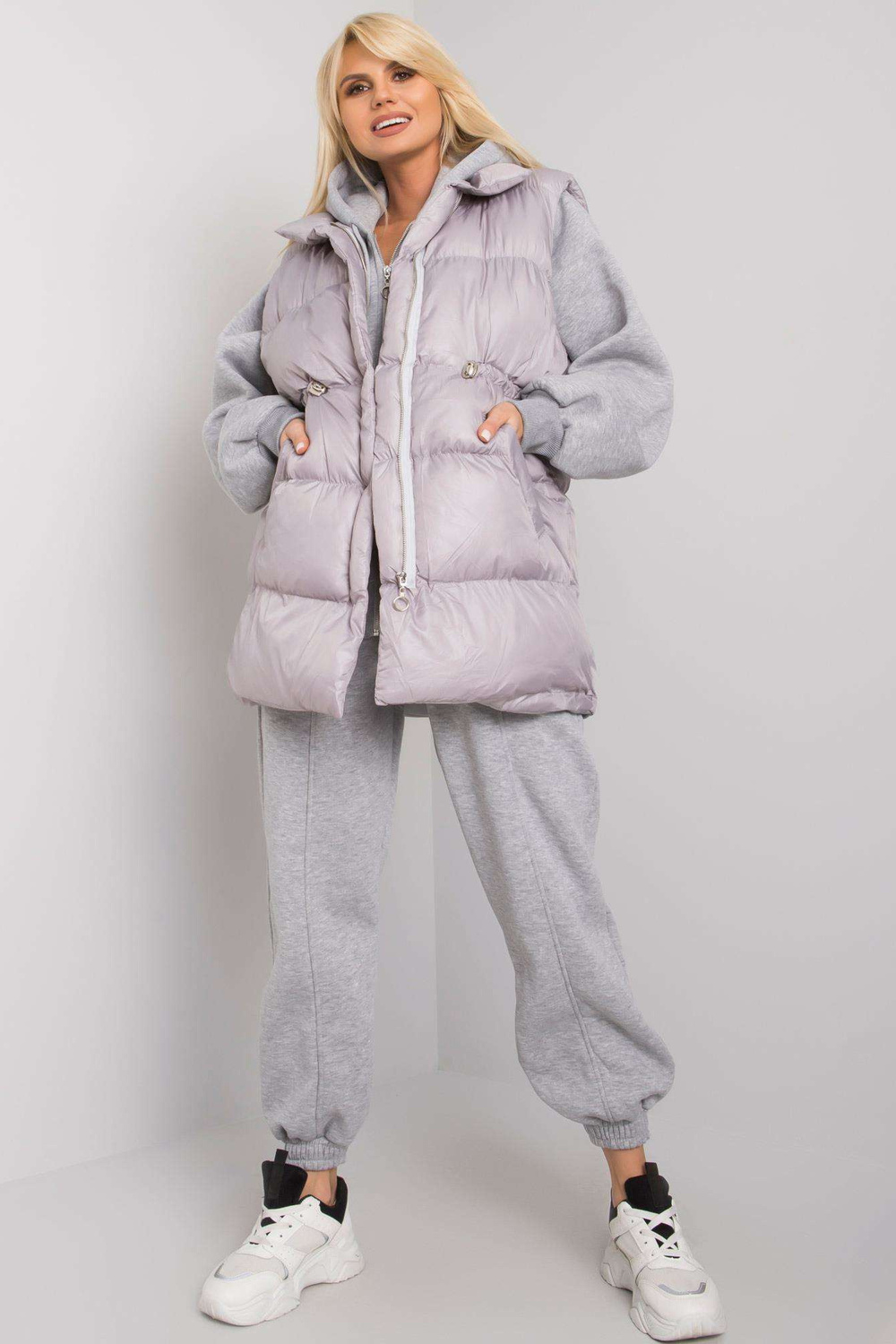 Greymelange kolmeosaline komplekt Abigaili vestiga. komplekti kuulub: kardiganid kapuuts, dressipüksid, sulevesti tarvikud: taskud, soojendus, voodri materjal koostis: dressid - 70% puuvill, 30% polüester; vest - 100% polüester pesumeetod: masinpesu 30