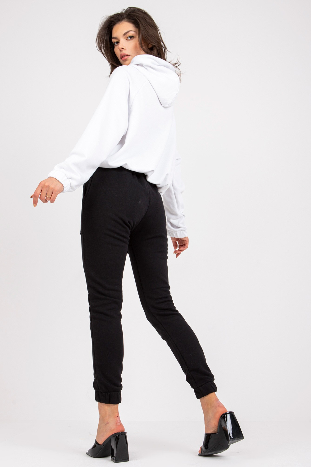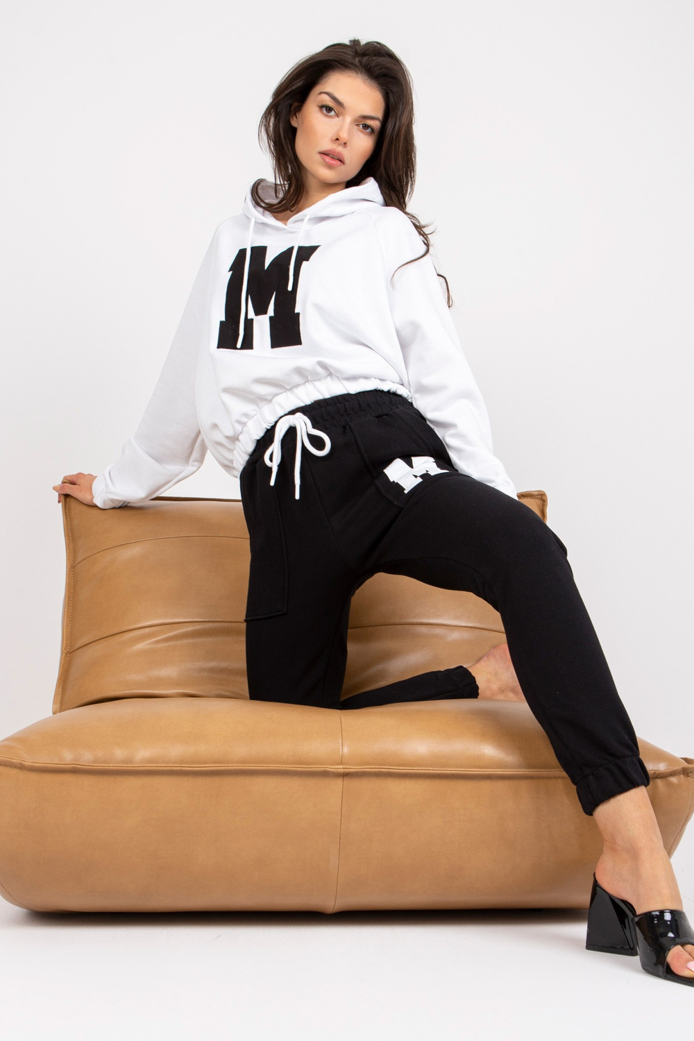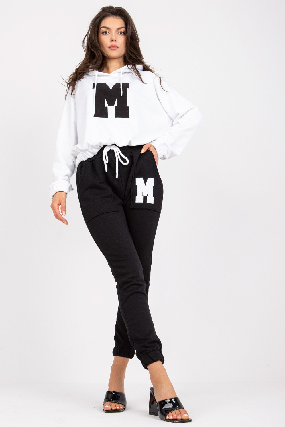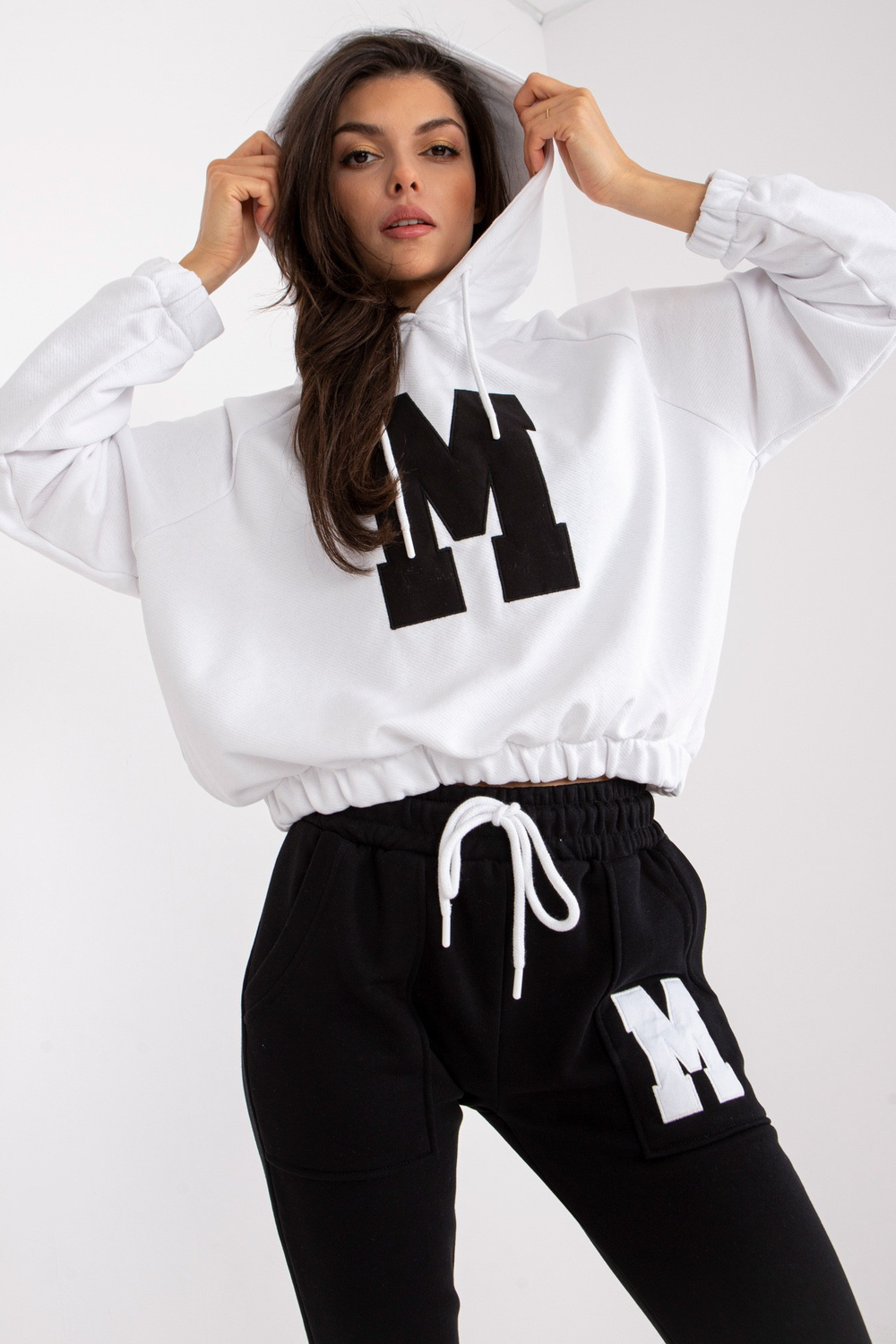 Danielle'i valge ja must kapuutsiga dressipluus.