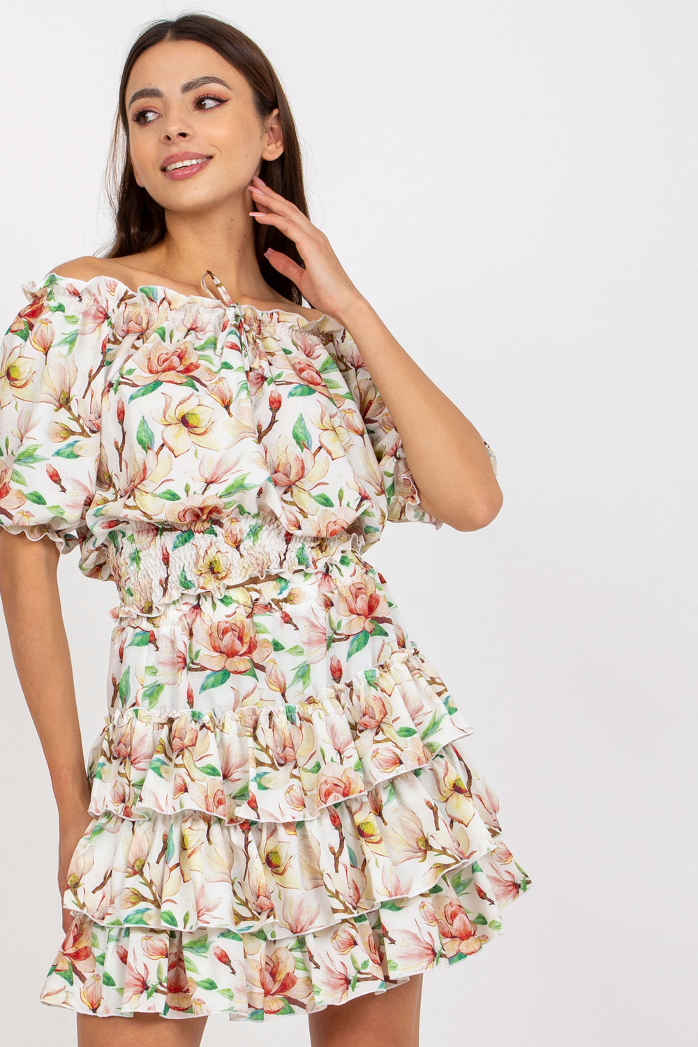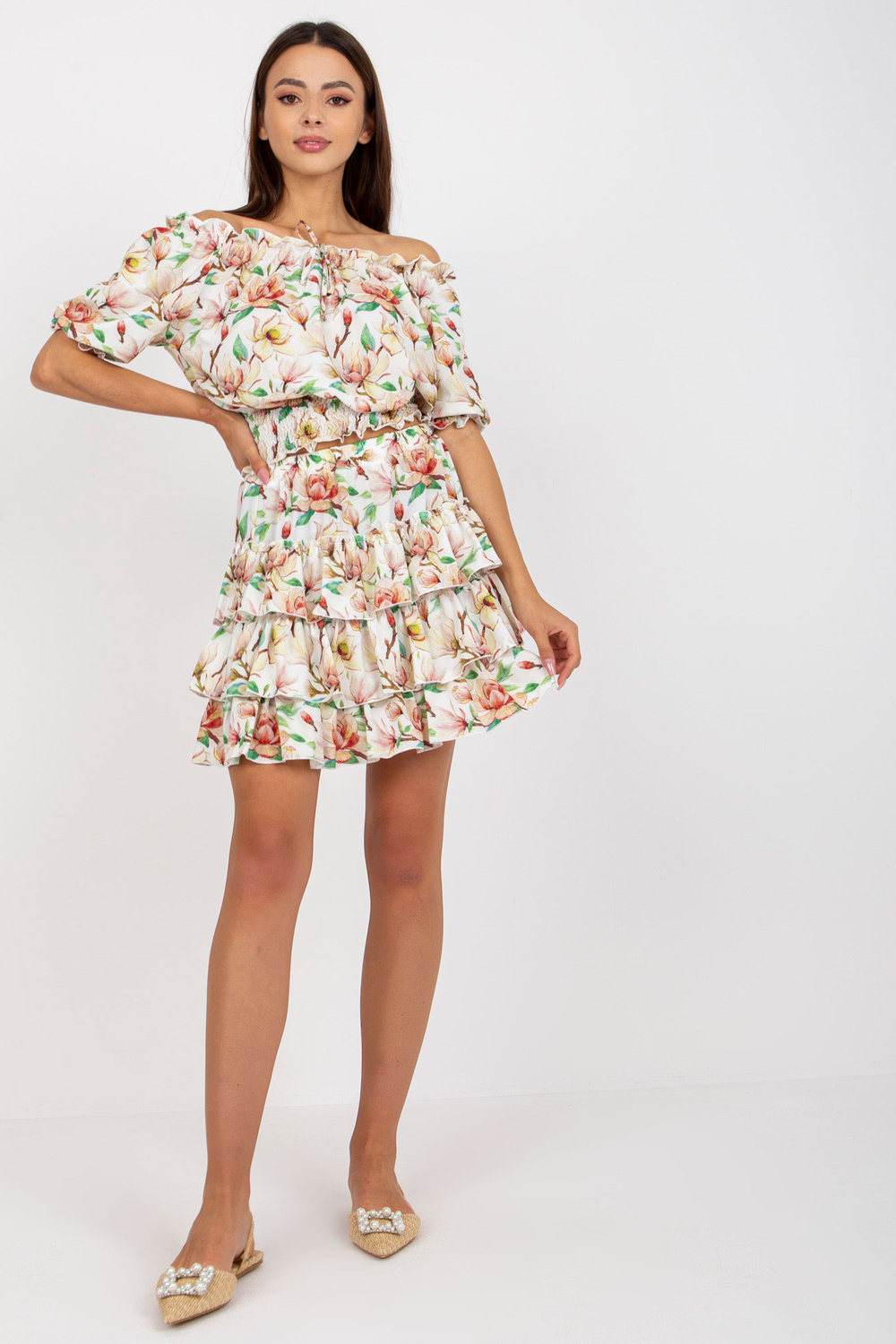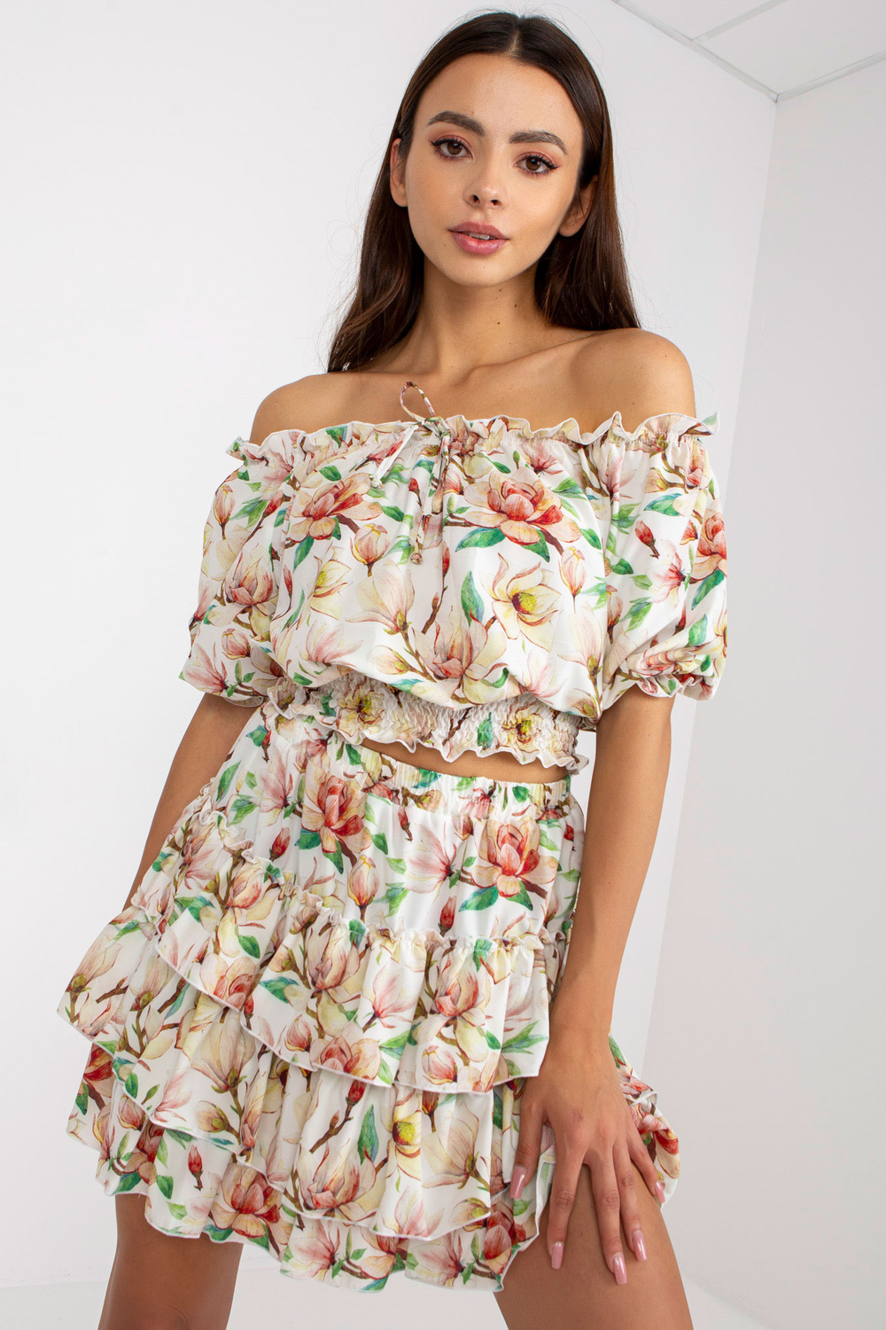 Valge-bordopunane naiste suvekomplekt lilledega .
