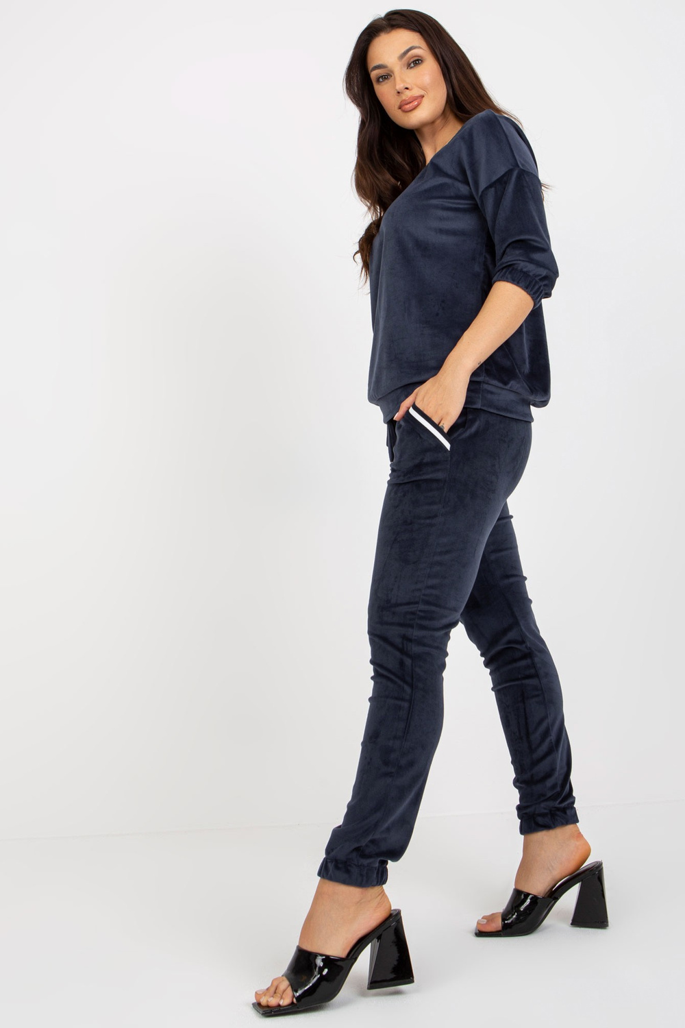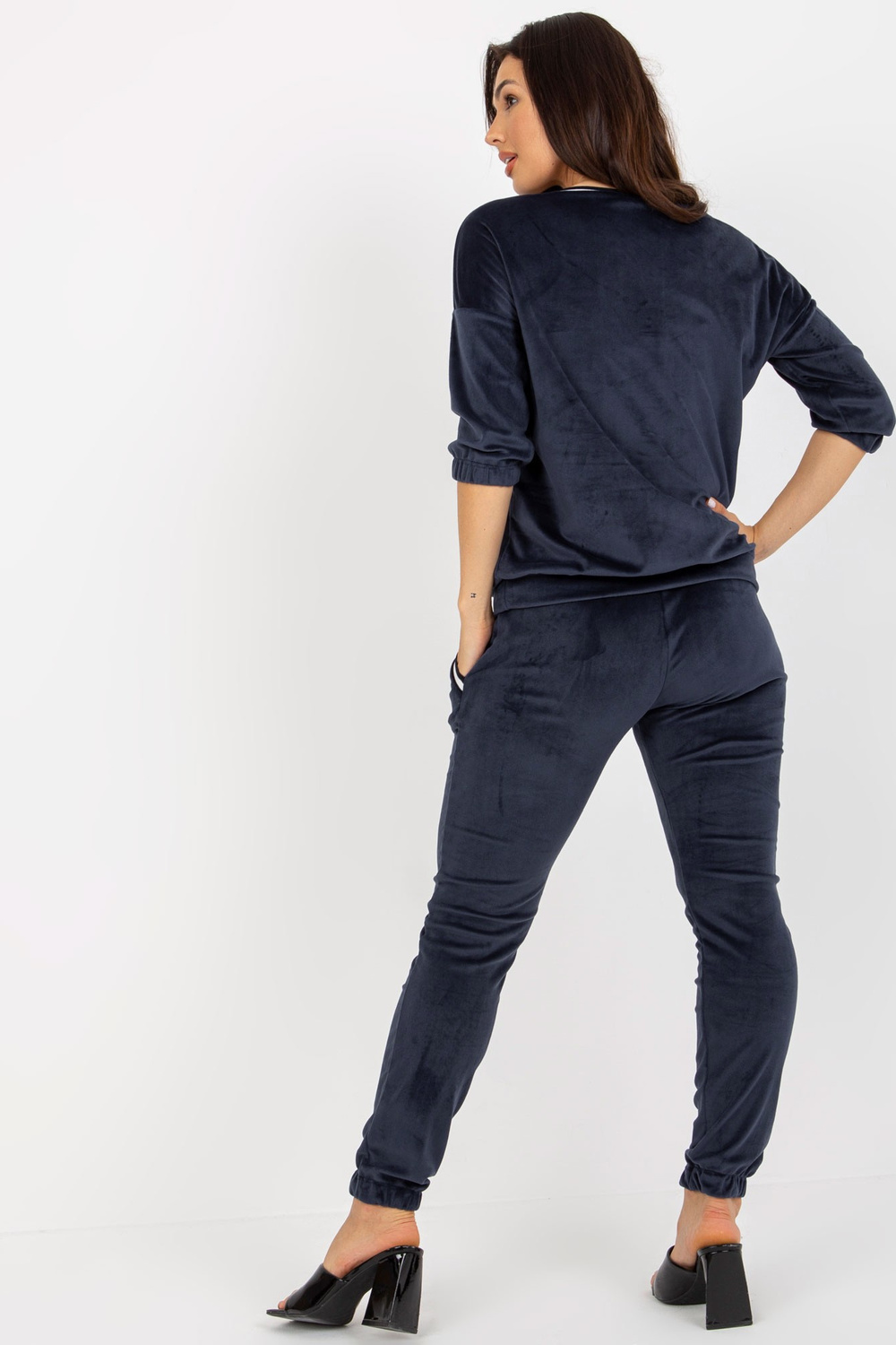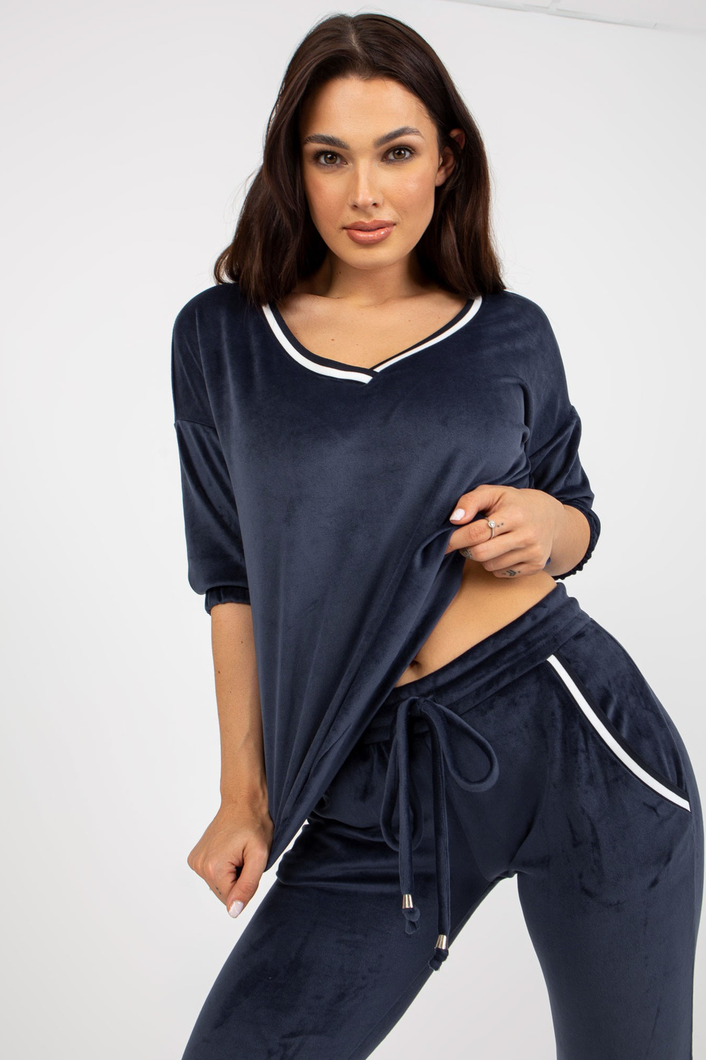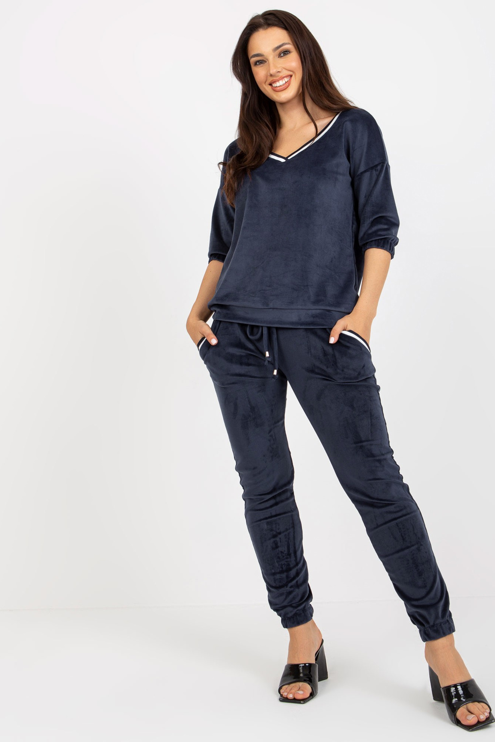 Zweiteiliges Veloursset Marineblaus koos V-Ausschnittiga.