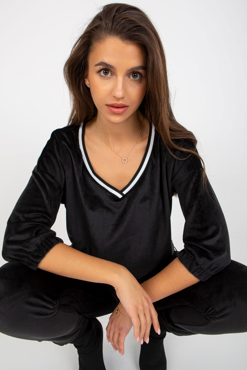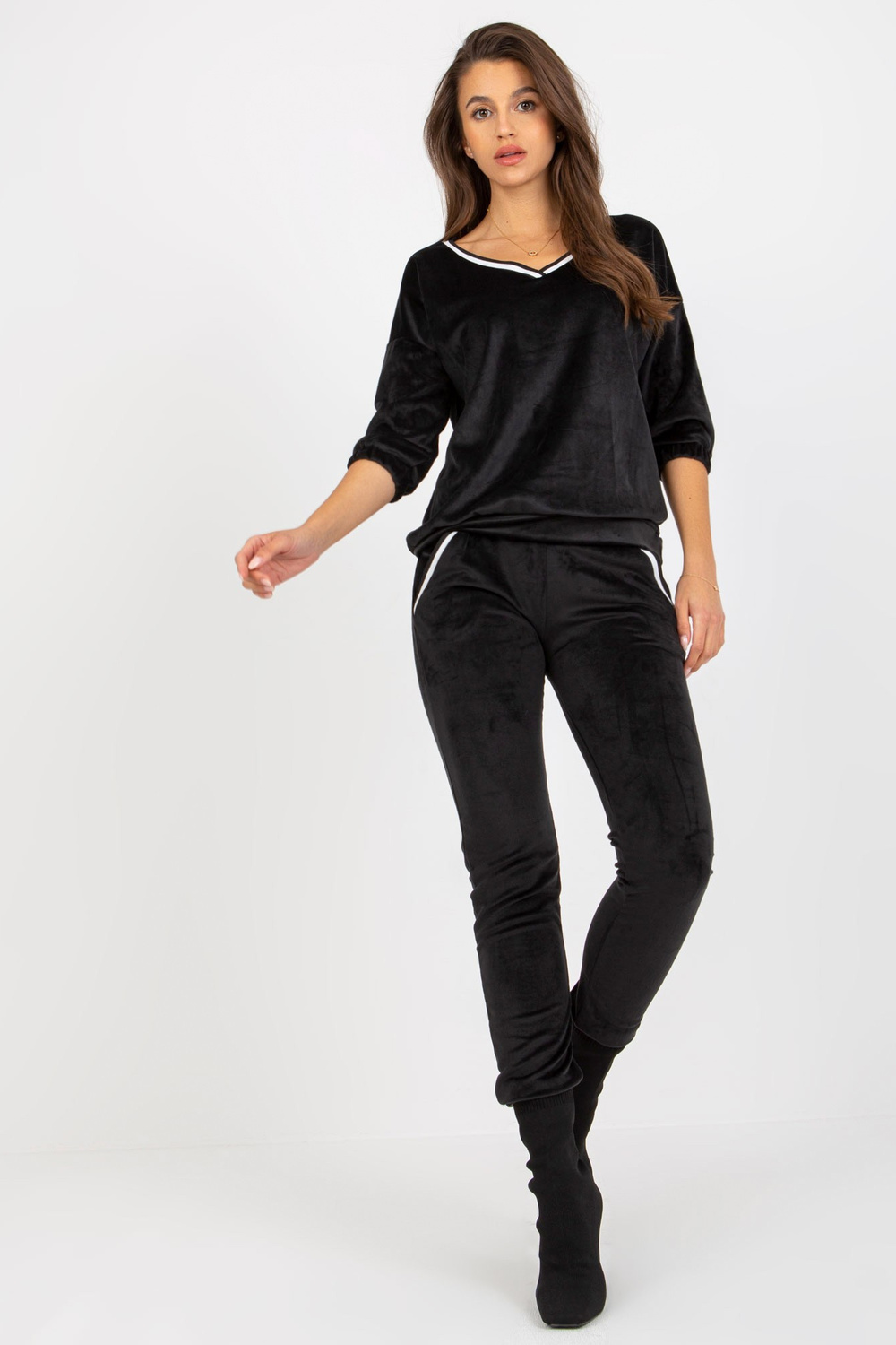 Schwarzes zweiteiliges Velours-Set mit V-Ausschnitt.