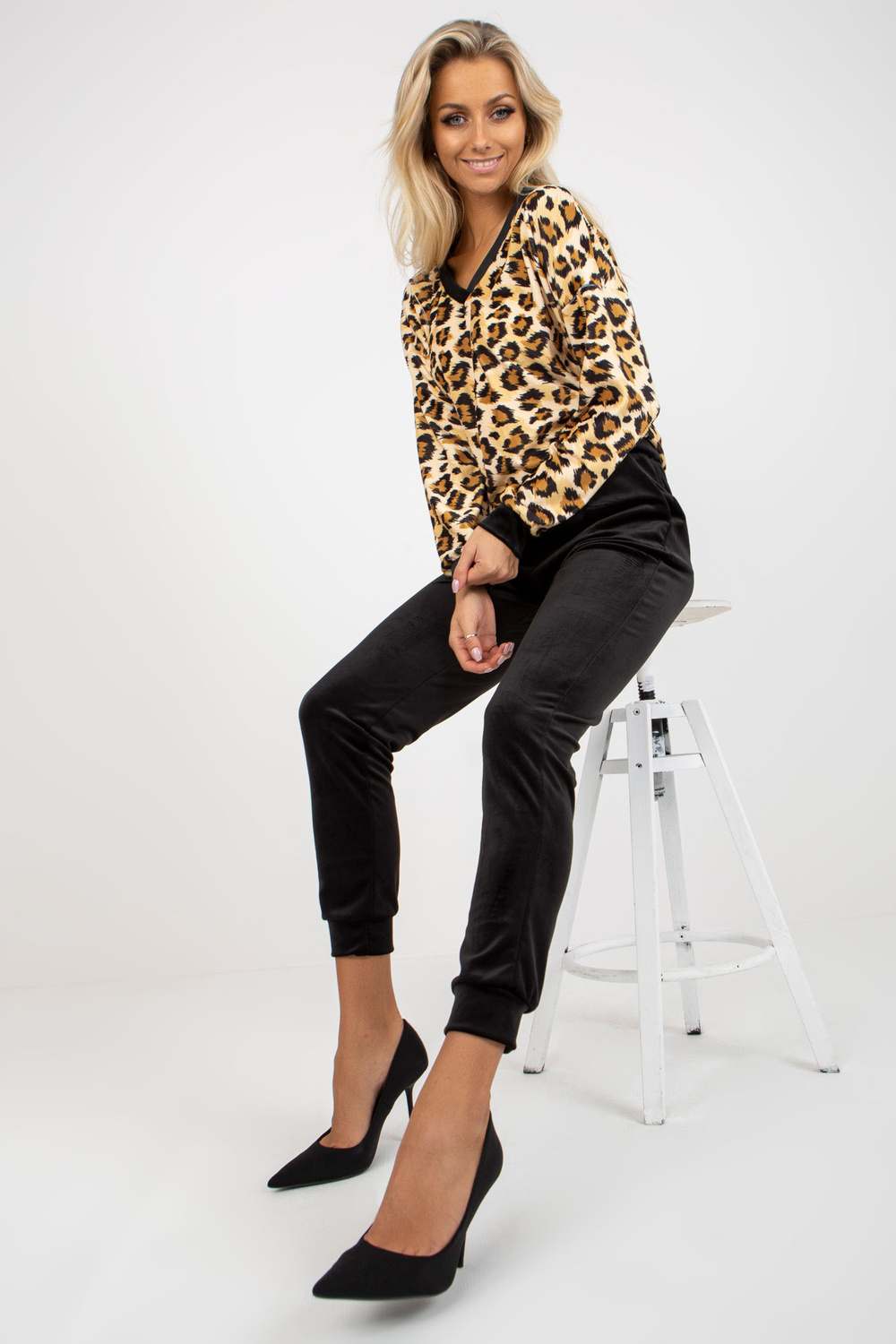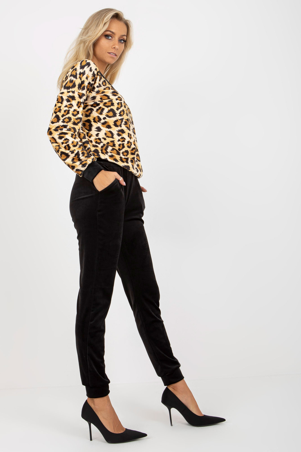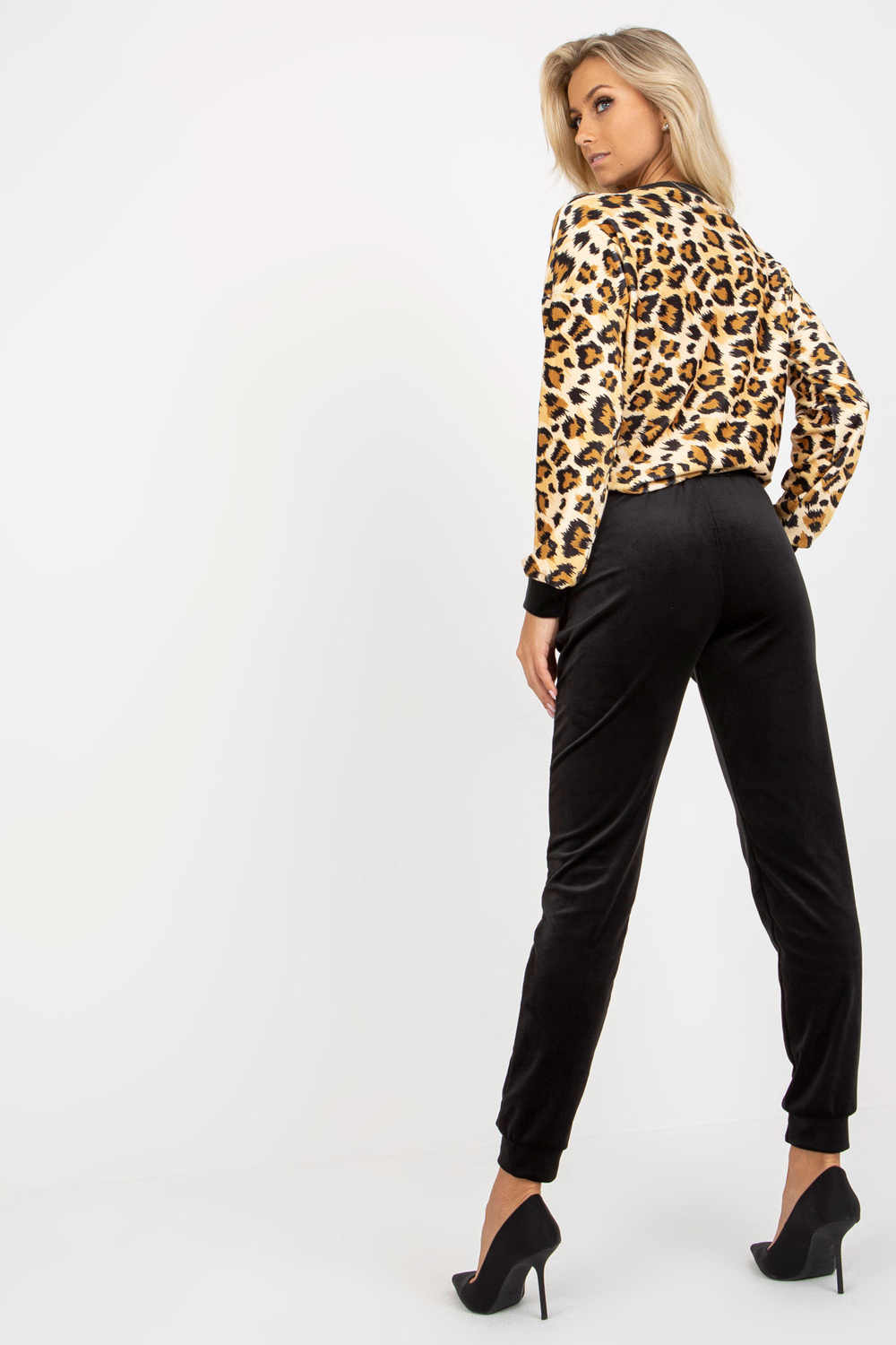 Beežid ja värvilised Velours-Set mit Leoparden-Sweatshirt RUE PARIS.