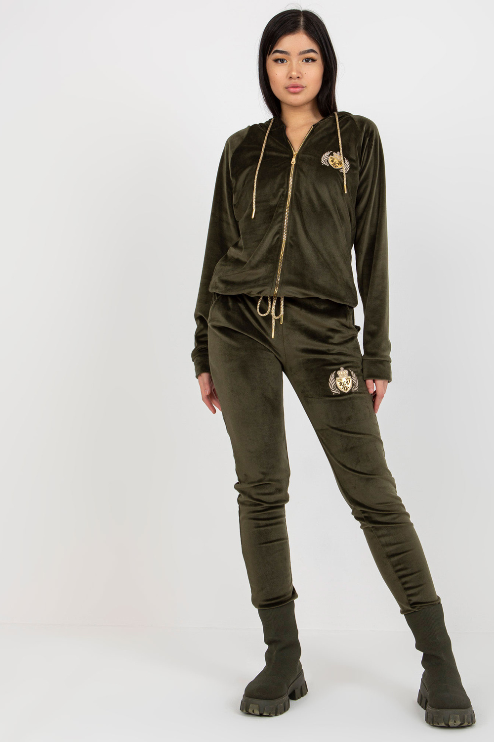 Kahevärviline kaheosaline veluurkomplekt koos kapuutsiga.