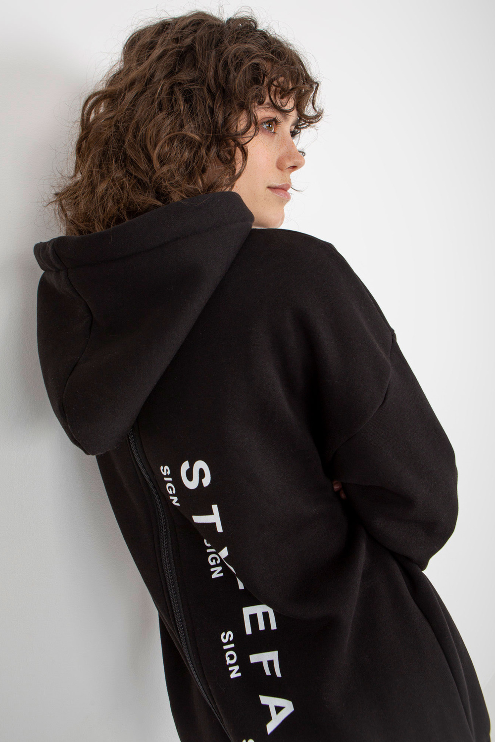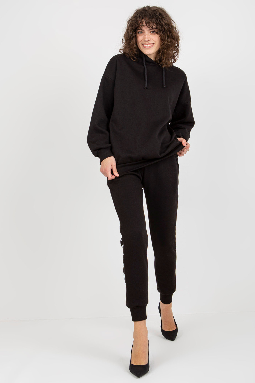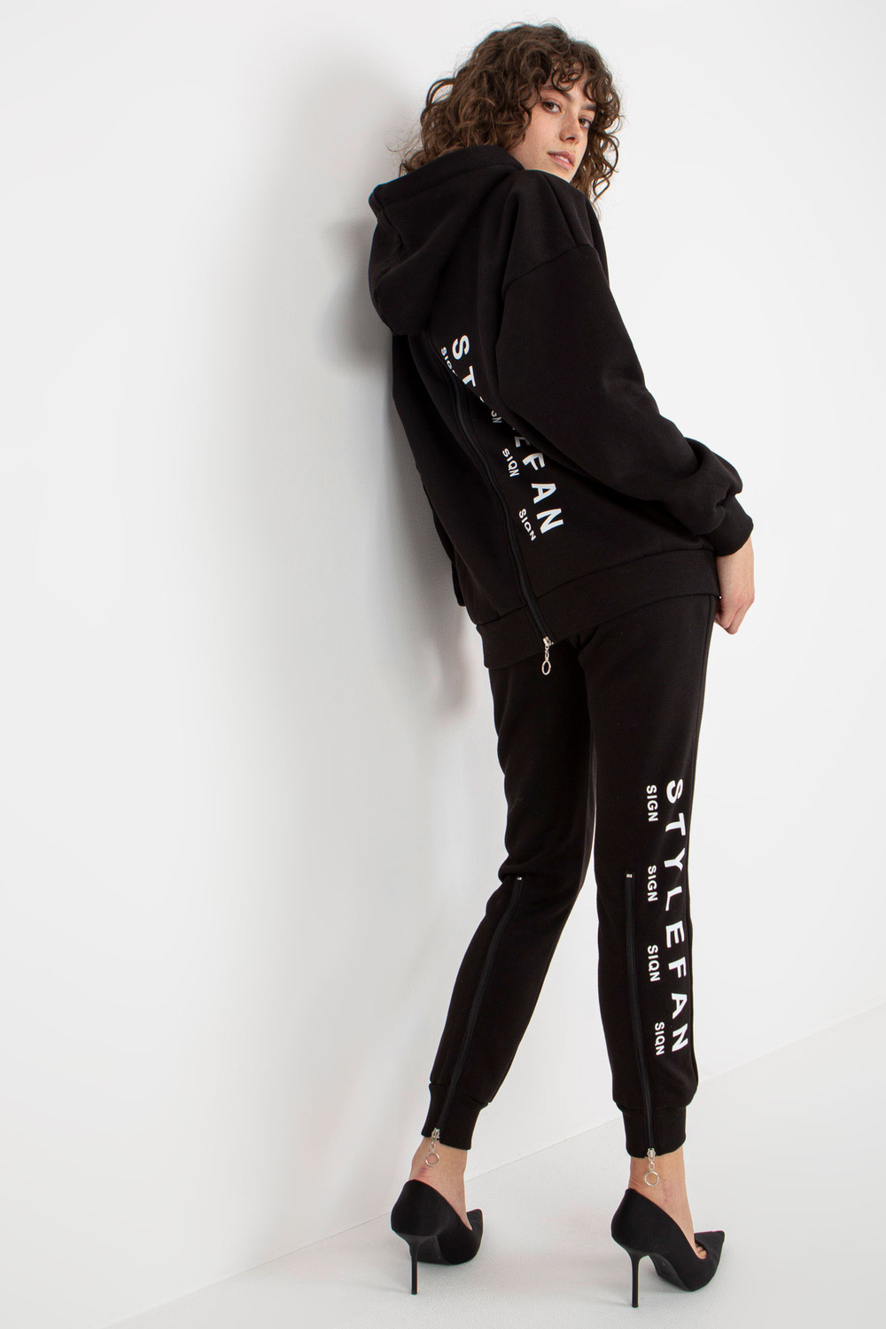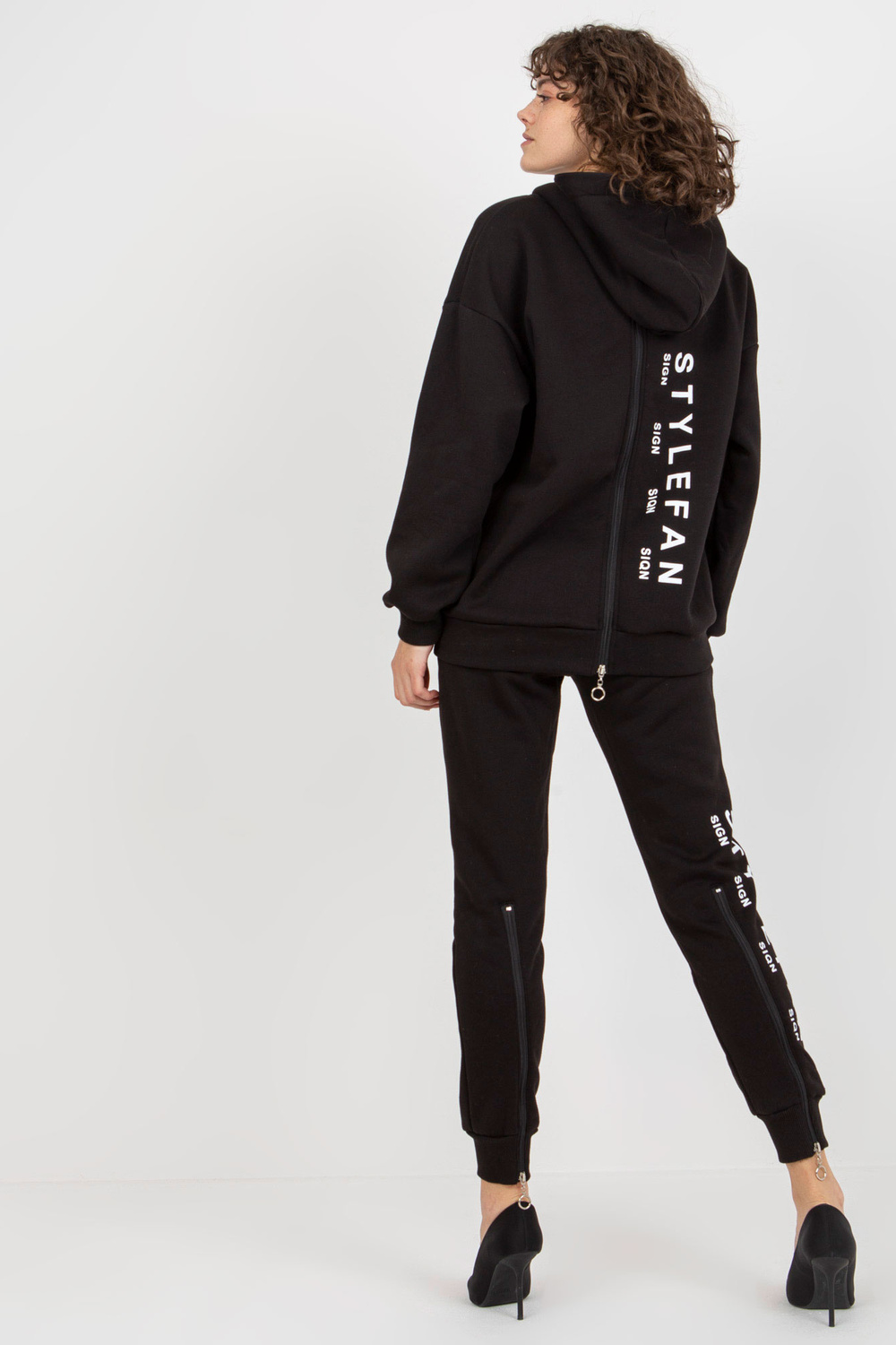 Must naiste dressikomplekt, millel on lukud ja kirjad.