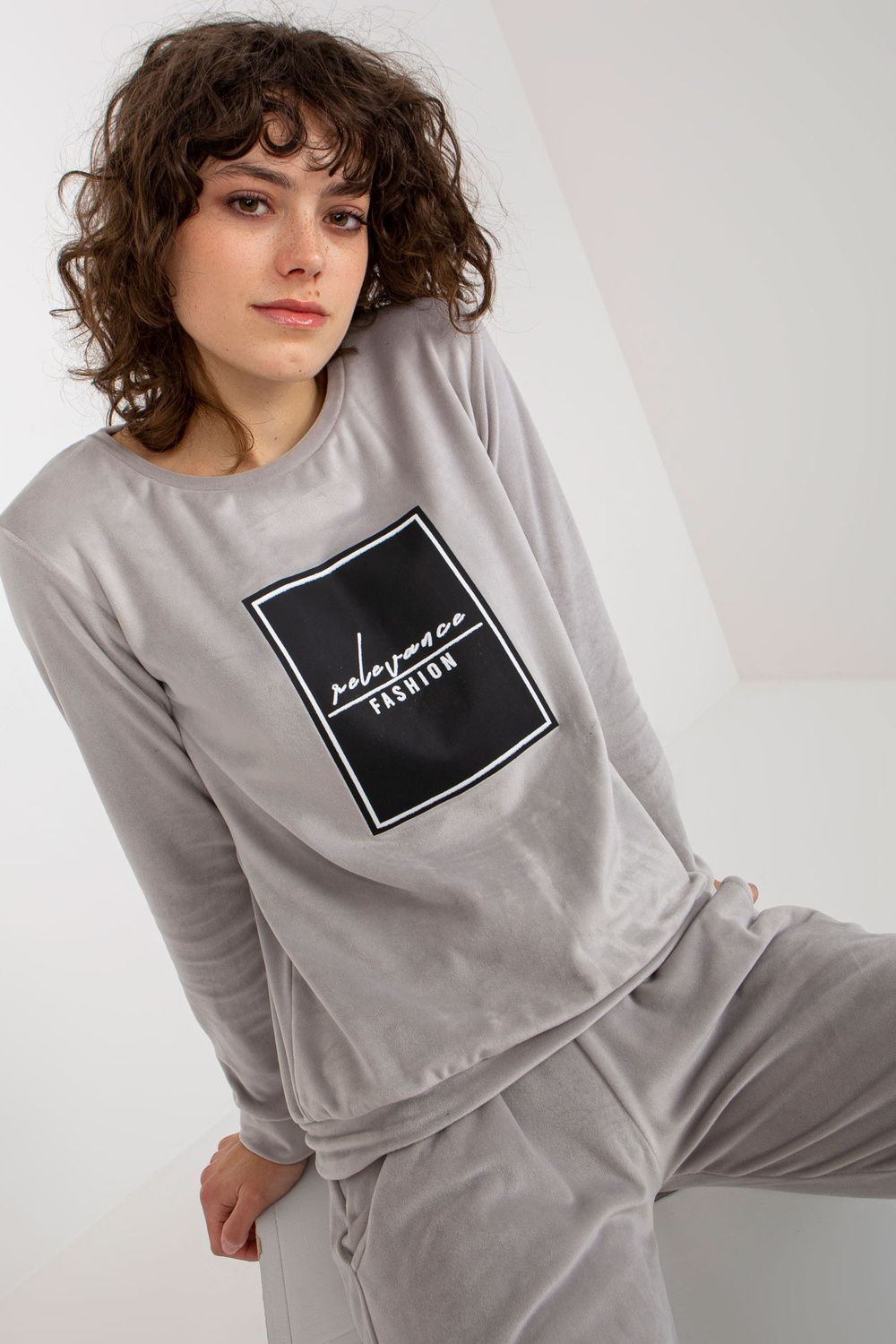 Ümara kaelusega helehall naiste veluurkomplekt.