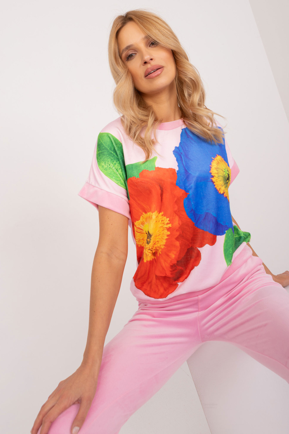 Komplekti mõõdud ühes suuruses, mõõdetuna tasaseks: pluusi laius kaenla alt - 64 cm, pluusi pikkus - 65 cm, pükste laius vööst - 36 cm, pükste kõrgus vööst - 32 cm, pükste pikkus - 94 cm.