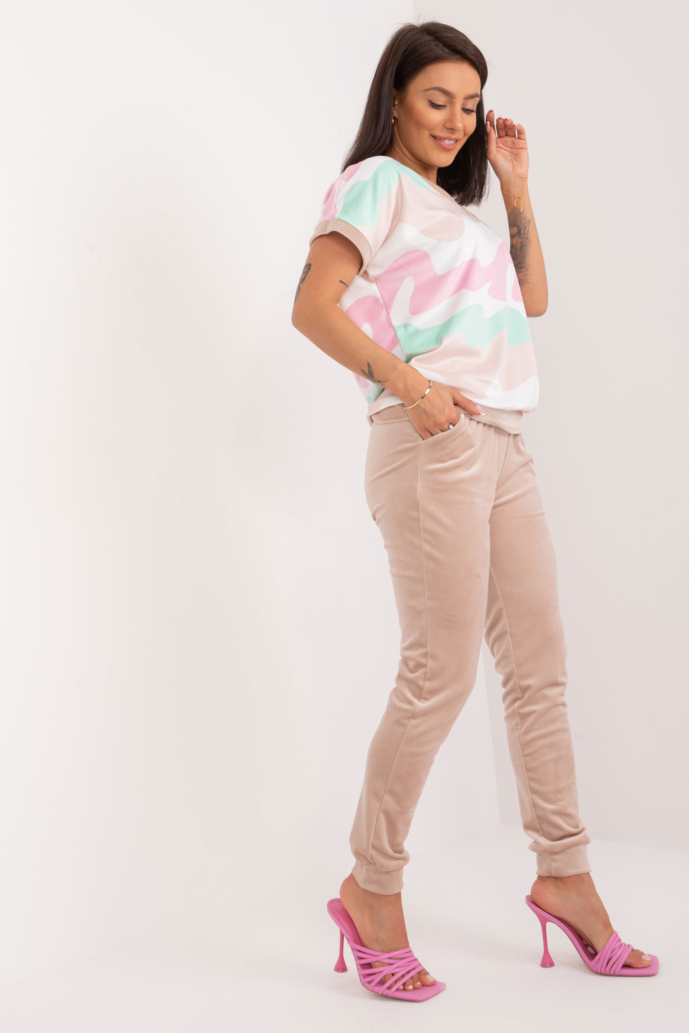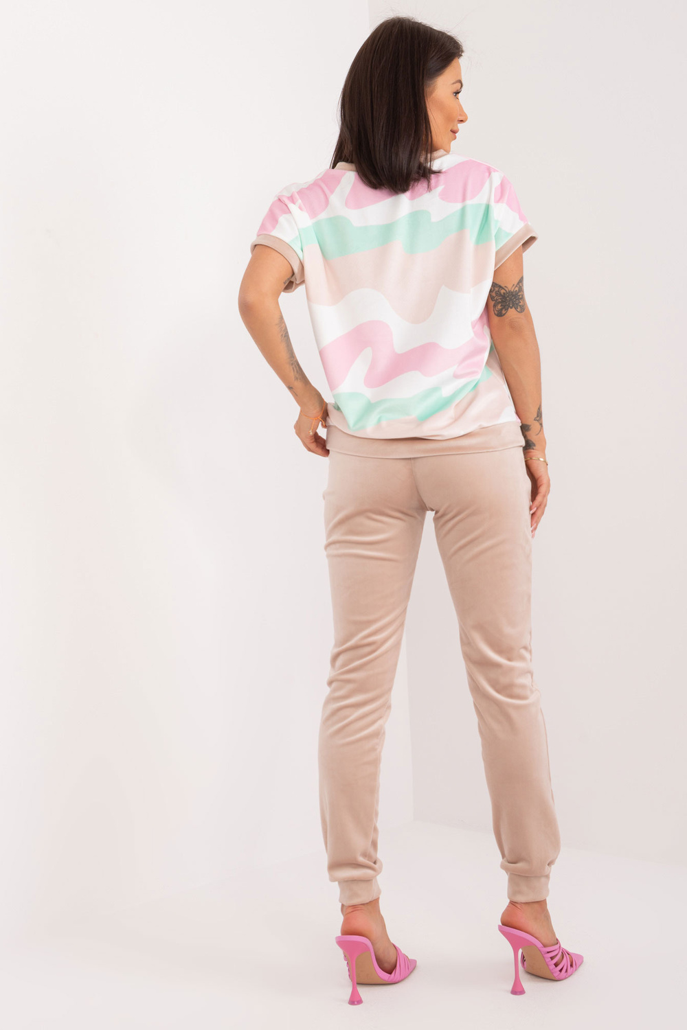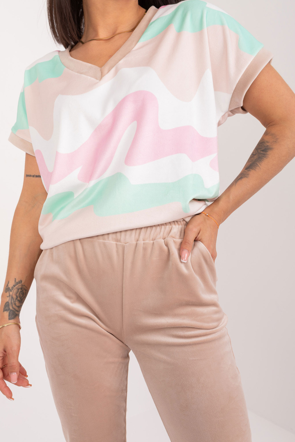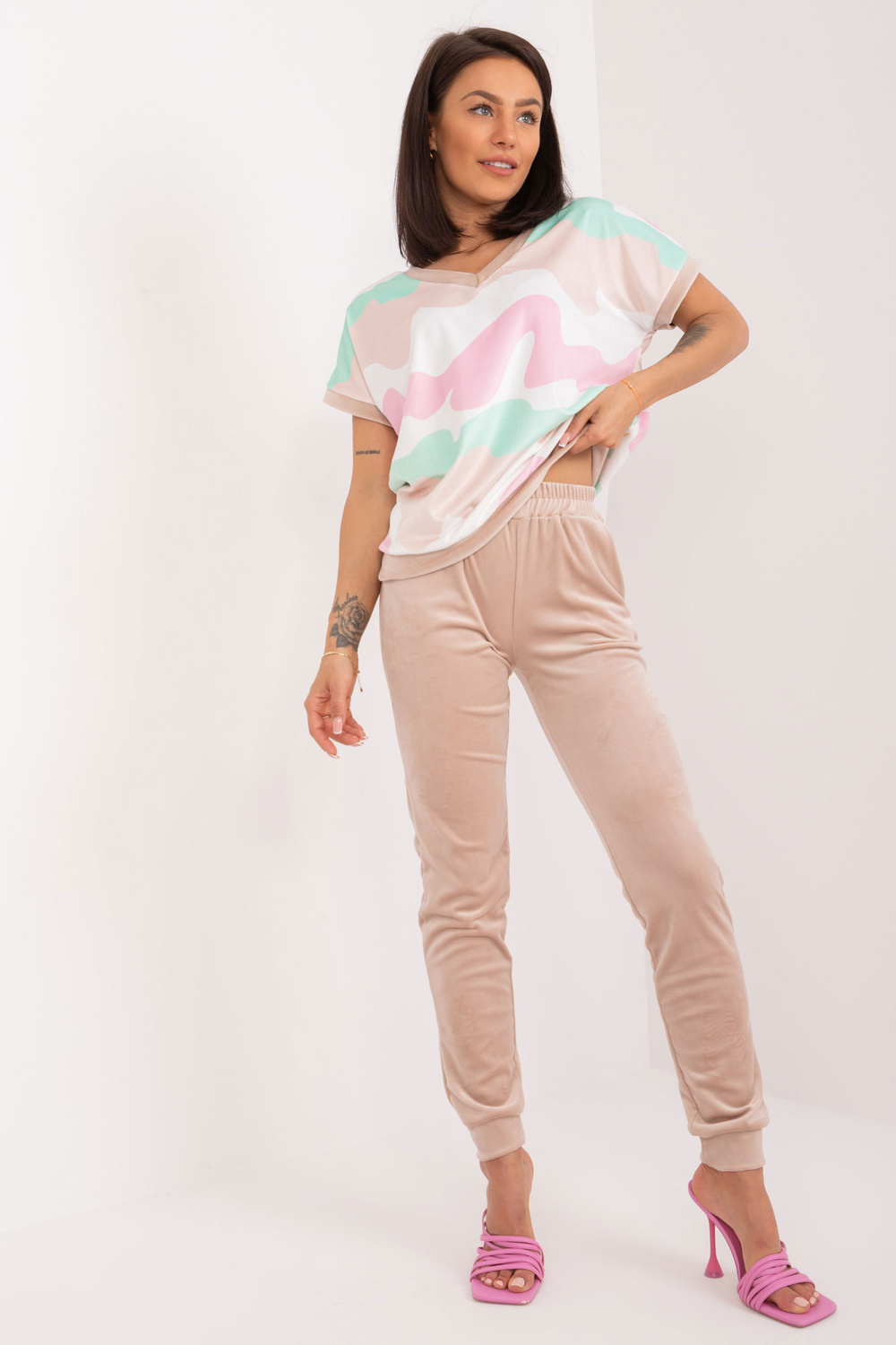 Komplekti mõõdud suuruses S, mõõdetuna tasaseks: pluusi laius kaenla alt - 59 cm, pluusi pikkus - 60 cm, pükste laius vööst - 33 cm, pükste kõrgus vööst - 28 cm, pükste pikkus - 95 cm.
