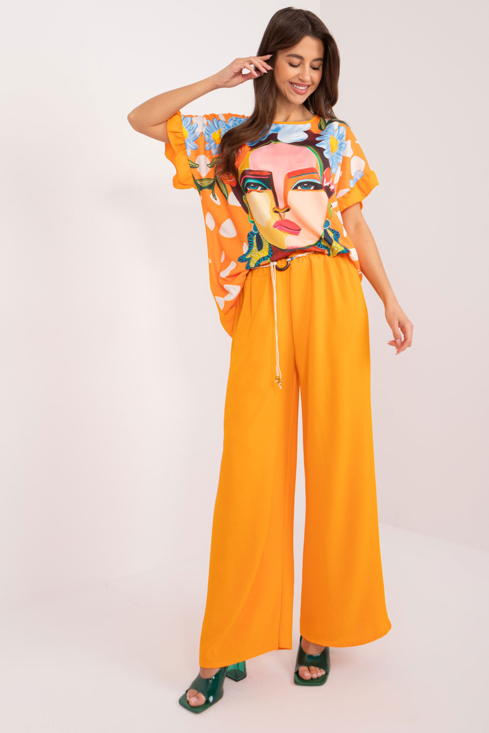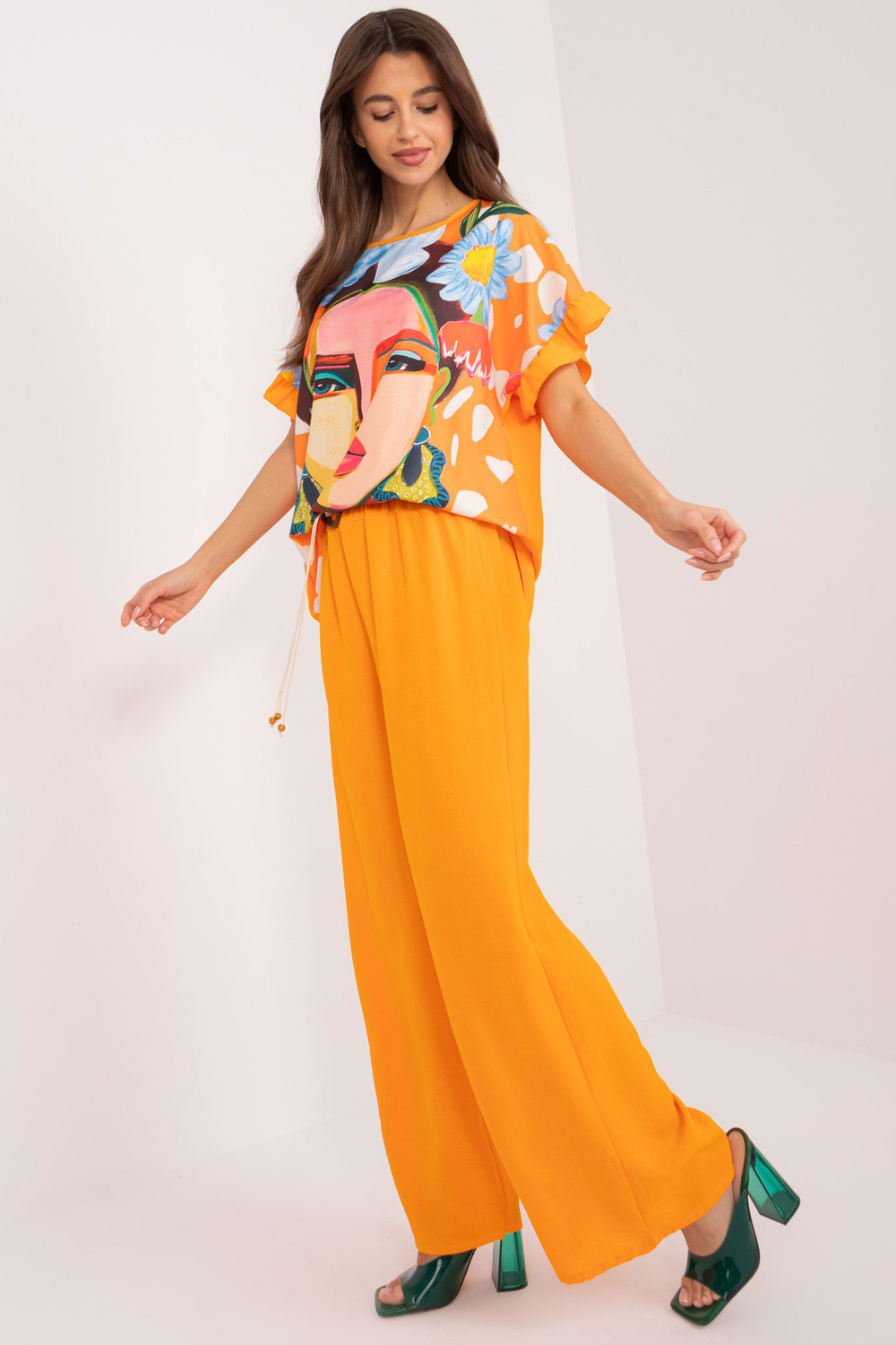 Komplekti mõõdud ühes suuruses, mõõdetuna tasaseks: pluusi laius kaenla alt - 62 cm, pluusi pikkus - 71 cm, pükste laius vööst - 34 cm, pükste kõrgus vööst - 35 cm, pükste pikkus - 95 cm.