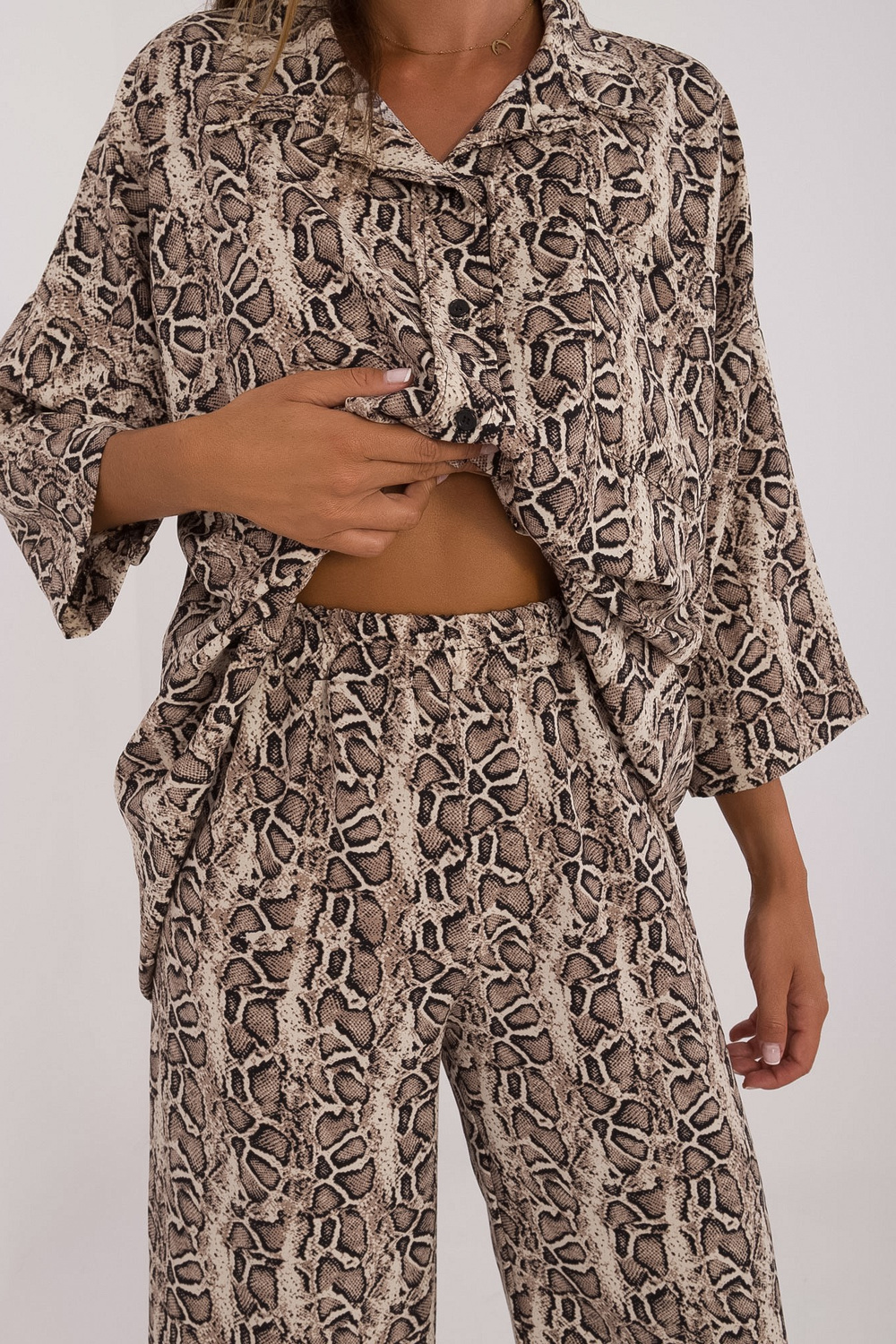 Komplekti mõõdud suuruses S/M. mõõdetuna tasaseks: särgi laius kaenla alt - 70 cm, varruka pikkus - 47 cm, särgi pikkus - 75 cm, pükste vöö laius - 34 cm, pükste pikkus - 100 cm.