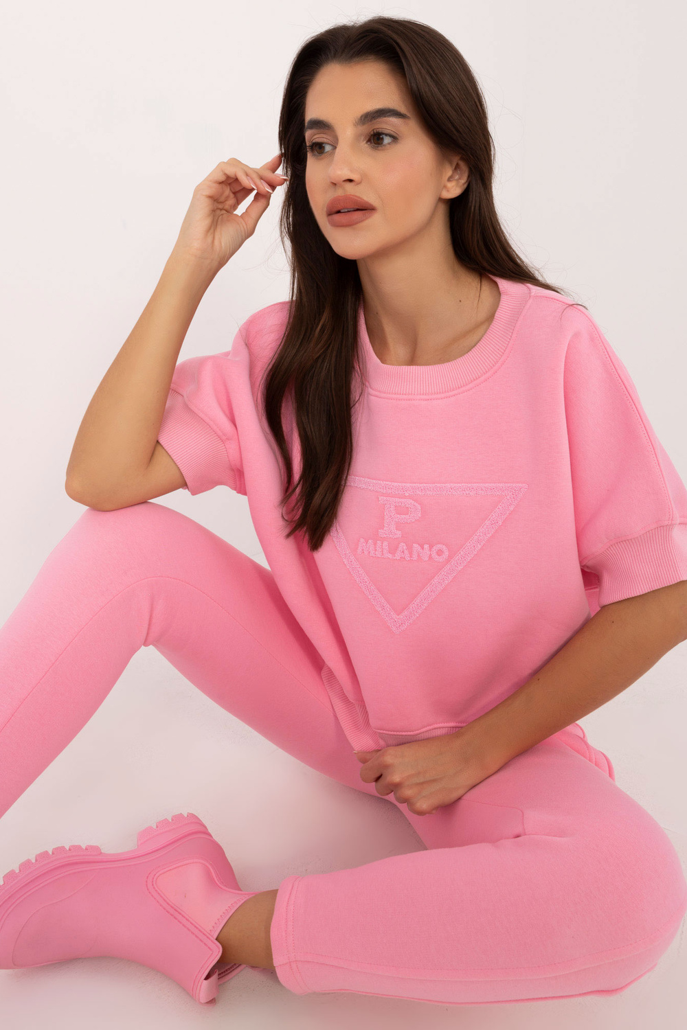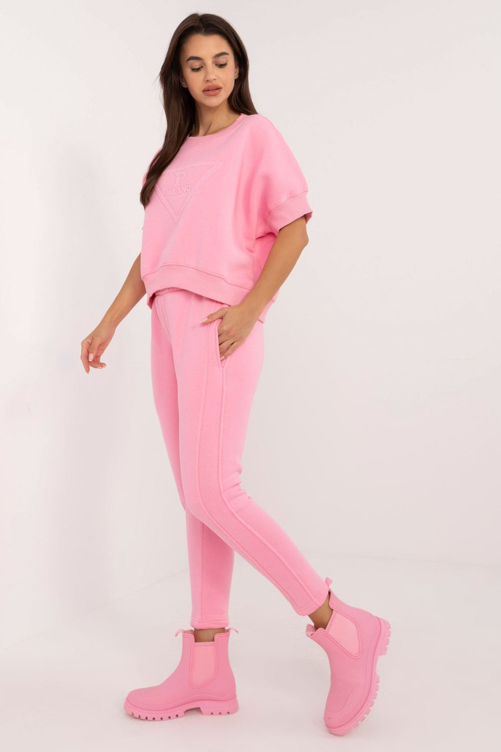 Ühesuuruse komplekti mõõdud tasapinnaliselt mõõdetuna: dressipluusi laius kaenla alt - 72 cm, dressipluusi pikkus - 56 cm, pükste laius vööst - 38 cm, vöö kõrgus - 34 cm, pikkus püksid - 97 cm.