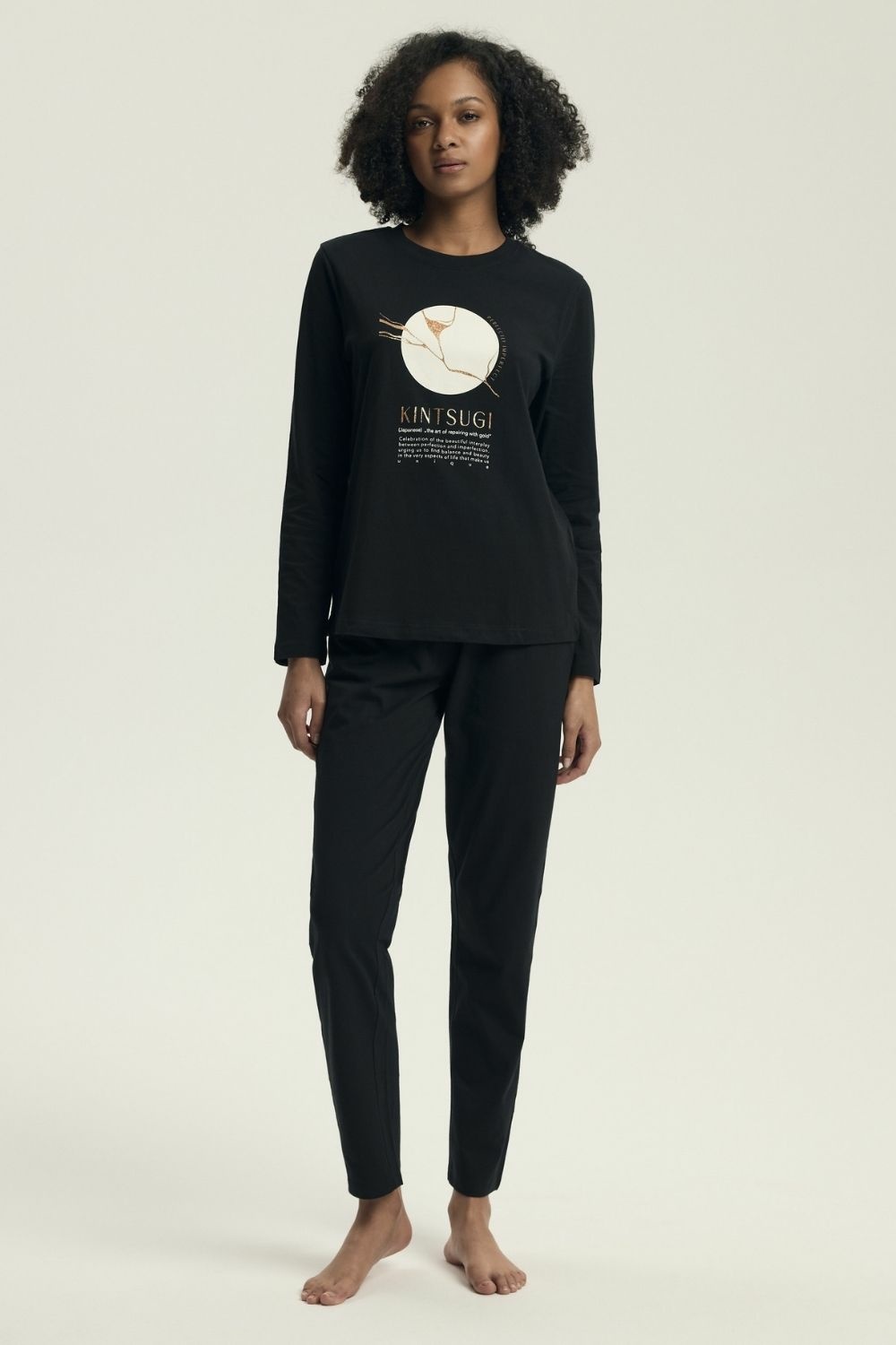 Comfortable women's pajamas with a classic cut, perfect for sleeping and relaxing at home. The long-sleeved pluus with a round neckline is decorated with a slogan that adds a modern, feminine character to the whole outfit. The long pants with a wide elastic waistband guarantee comfort and a perfect fit. The set is packed in a plastic bag, making it also perfect as a practical gift.