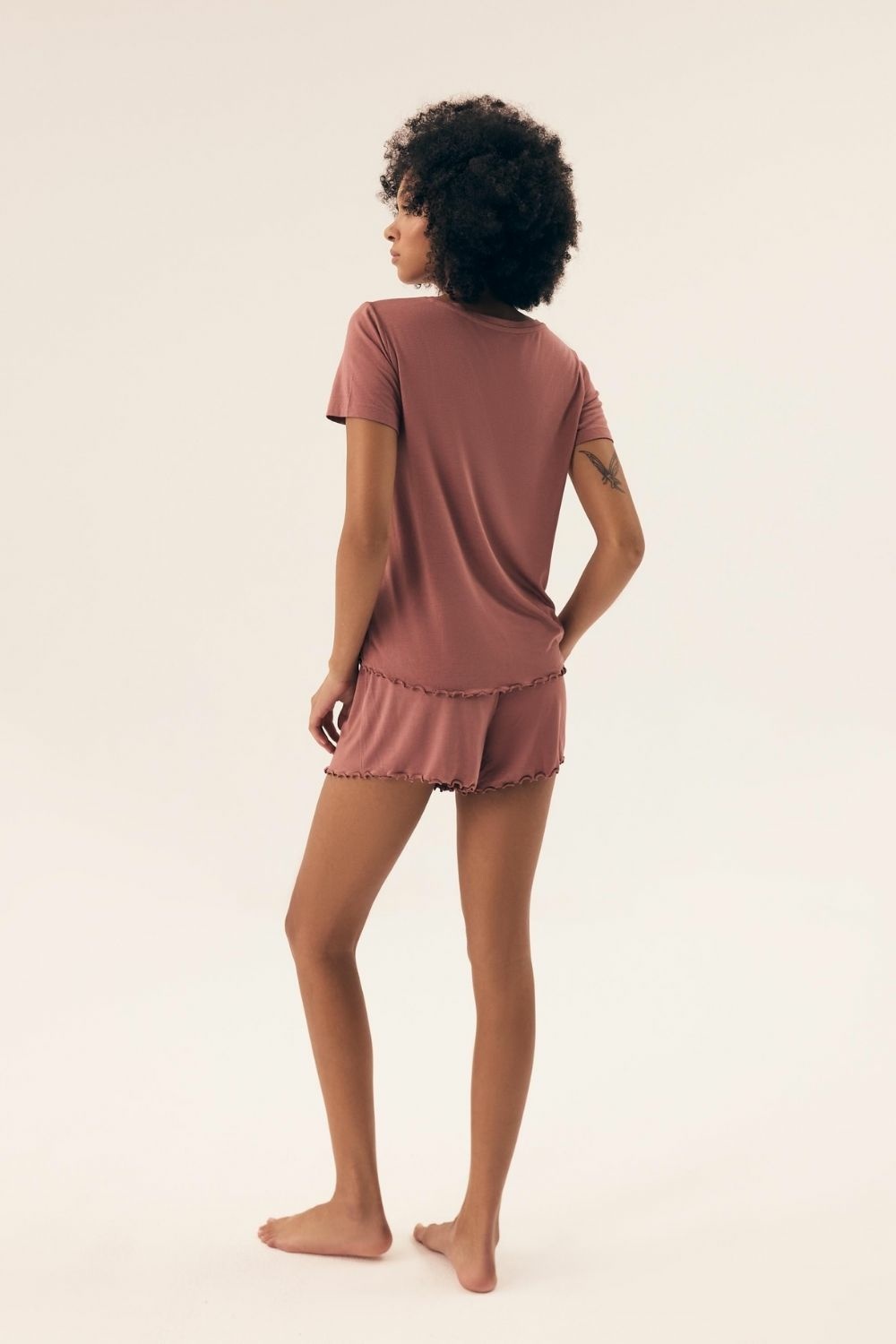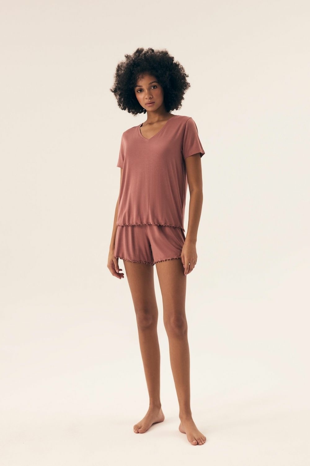 Stylish women's pajamas made of delicate Viskoos, providing comfortable sleep throughout the night. The short-sleeved top with a V-neckline, decorated with subtle lace at the bottom, perfectly complements the short shorts, which have a wide elastic waistband for even greater comfort. The smooth Materjal: makes the pajamas pleasant to the touch, perfect for warm nights. The product is packed in a practical plastic bag, also excellent as a gift.
