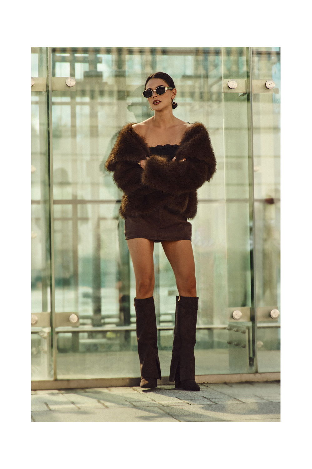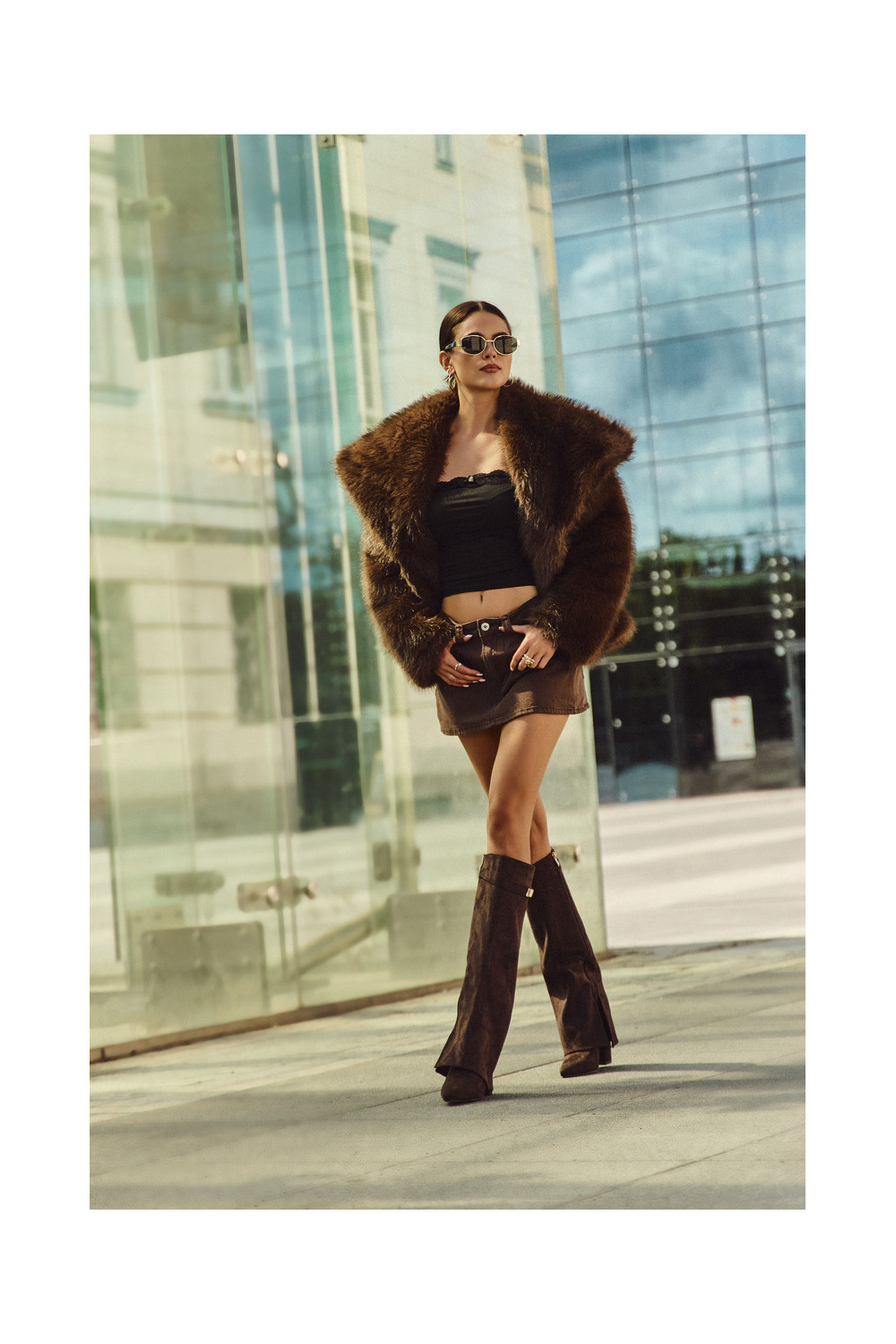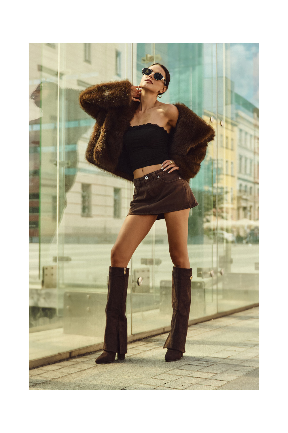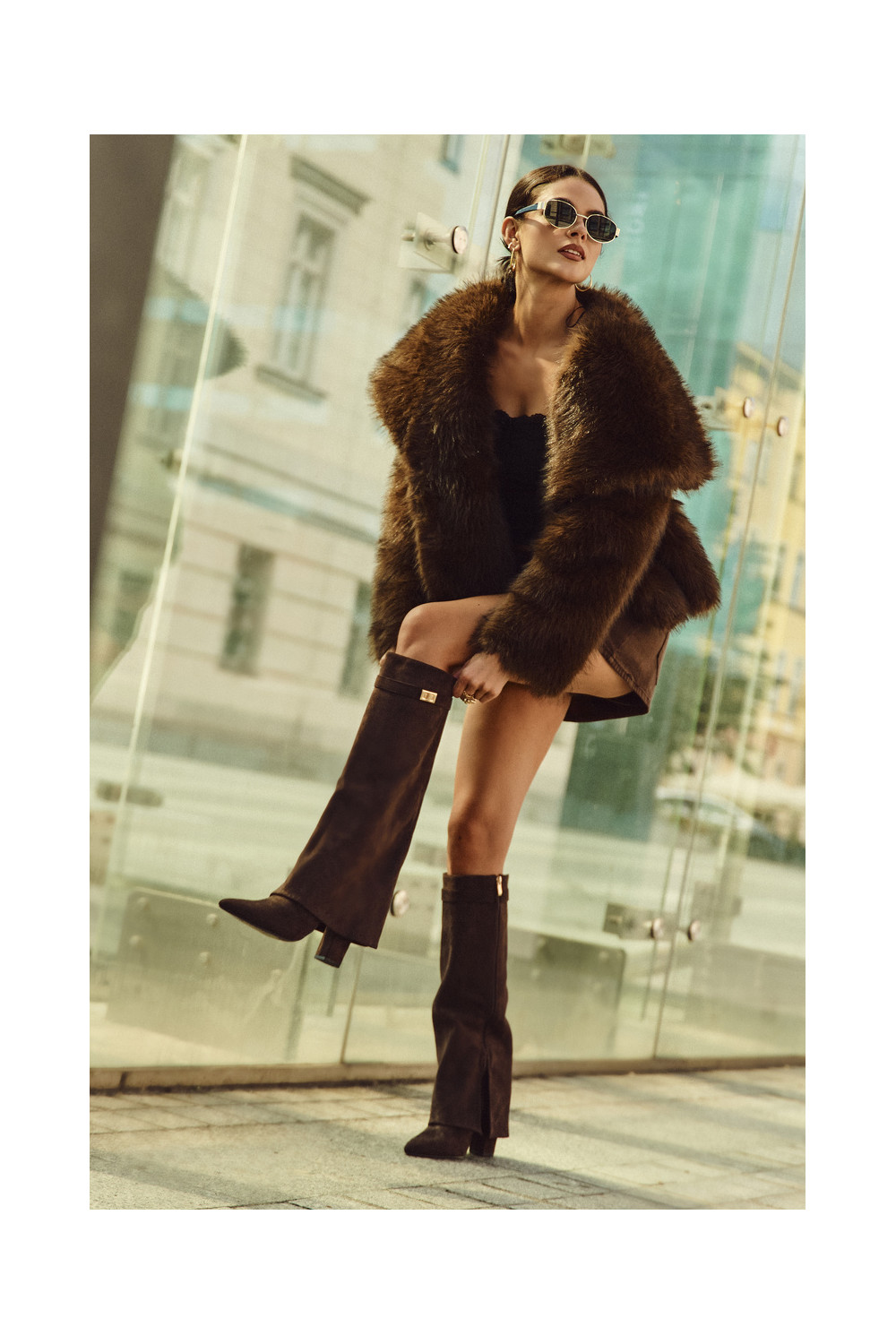 Naiste pikad eko-seemisnahast saapad, plokk-kontsaga, vooderdatud, kaunistatud sääreosaga, šokolaadipruunid Evyra