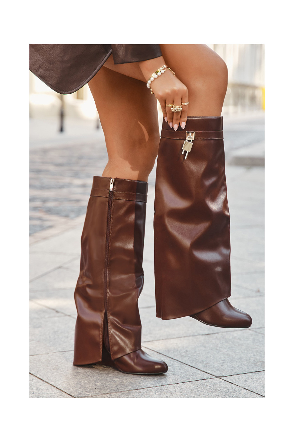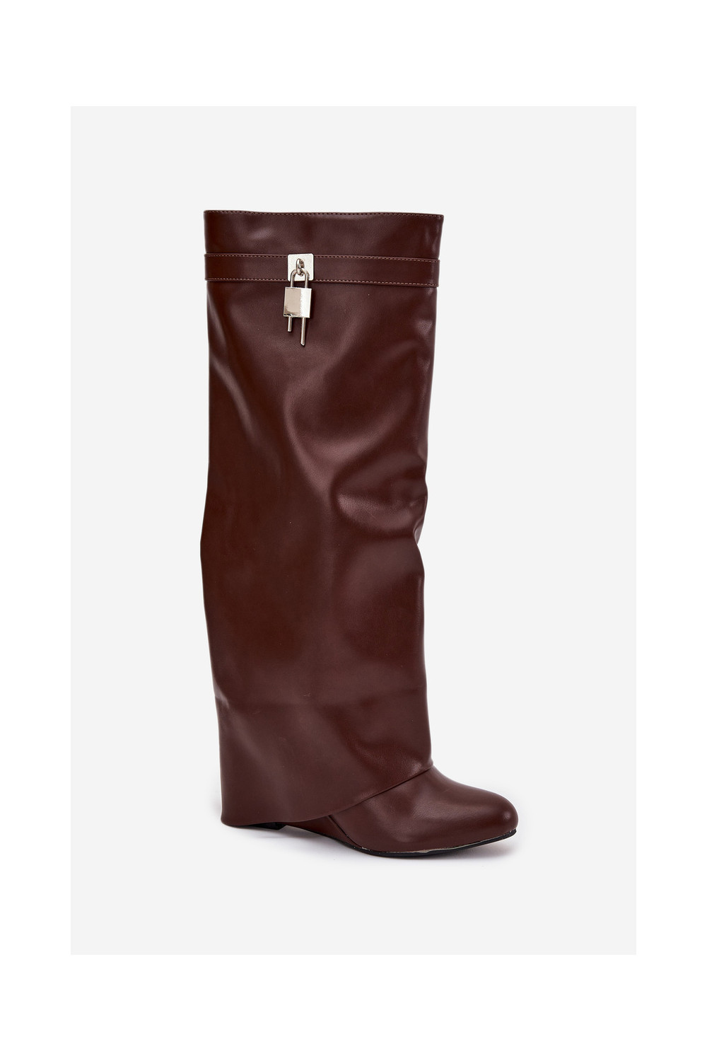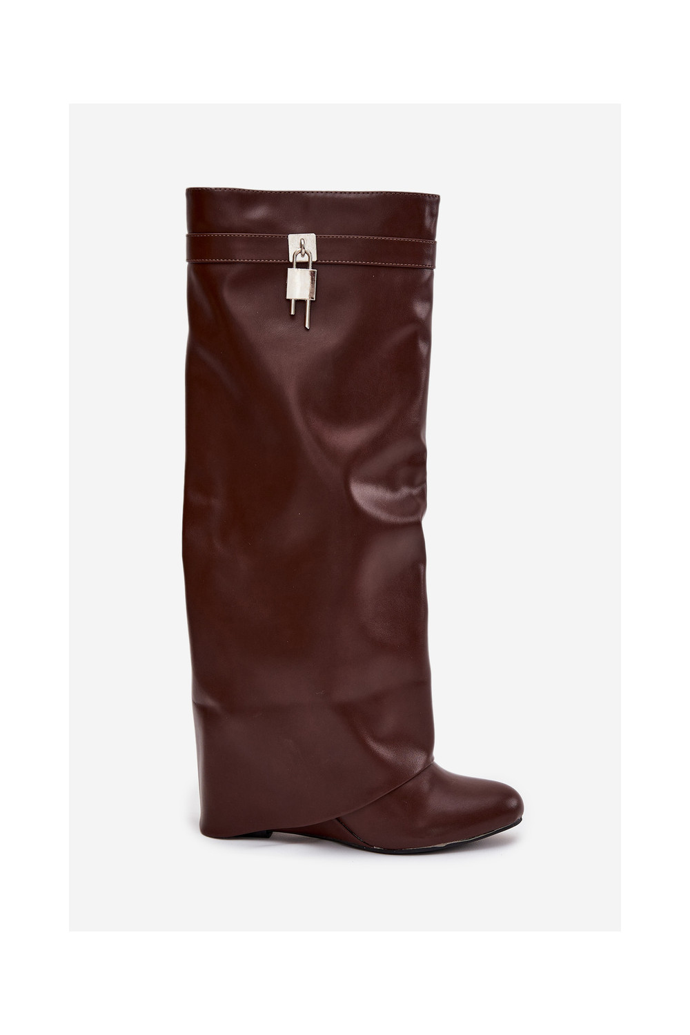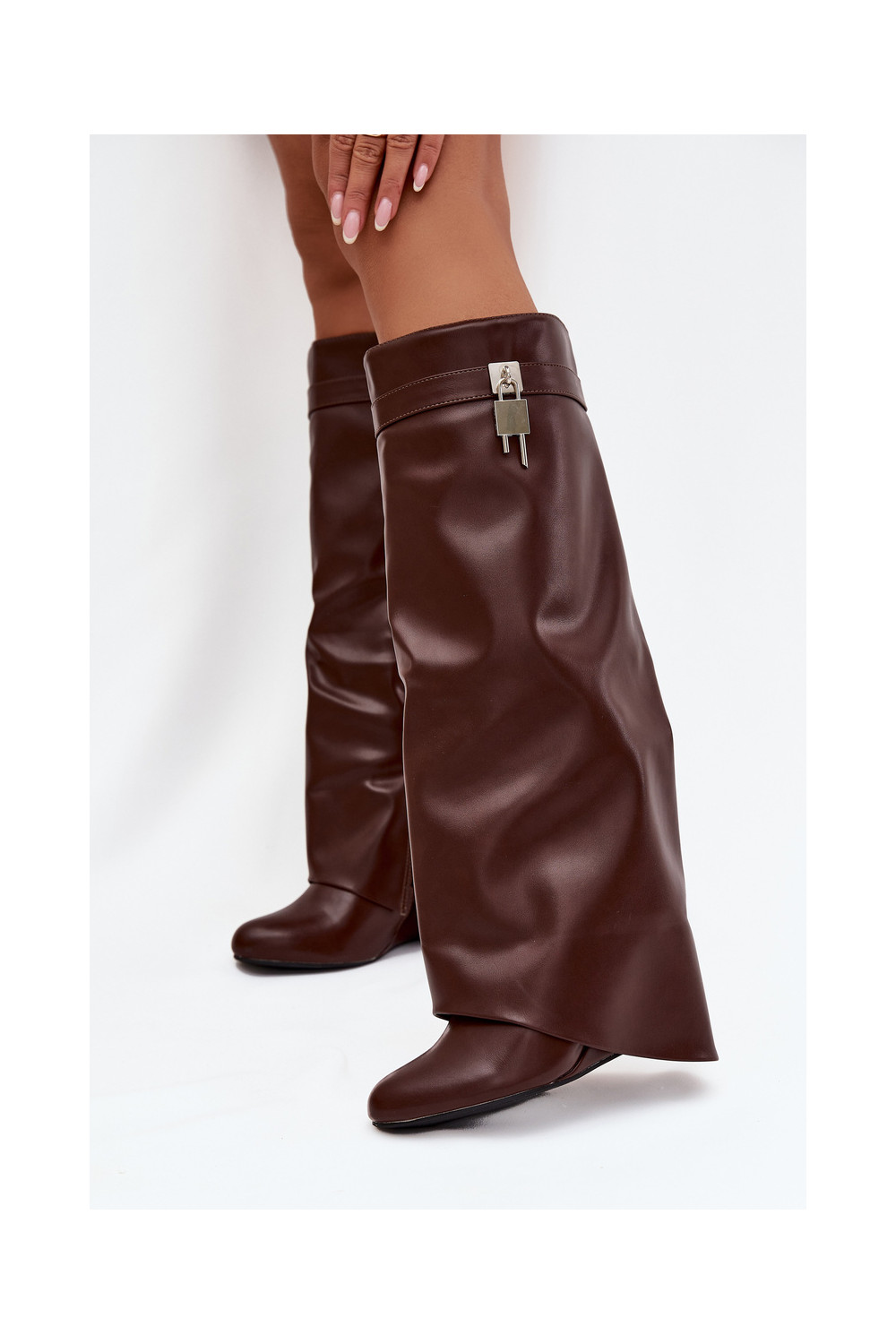 Naiste pikkade saapad platvormiga rihmade ja hõbedaste detailidega eko nahast pruuni värvi Korivelle