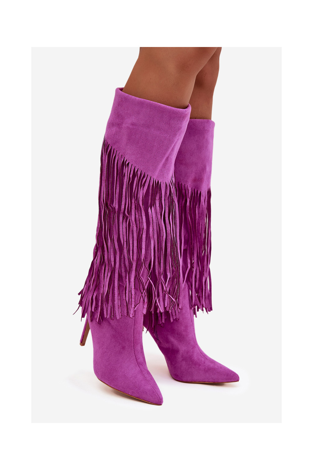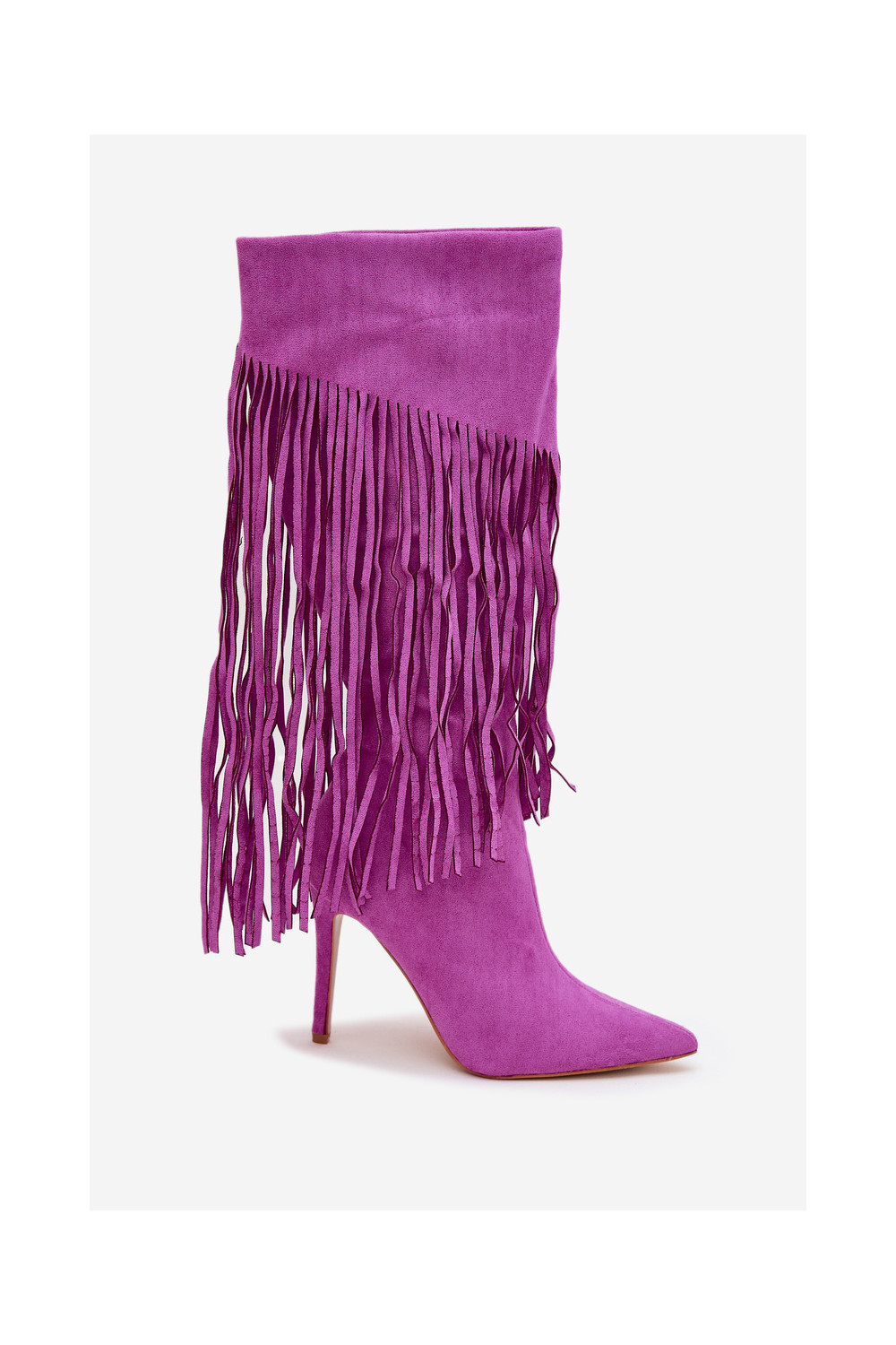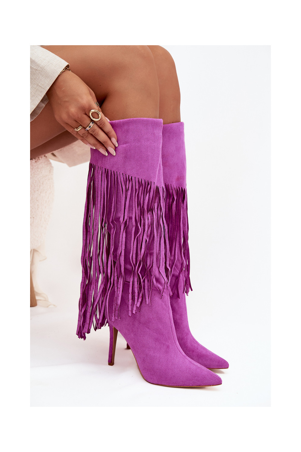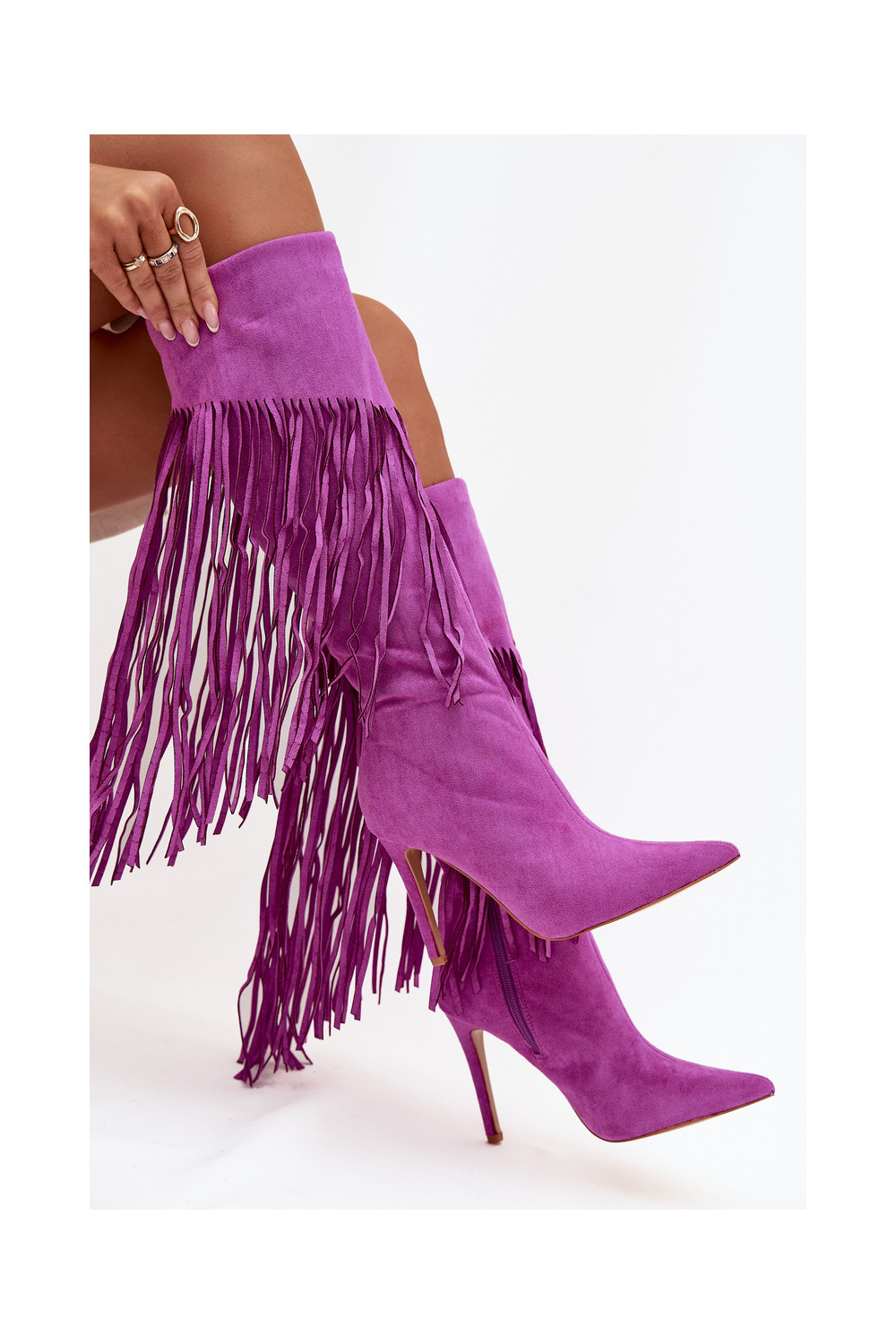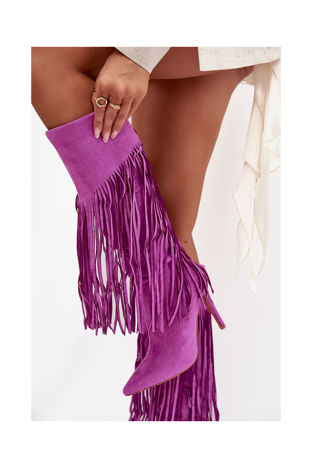 Naiste pikad saapad õhukeste kontsadega ja tutidega lilla värvitoonis Isalune