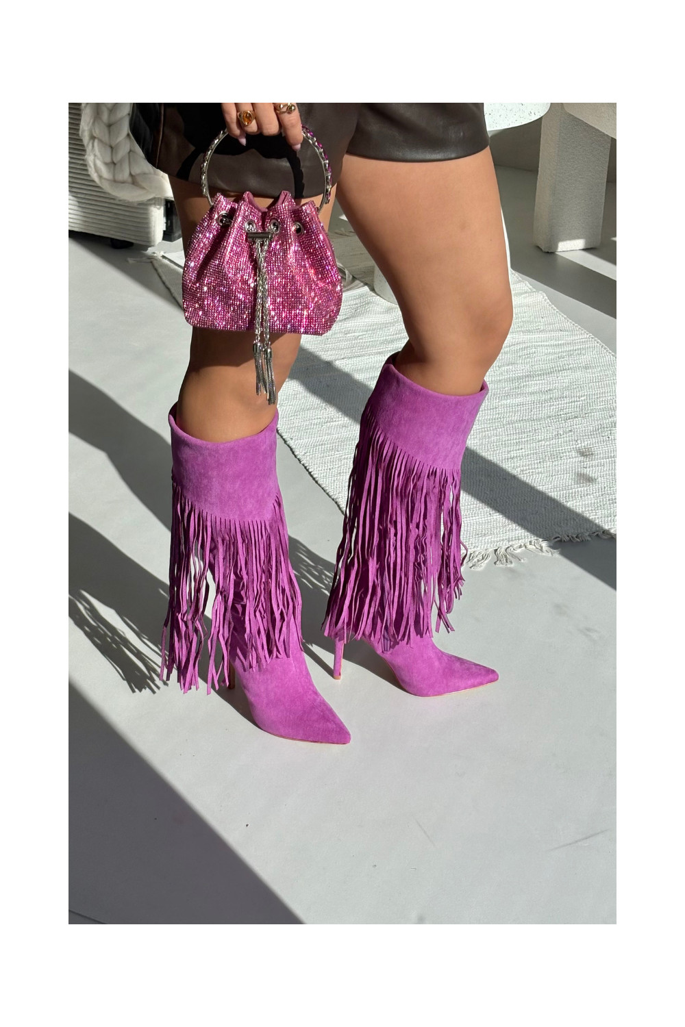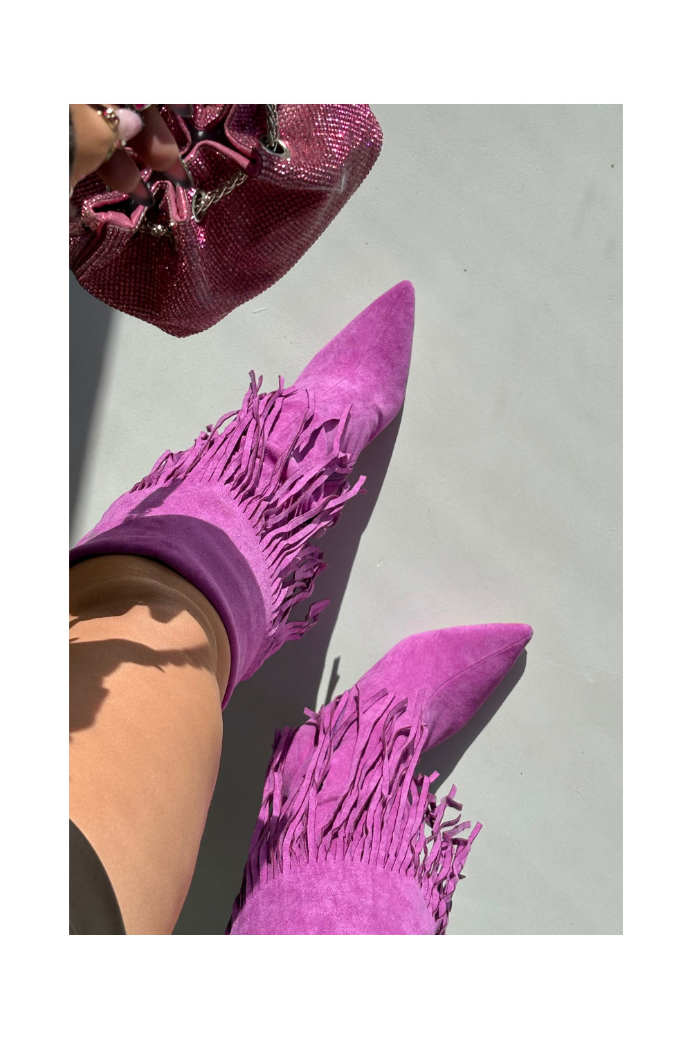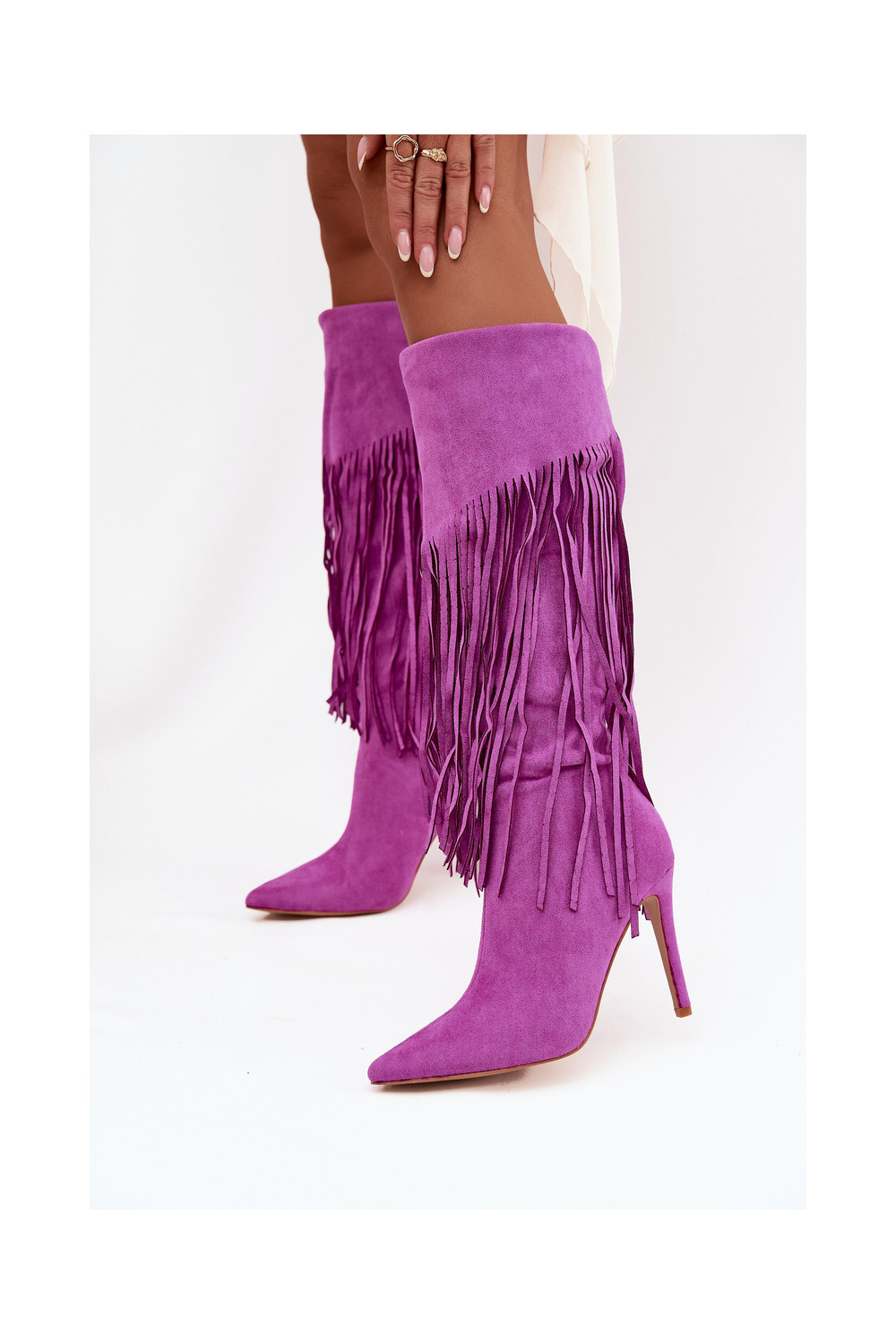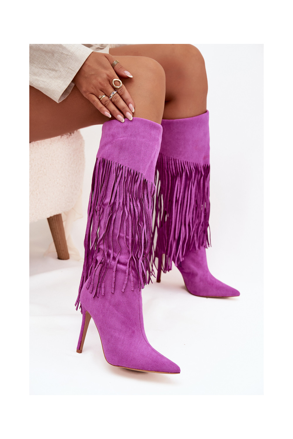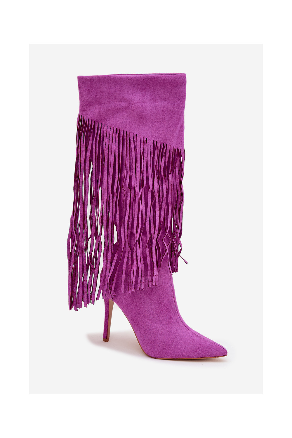 Naiste pikad saapad õhukeste kontsadega ja tutidega lilla värvitoonis Isalune