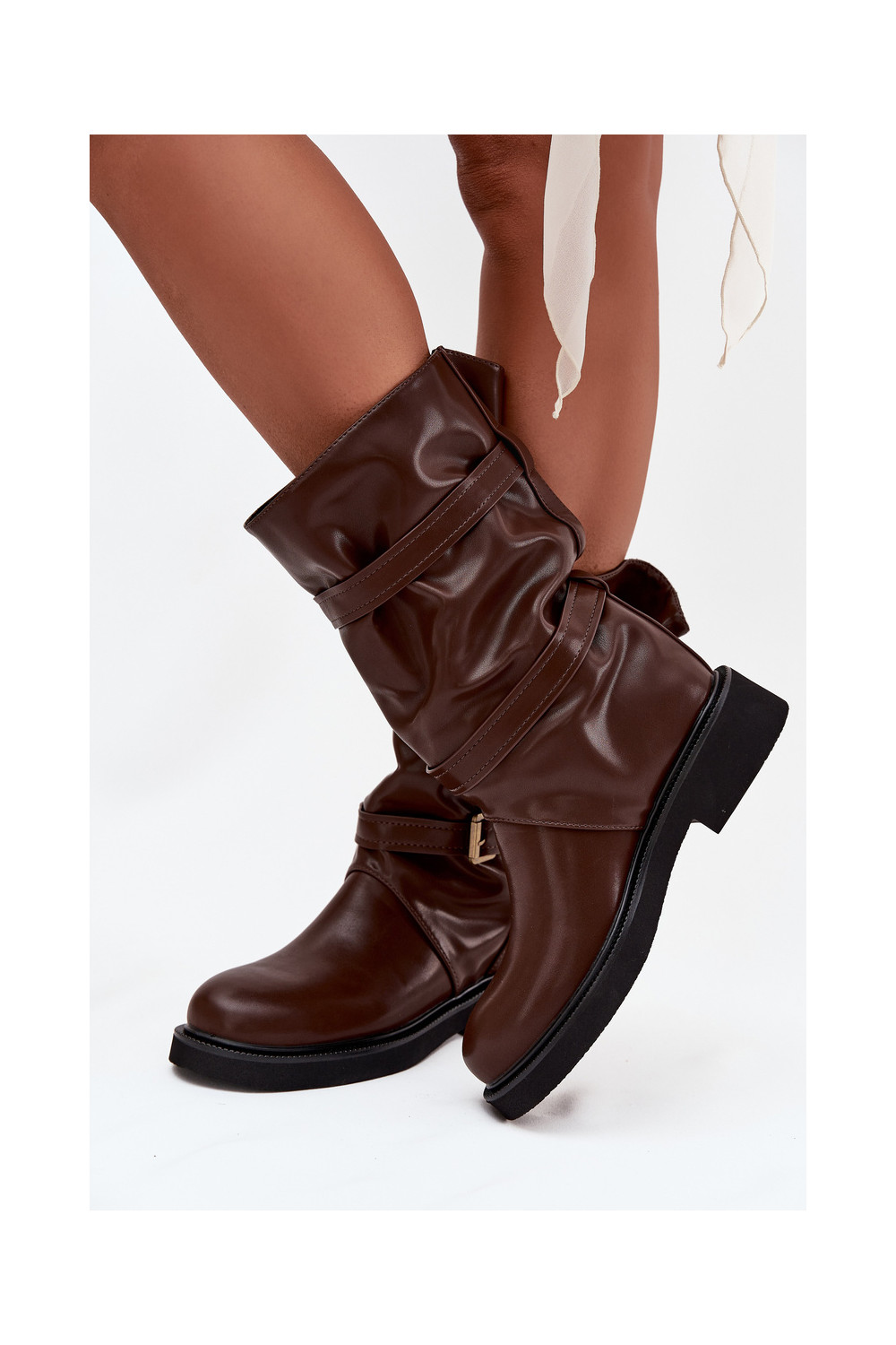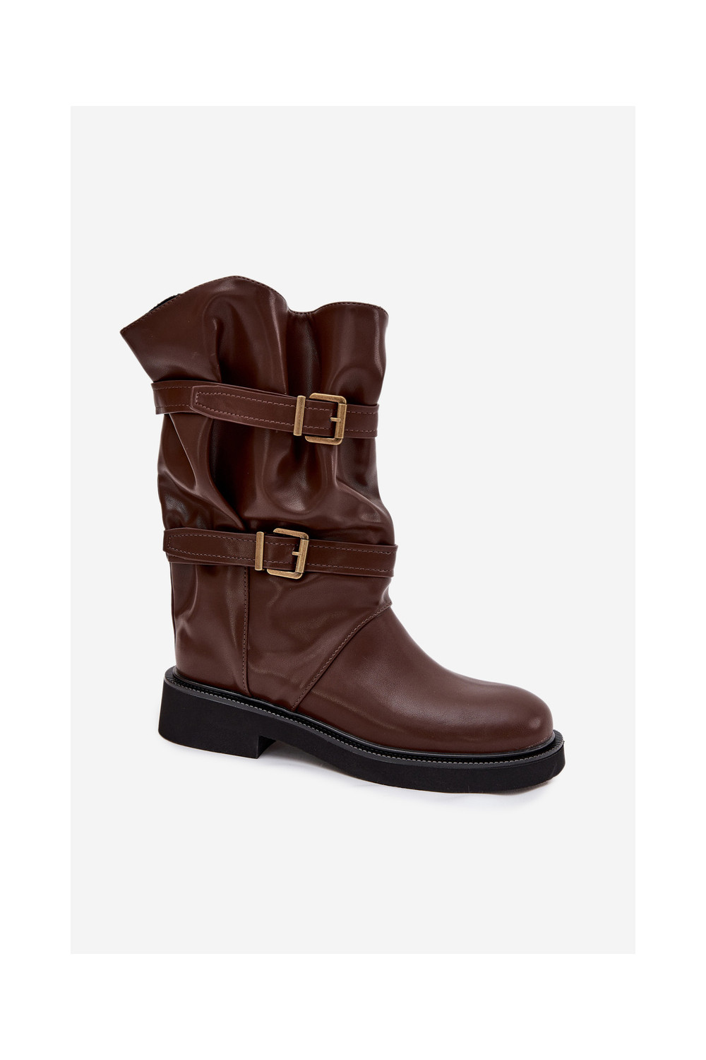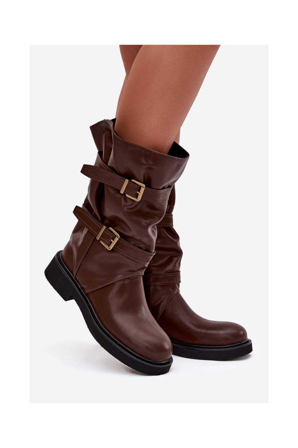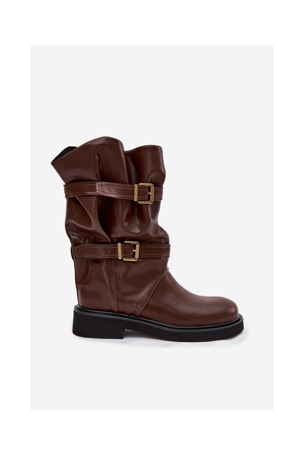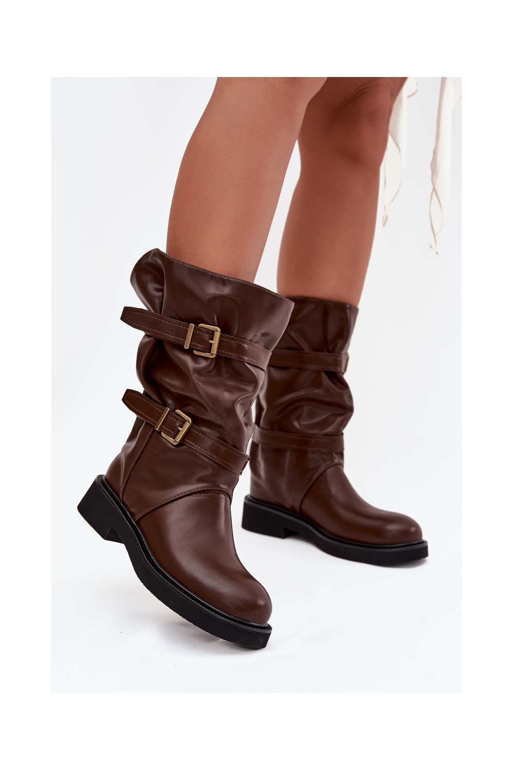 Halvessa pruunid pikad saapad sääre keskosani rihmade ja pandlitega