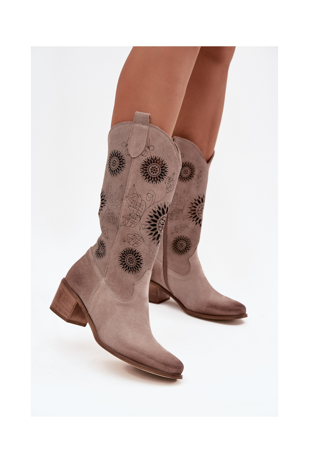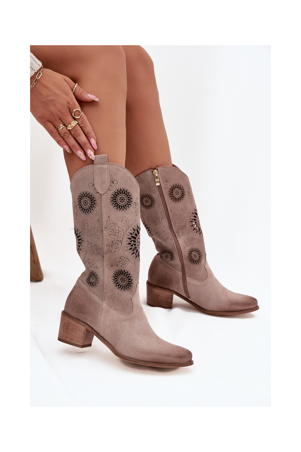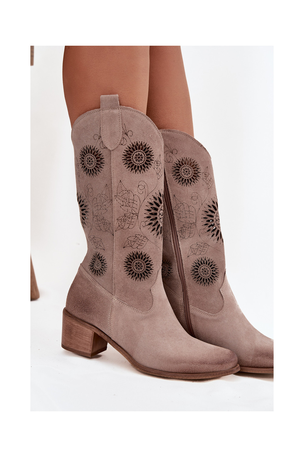 Naiste sametist pikad saapad pitsilise detailiga Zazoo 3852 kaputsino värvi