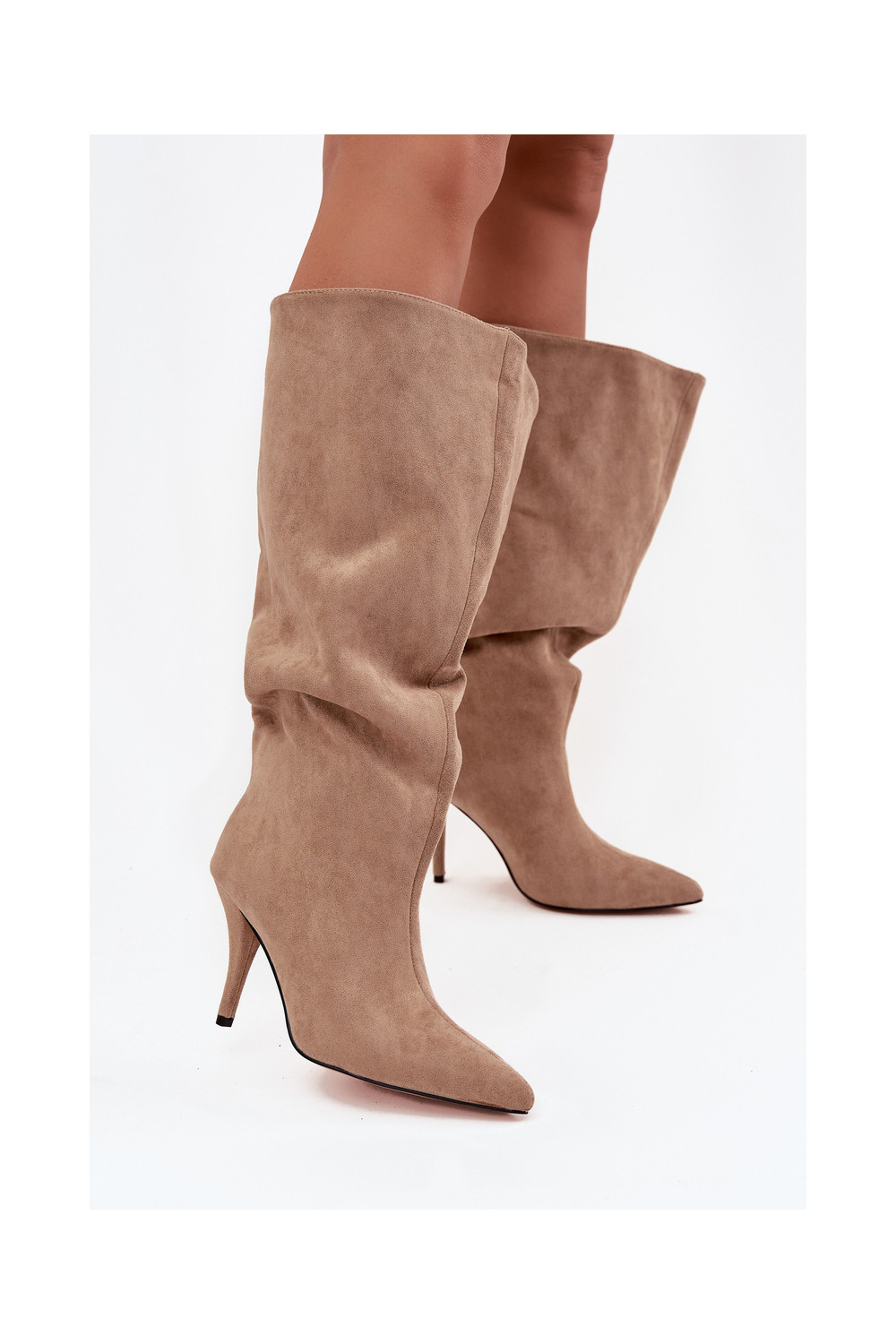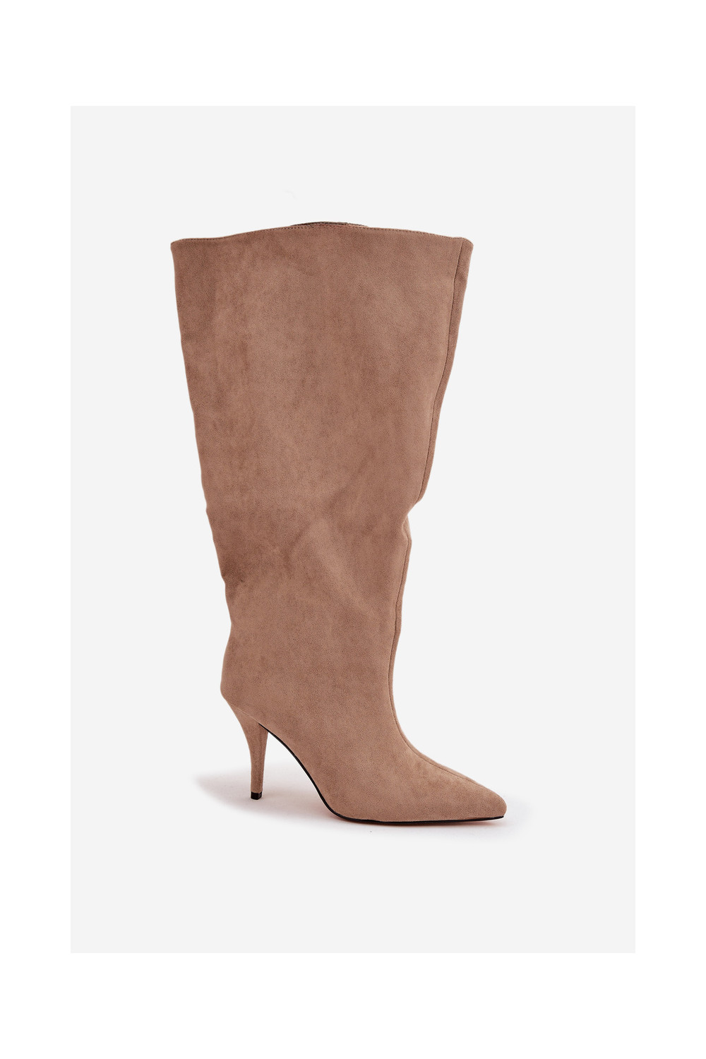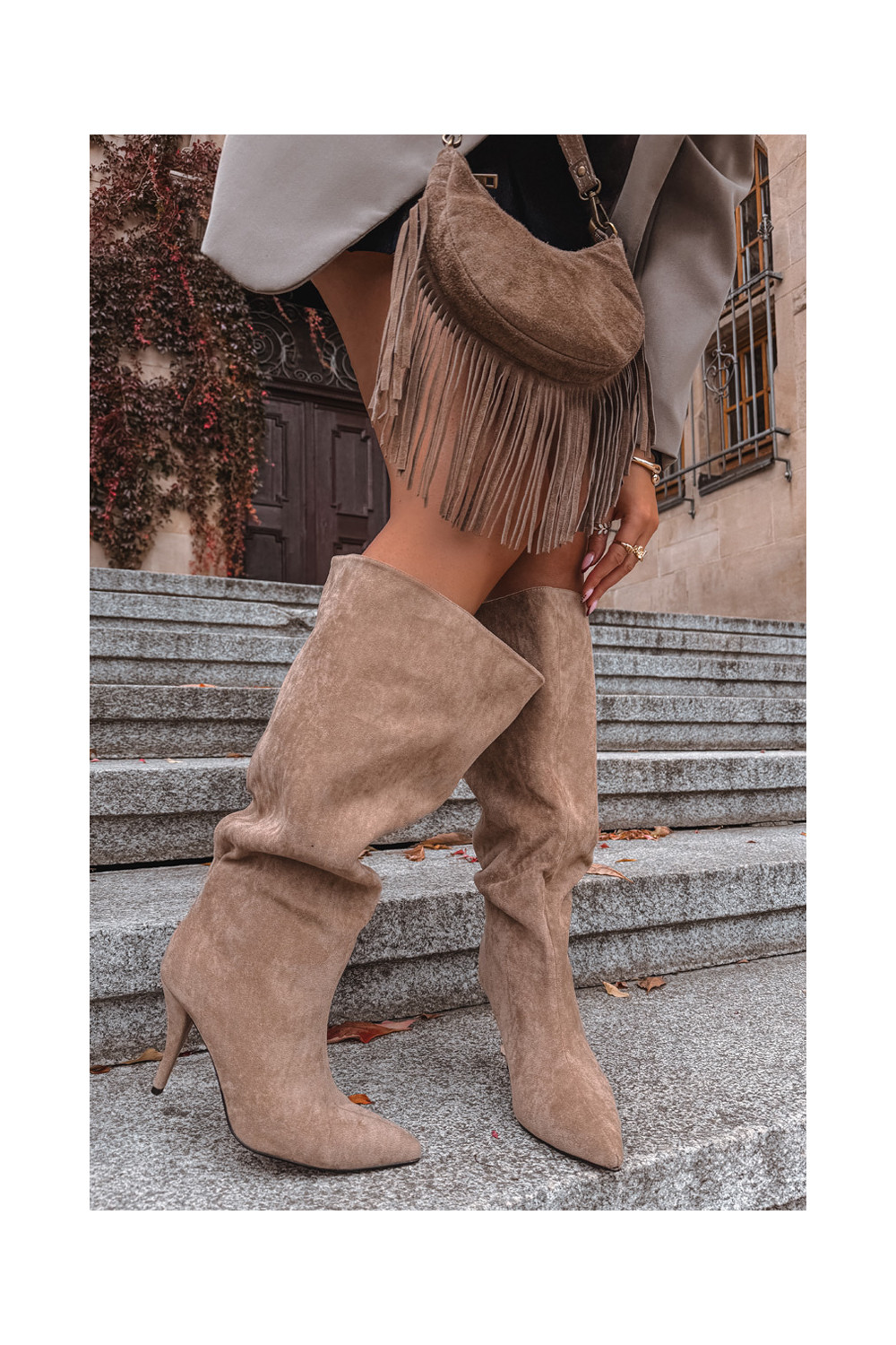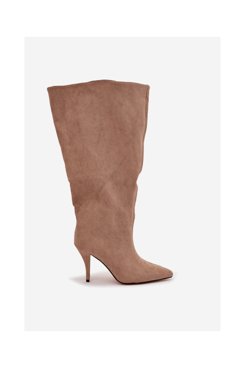 Slip-on naiste pika säärega saapad kõrge jämeda kontsagaEco Suedeu beeži värvi Noretta