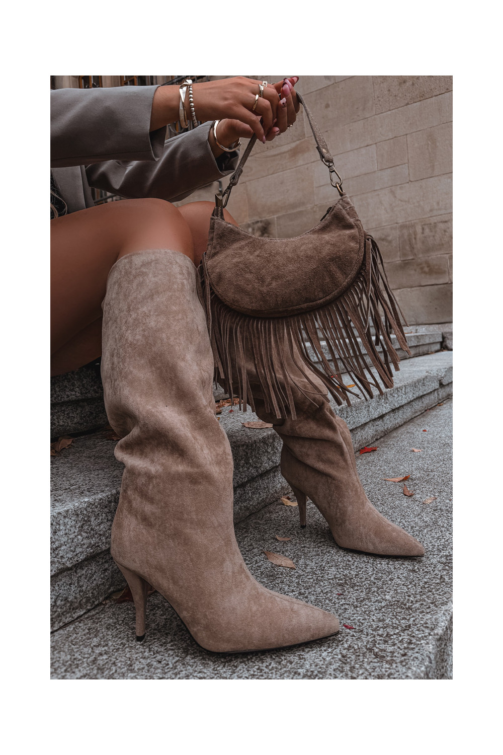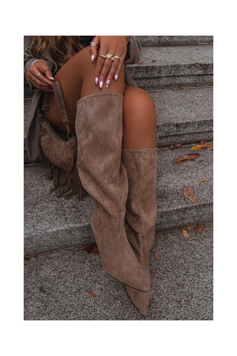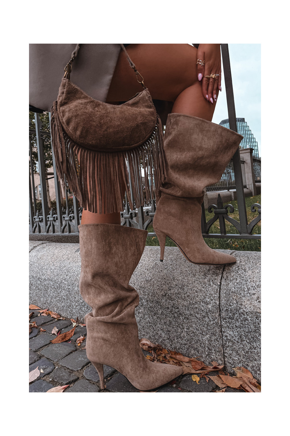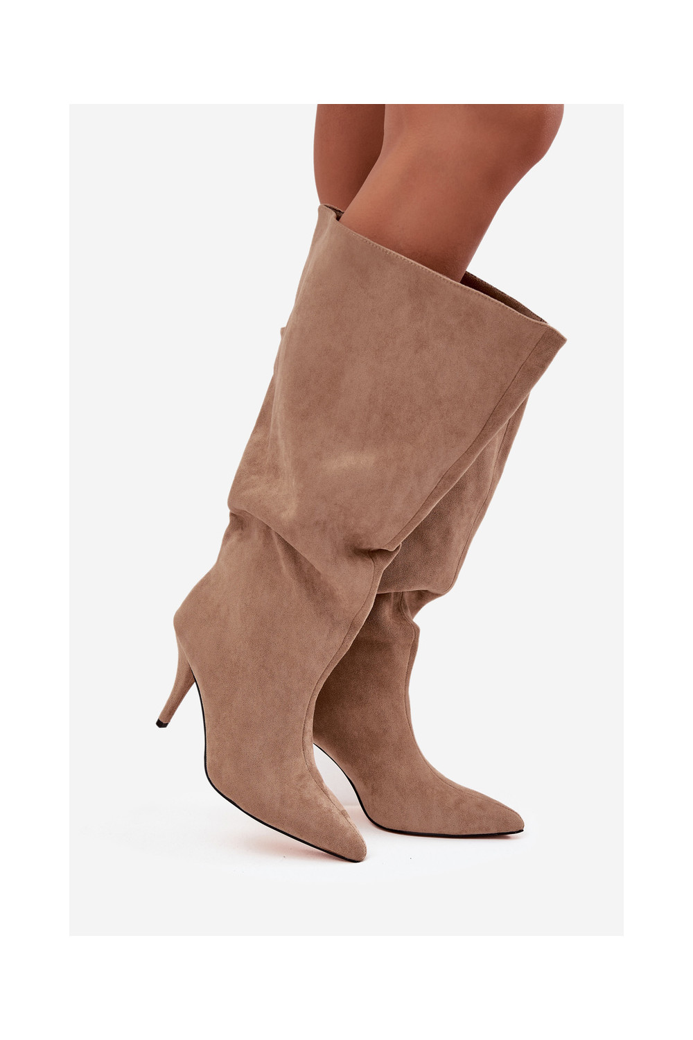 Slip-on naiste pika säärega saapad kõrge jämeda kontsagaEco Suedeu beeži värvi Noretta