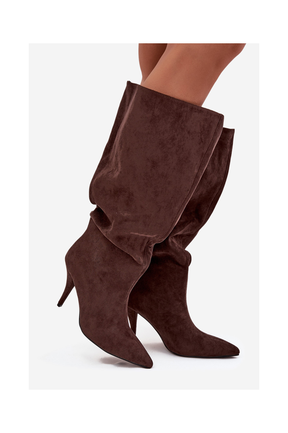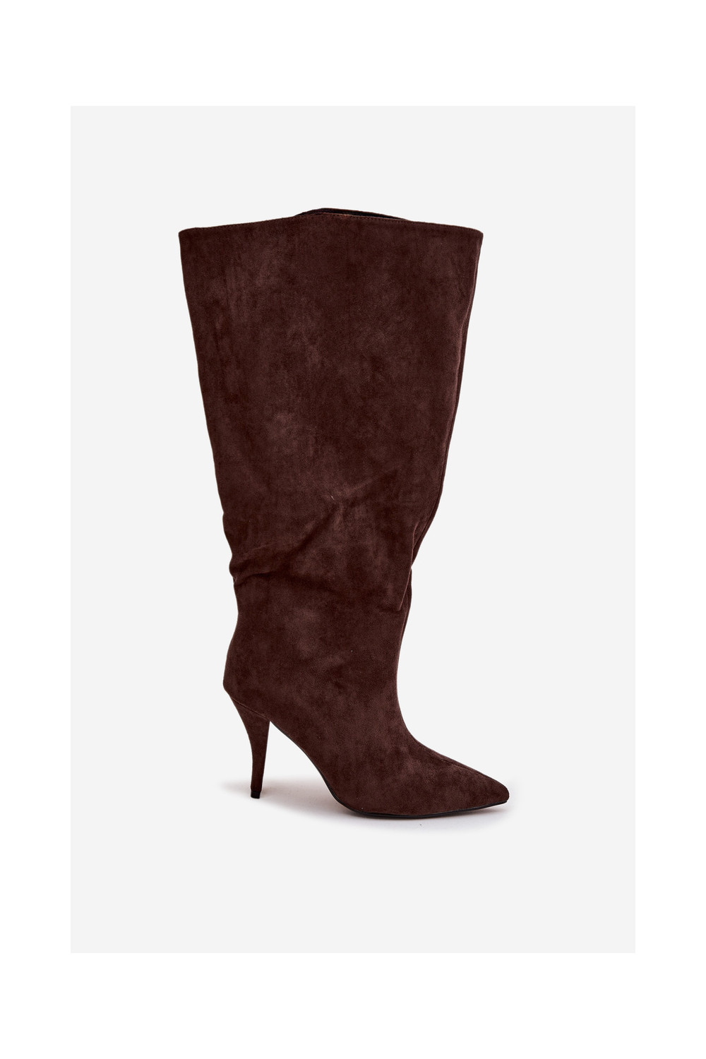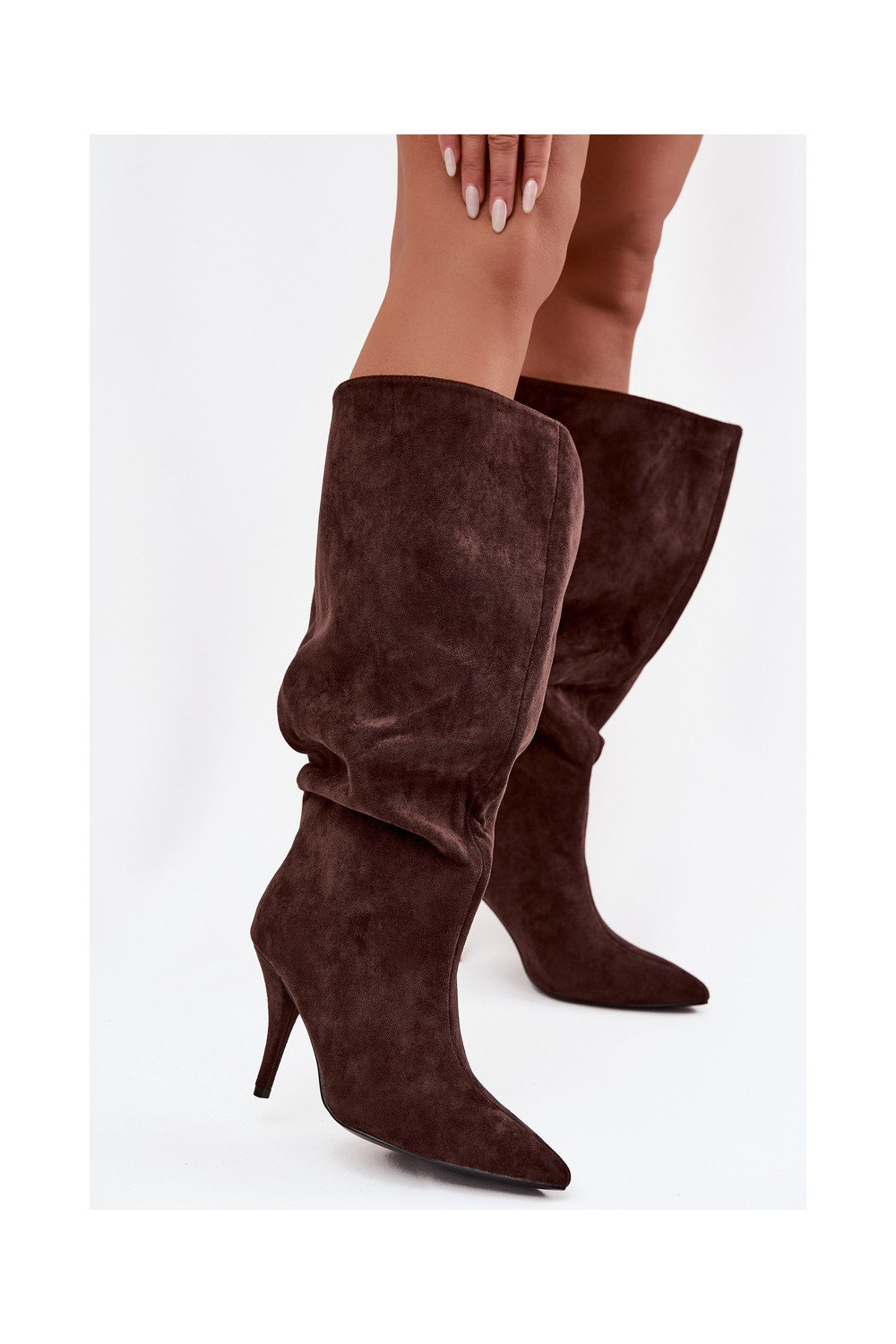 Slip-on naiste pika säärega saapad kõrge jämeda kontsagaEco Suedeu Czekoladosissee Noretta