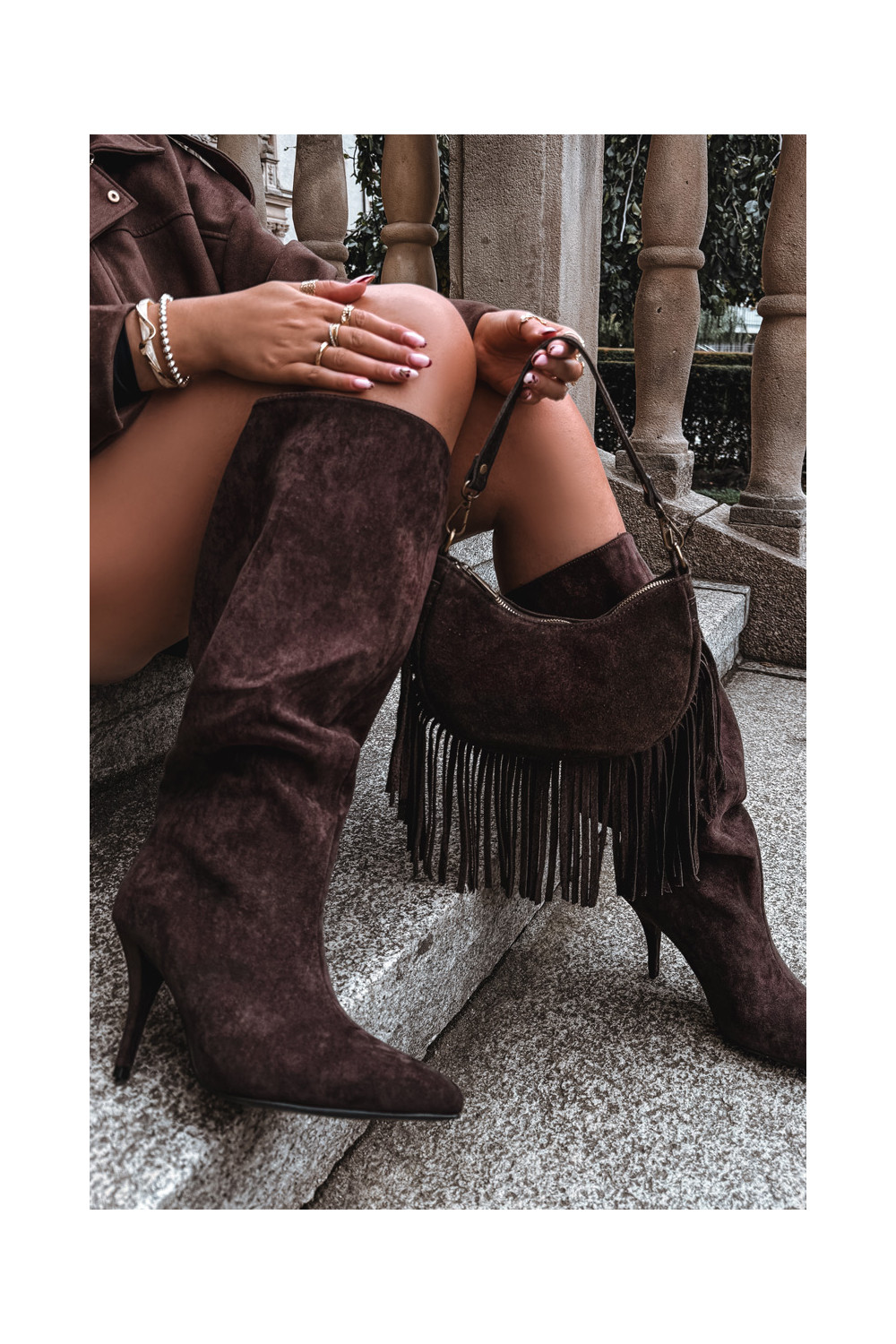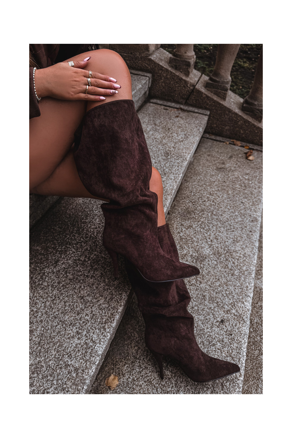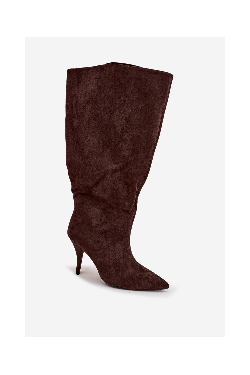 Slip-on naiste pika säärega saapad kõrge jämeda kontsagaEco Suedeu Czekoladosissee Noretta