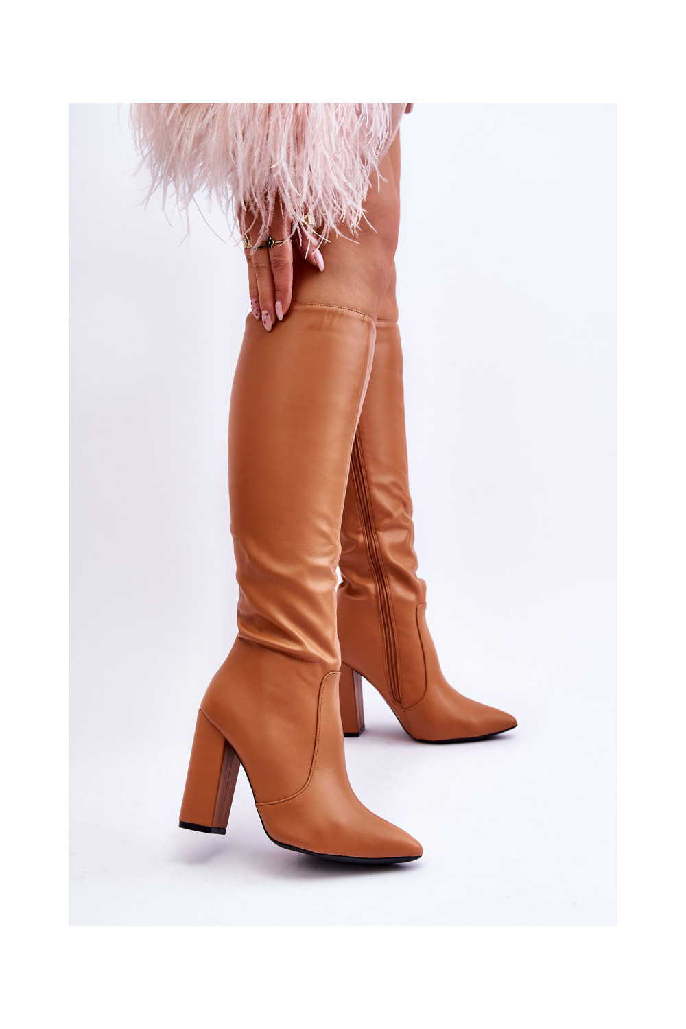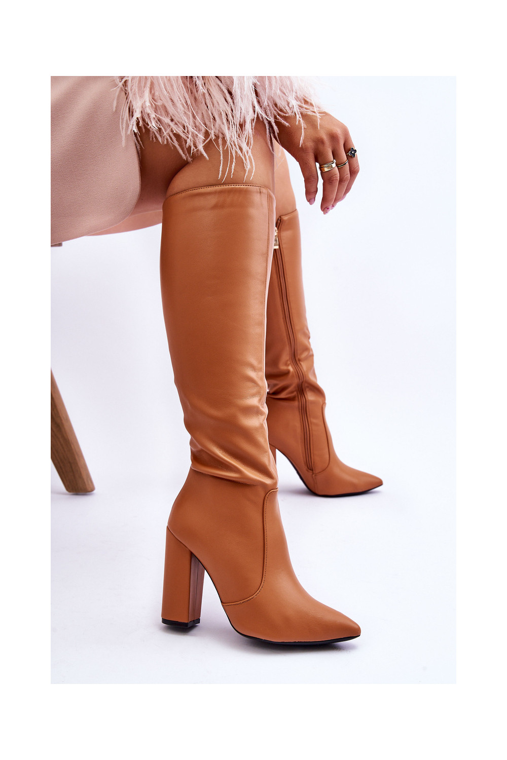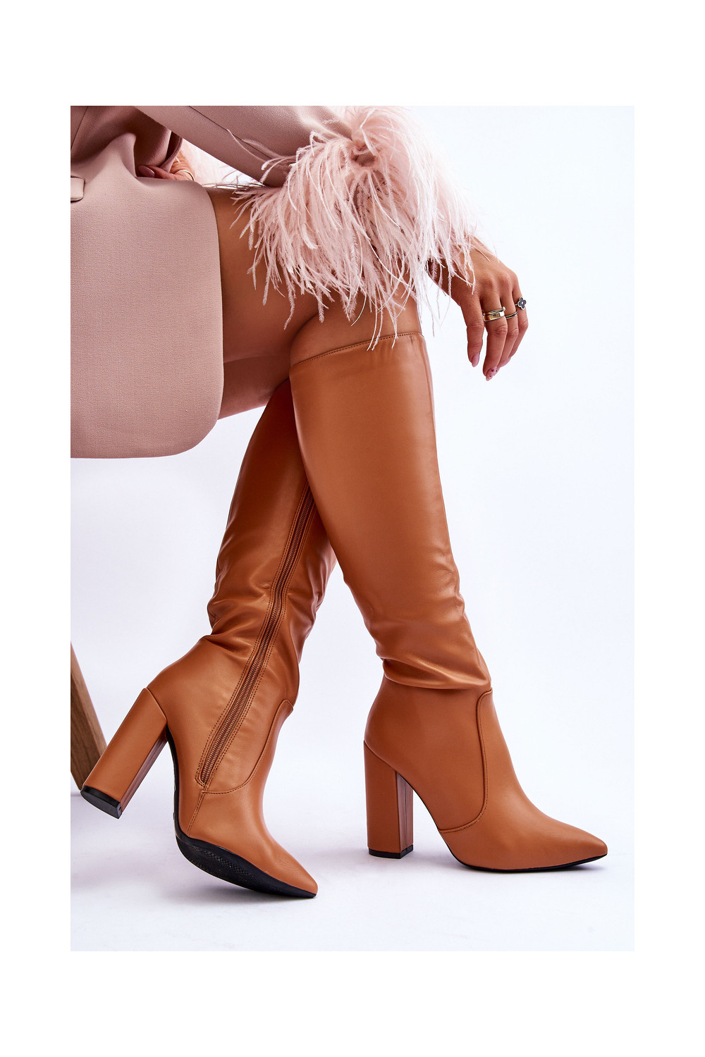 Klassikalise mudeli pika säärega saapad kõrge jämeda kontsaga pruunid värvi Sellel onyra