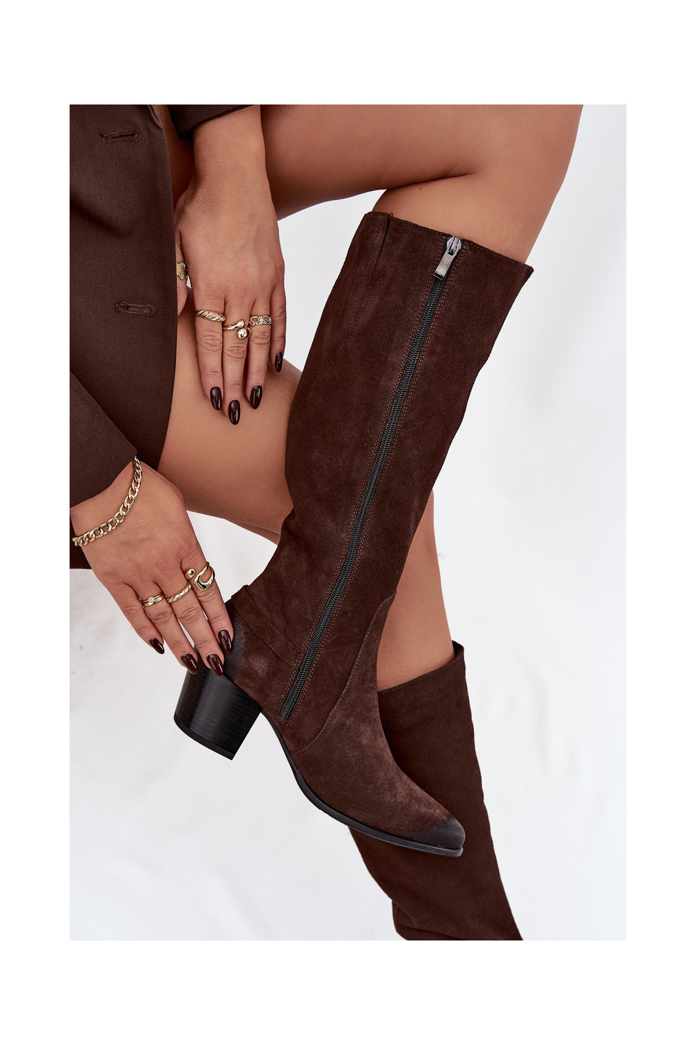Soojendatud šokolaadi värviga seemisnahast kauboistiilis üle põlve saapad "Zazoo 70156"